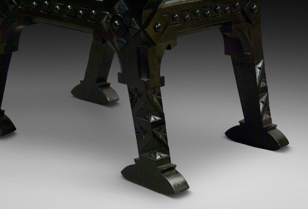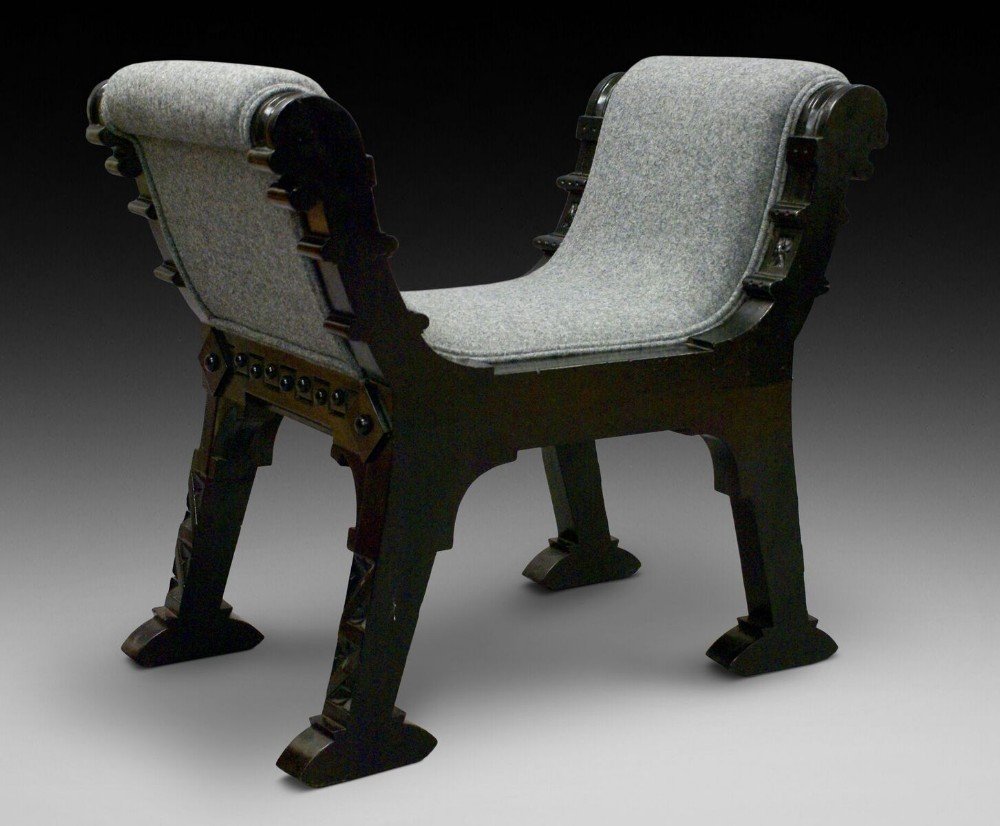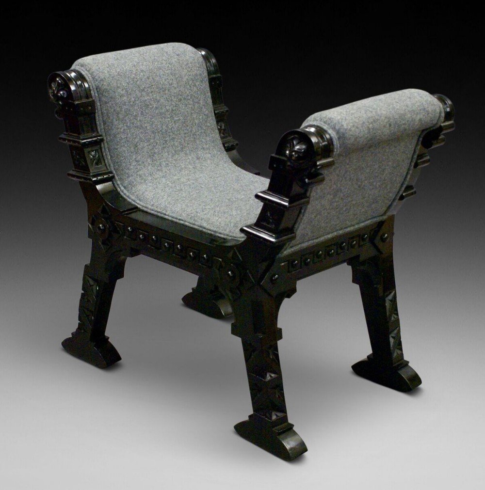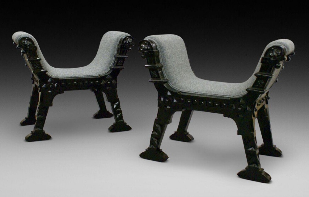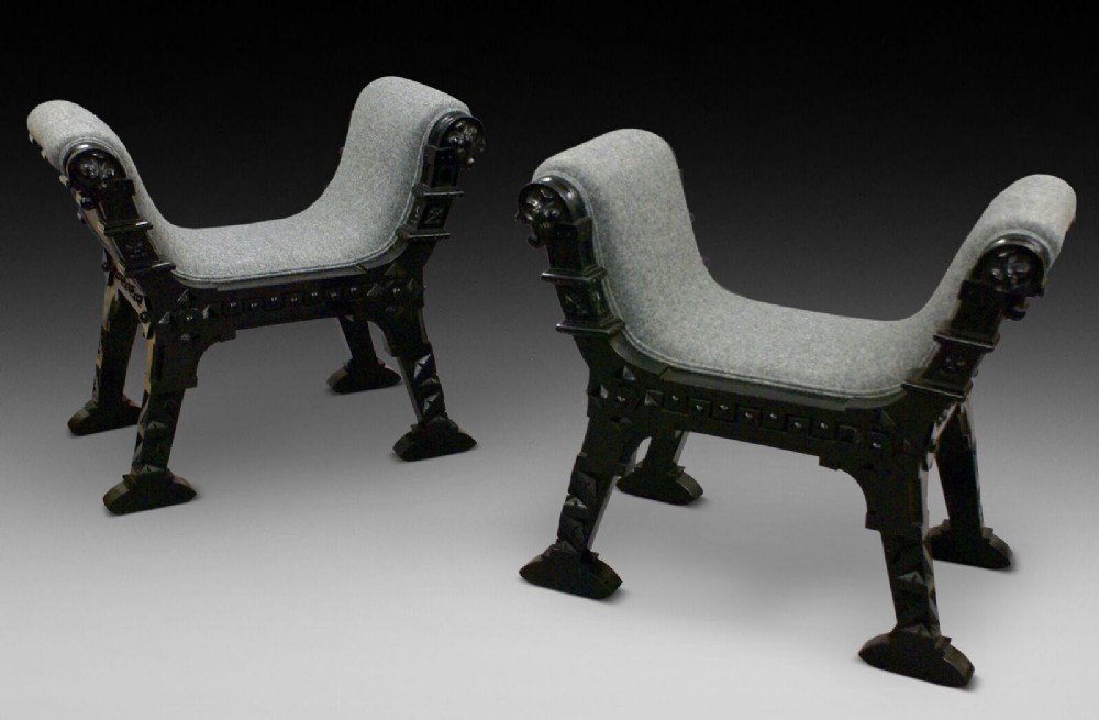 In ebonised hard wood, these stylish and interesting window seats are beautifully made and of strong design. They are in good condition and have been recently re-upholstered in a contemporary wool fabric. 700mm high, 800mm wide, 480mm deep and 440mm seat height. Circa 1890.