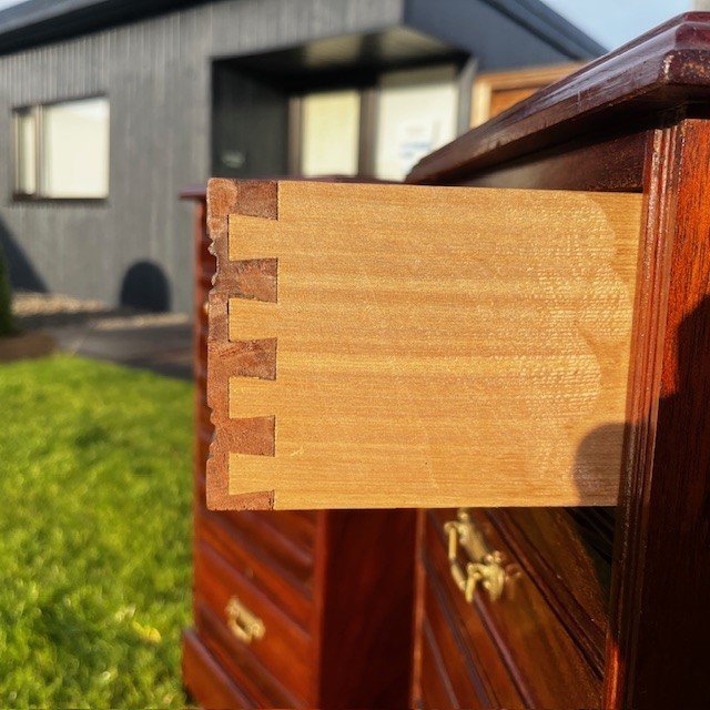 A Pair Of Late Victorian Period Mahogany Bedside Chests. Each constructed in solid mahogany with beautifully figured tops above an arrangement of four graduating ash lined drawers with aesthetic period brass handles. Raised on rectangular plinth bases with solid mahogany sides. English C1890-1900, a superb colour and patination.