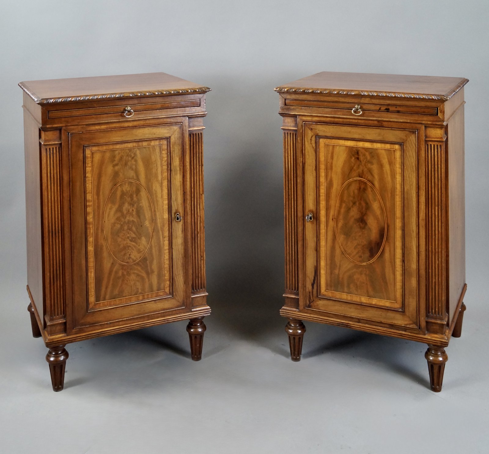 A pair of mahogany bedside cupboards. Raised on turned and fluted feet with cupboards bordered by flat fluted pilasters and with flame mahogany panels with inlaid ovals and satinwood banding. The tops have gadrooned carved molding and brushing slides under. 740mm high, 440mm wide and 390mm deep. English. Circa 1880.