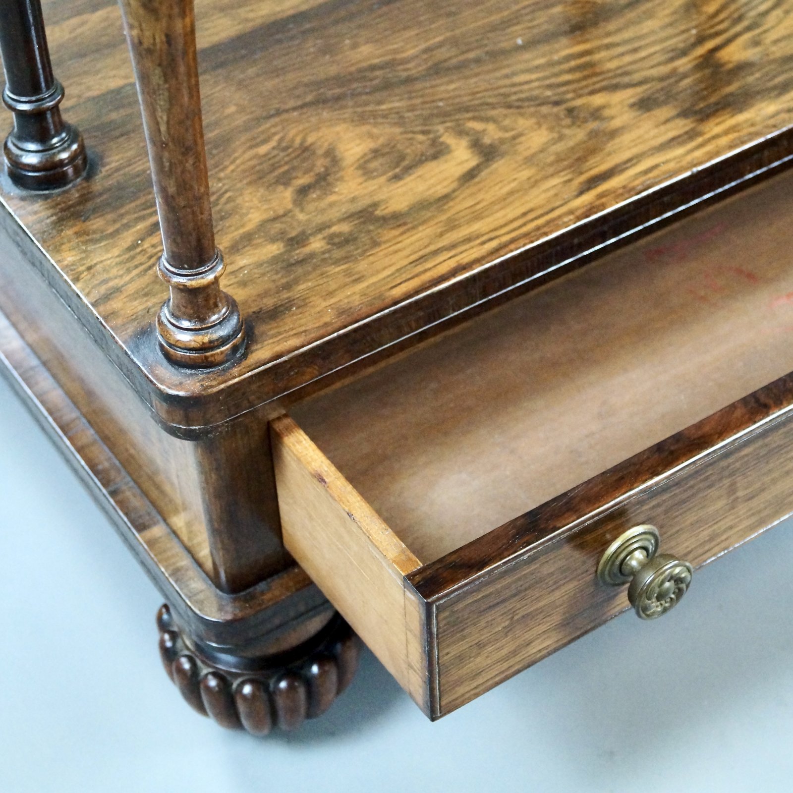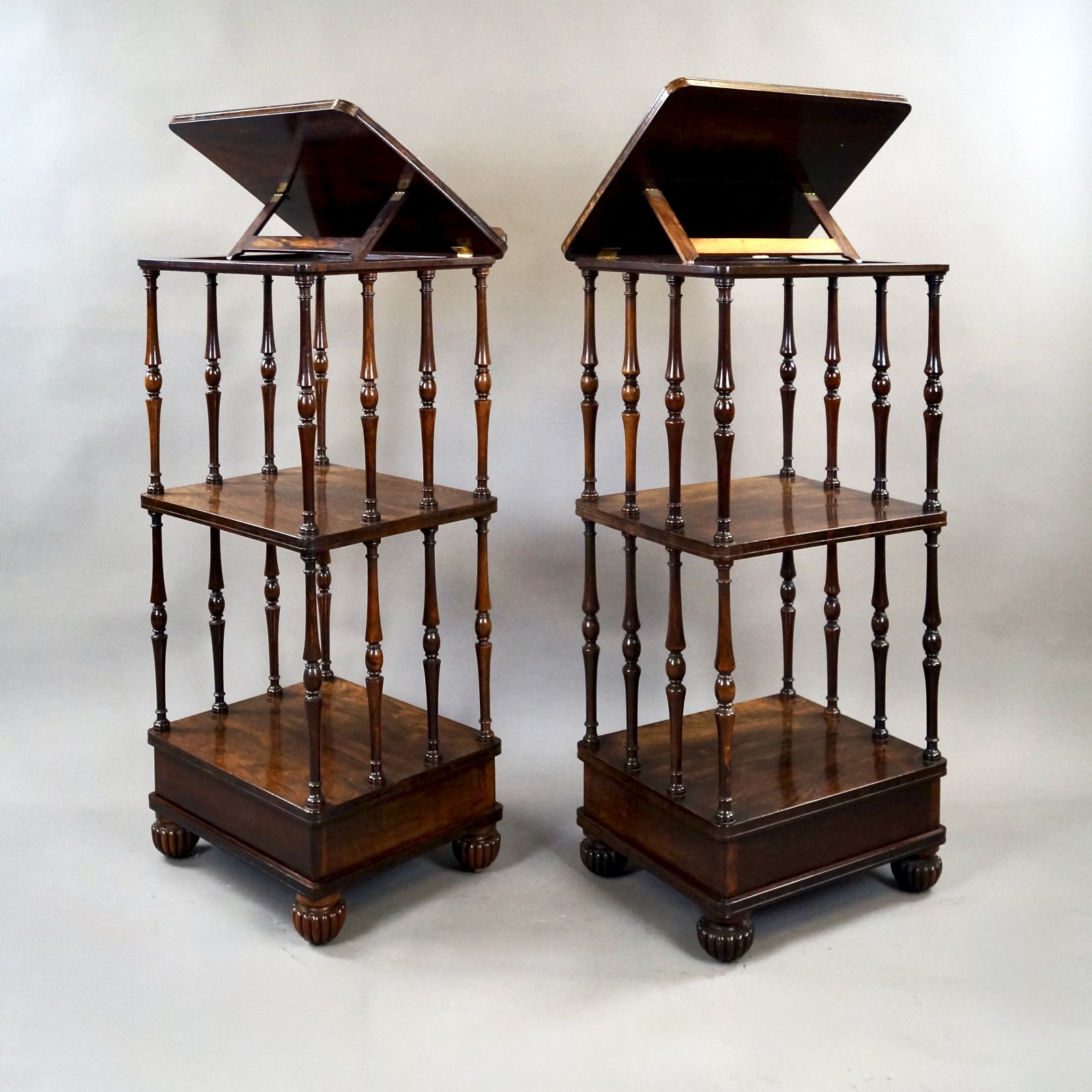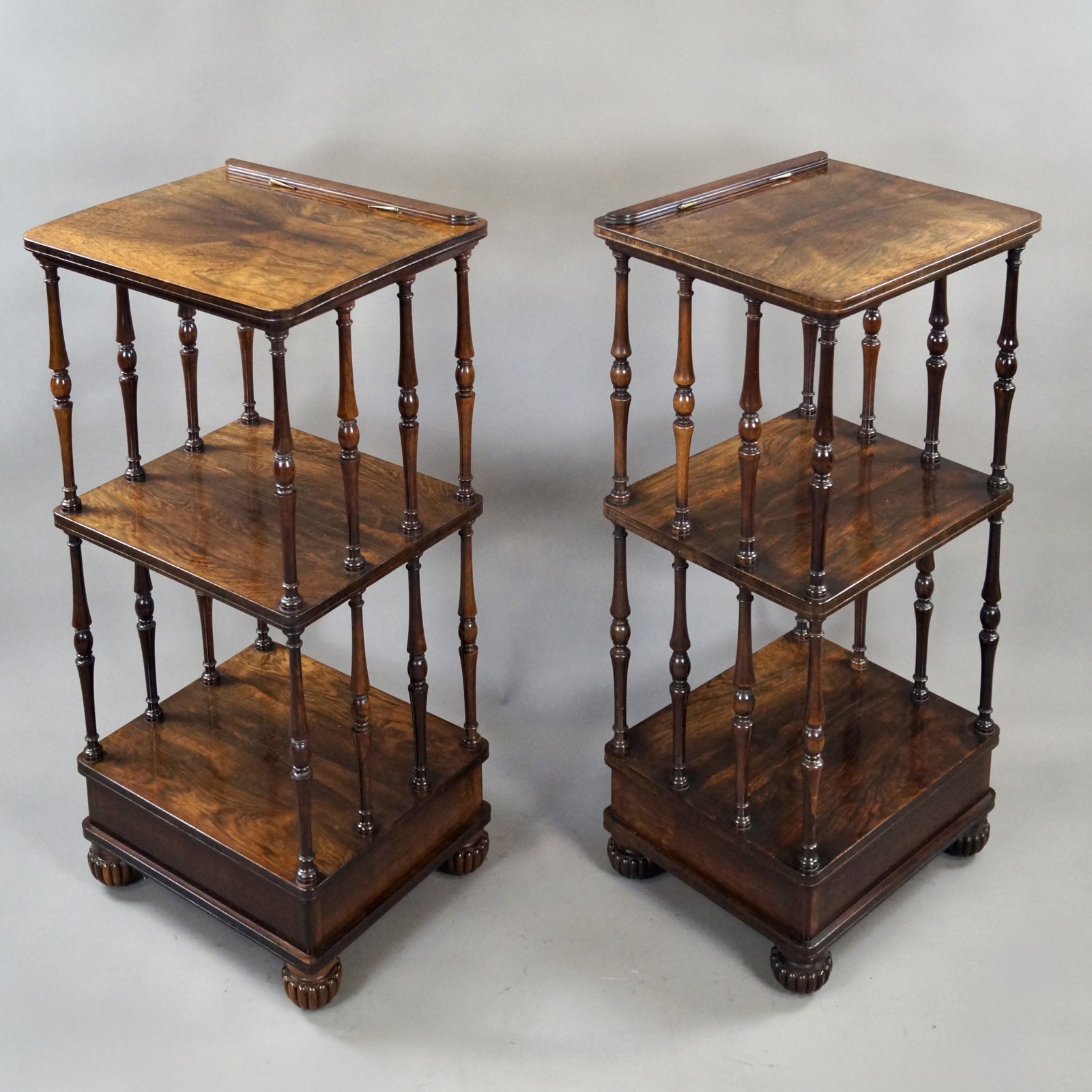A Rare Pair Of Rosewood Whatnots Attributed To Gillows. Raised on turned "Mellon" feet and each with a single, mahogany lined, drawer and above two tiers supported by fine turned balusters. The adjustable rising tops with book rests. This fine pair of whatnots are in dense, well grained rosewood, which has adopted a lovely colour, and are in very good and original condition. 1040mm high, 500mm wide and 420mm deep. English. Circa 1830.