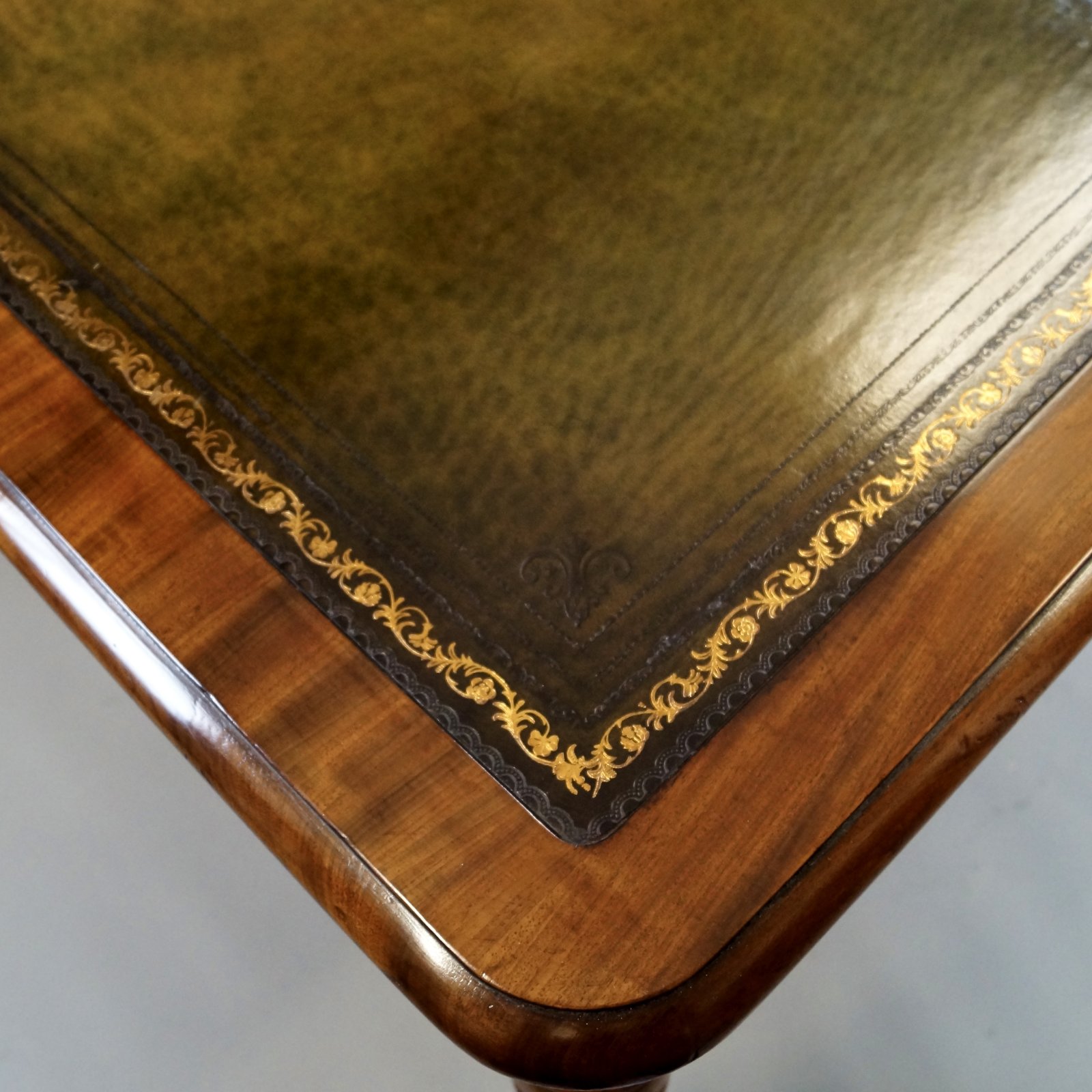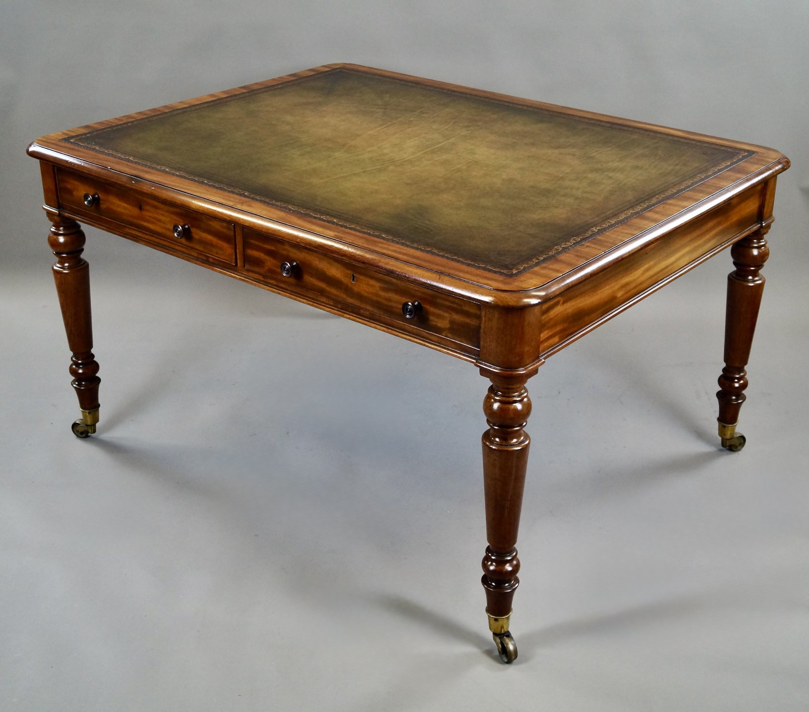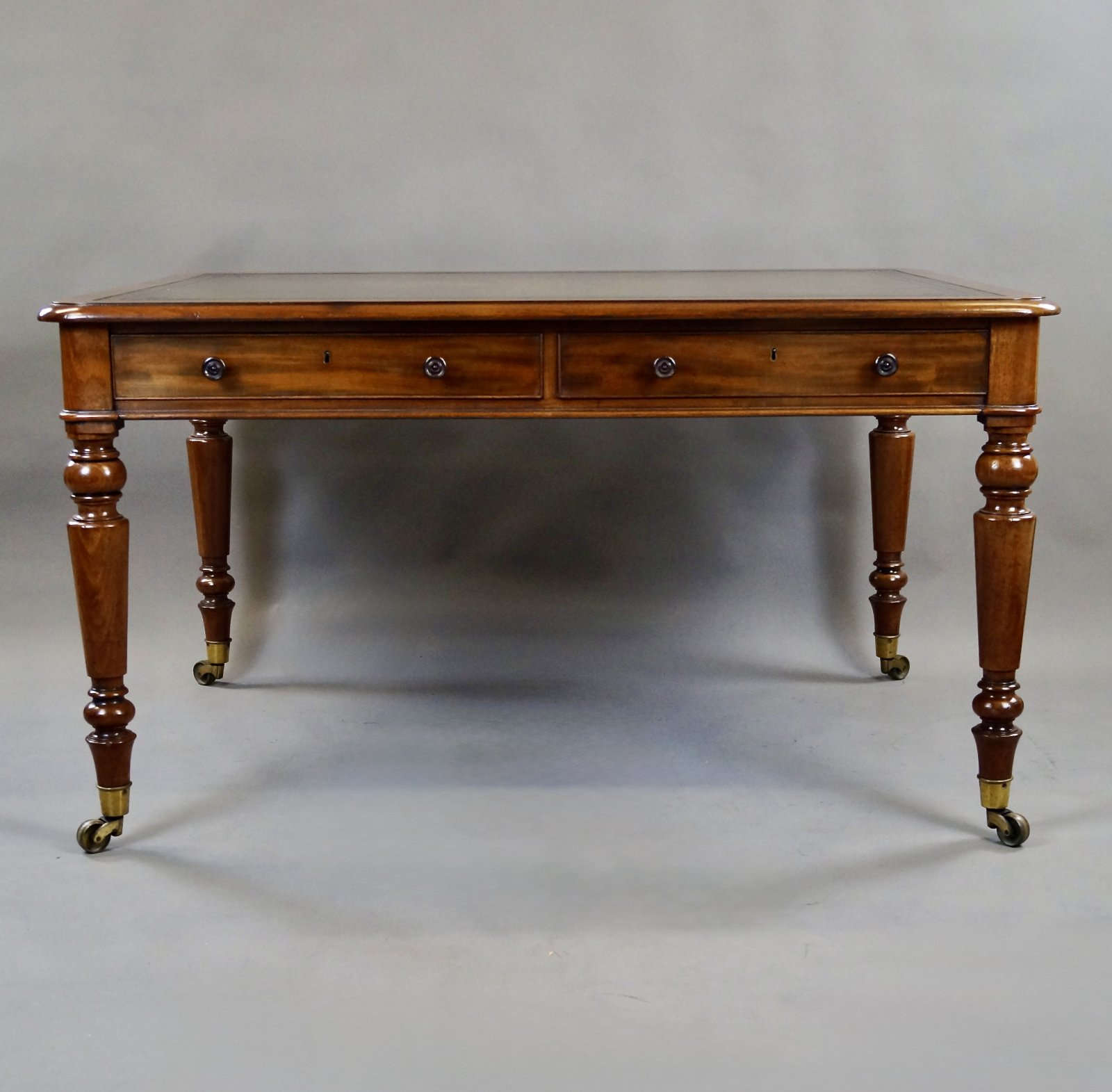 A quality mahogany Partners Writing Table. Raised on turned legs with original brass castors, stamped "Cope Patent" and above two mahogany lined & cock beaded drawers to either side with original turned wooden knobs. The top has a molded and cross banded edge and green leather inset writing surface with gilt and blind tooling. In very good condition and bearing all the hallmarks of Gillows. 760mm high, 1370mm wide and 1070mm deep. English. Circa 1830