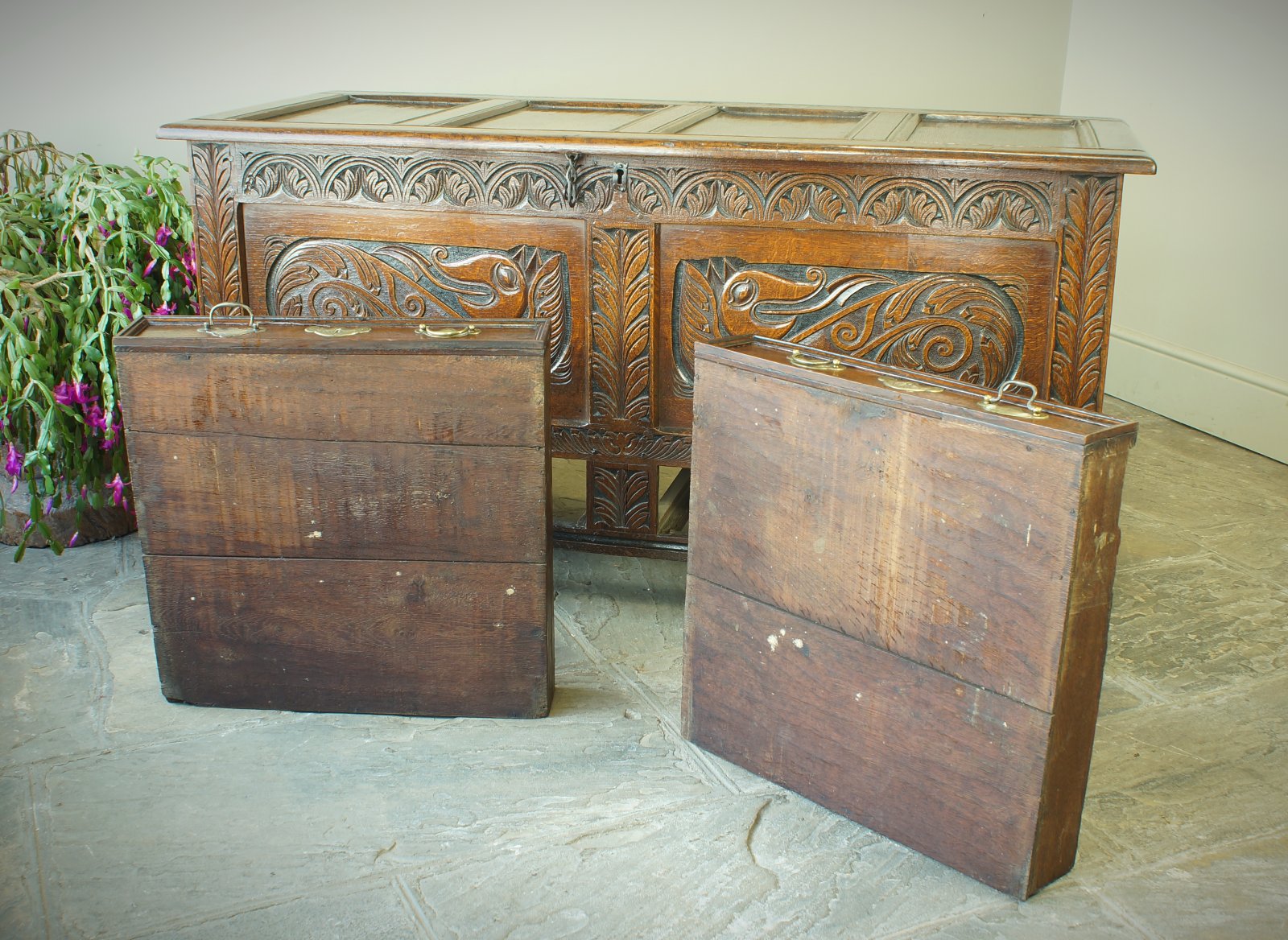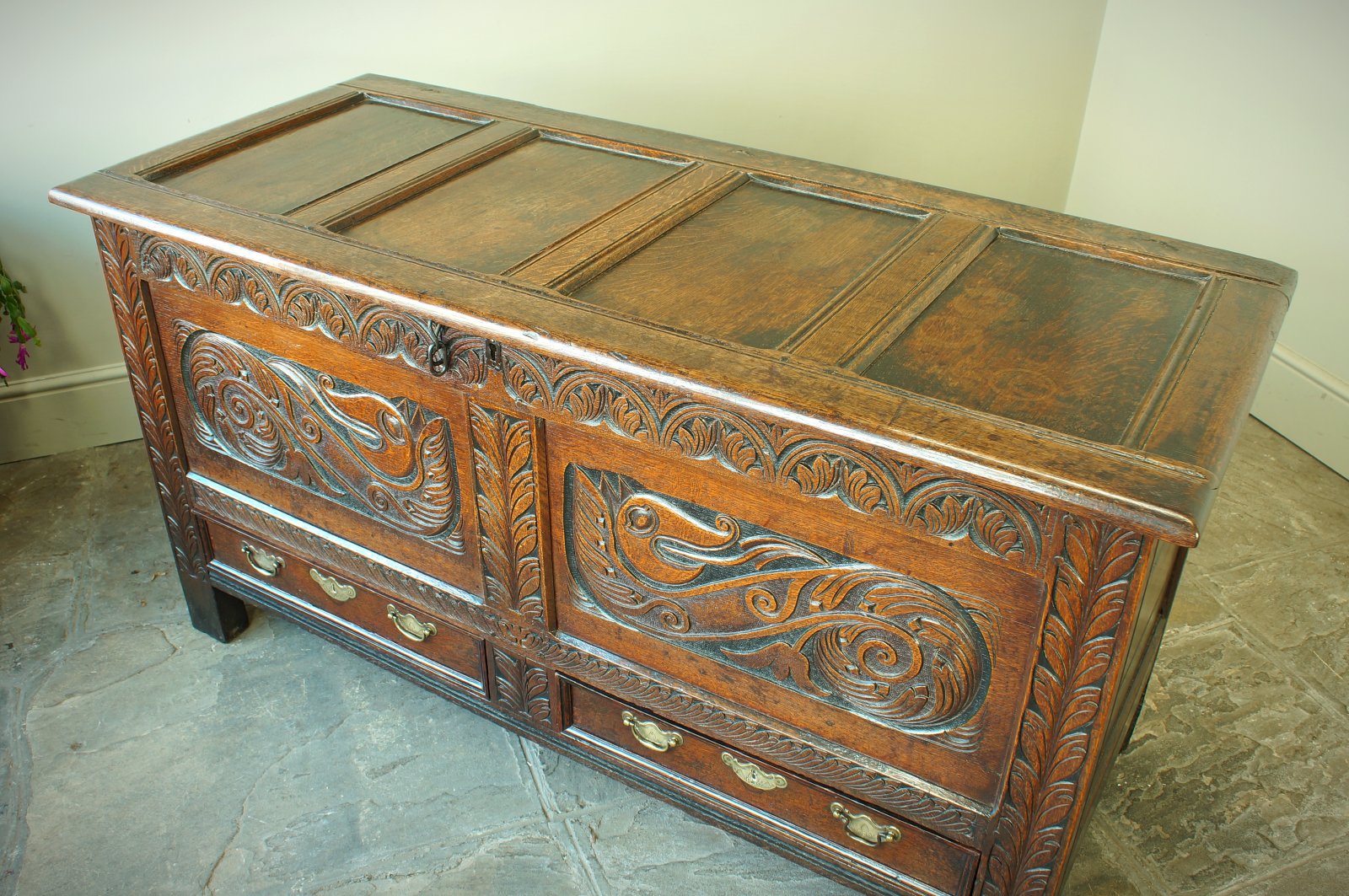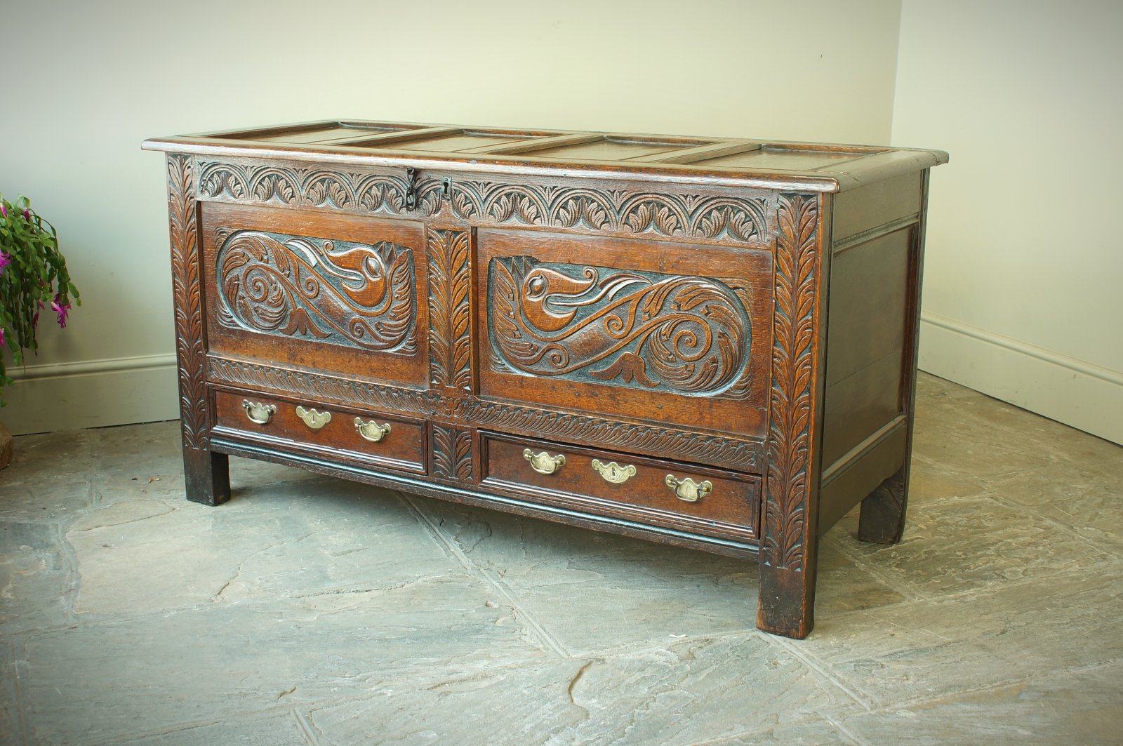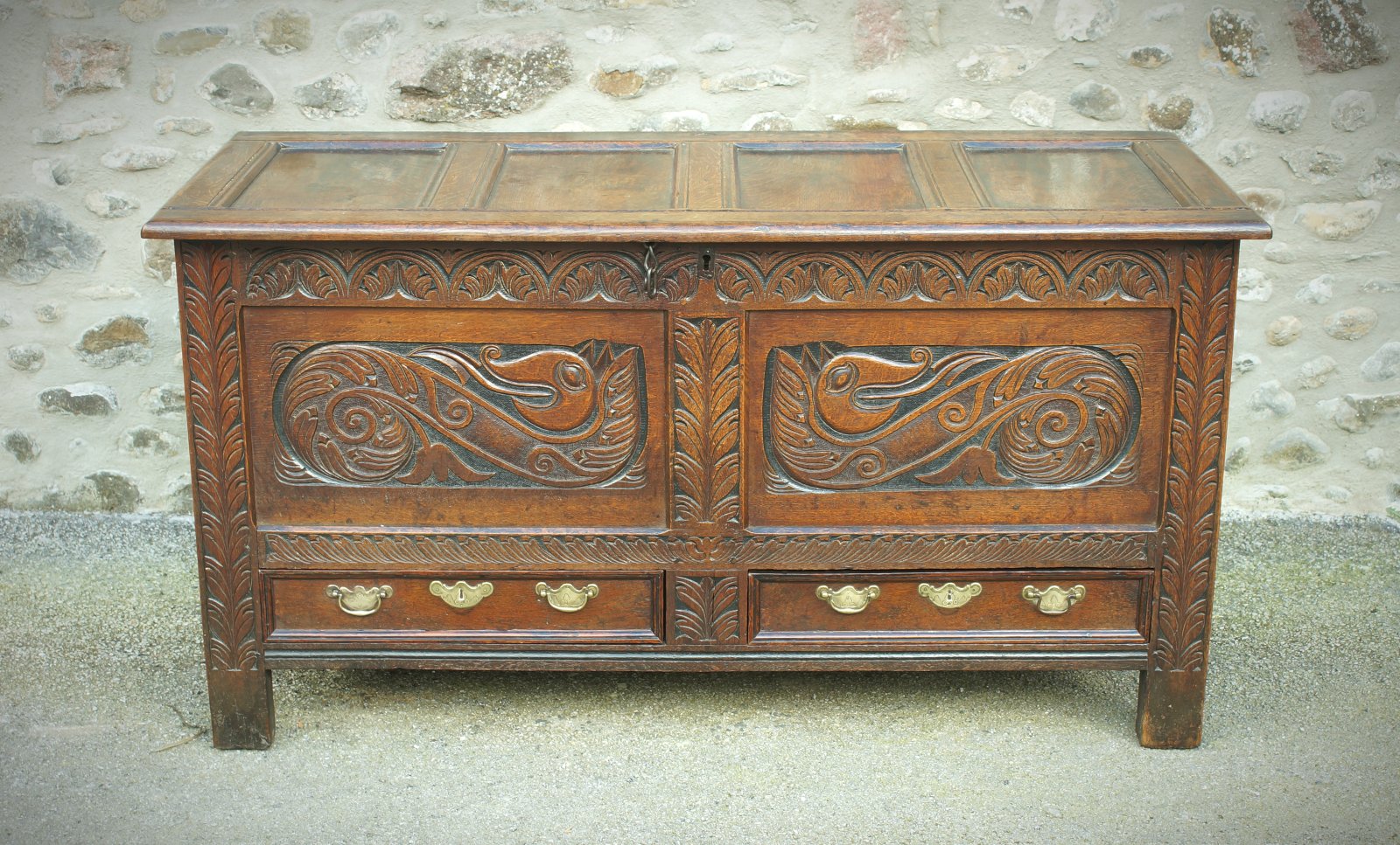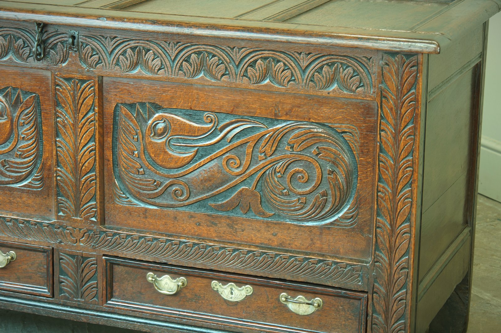 A superb example of an oak coffer or mule chest from the late 17th century featuring a wonderfully carved pair of Dragons or Wyverns to the panels.