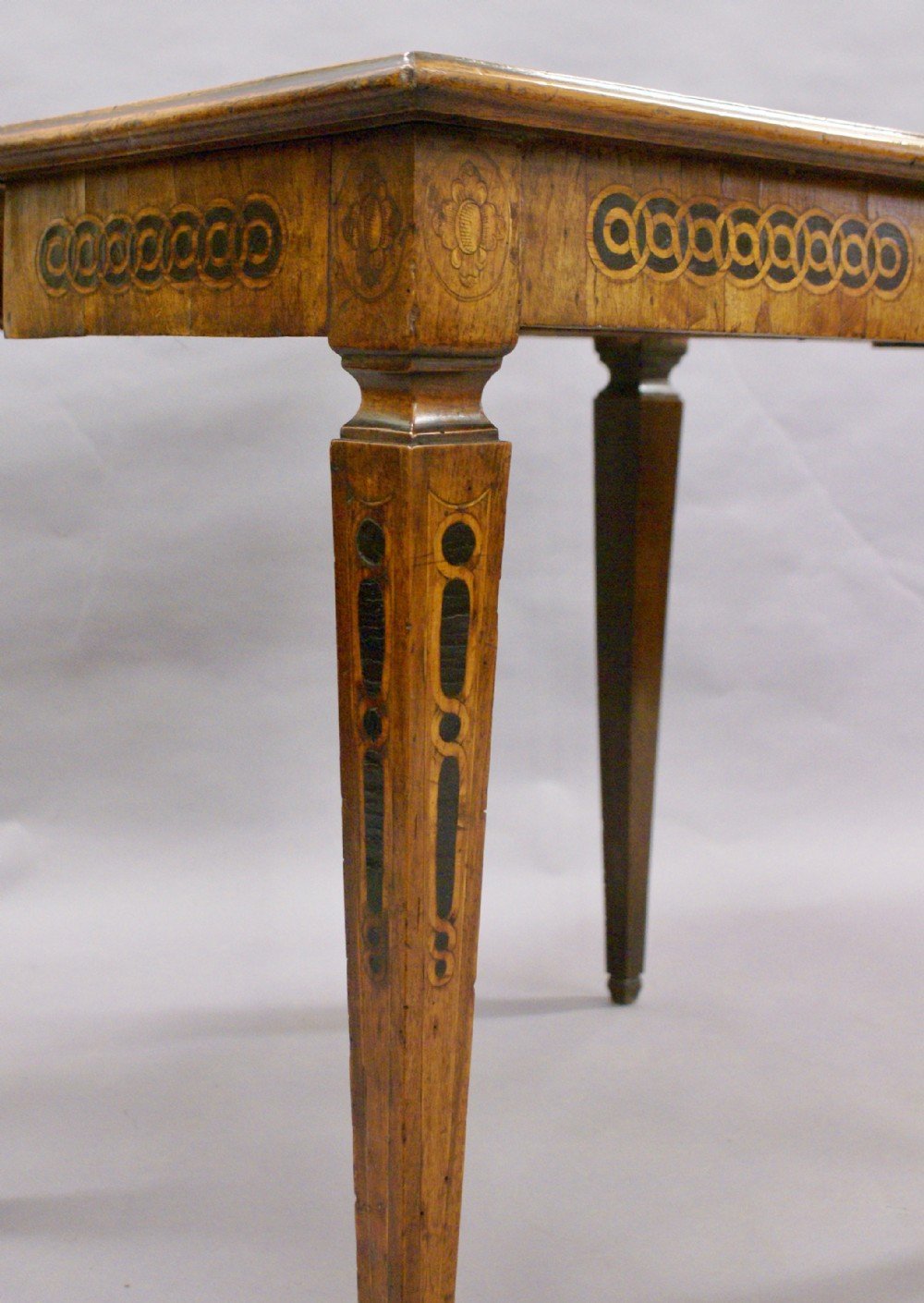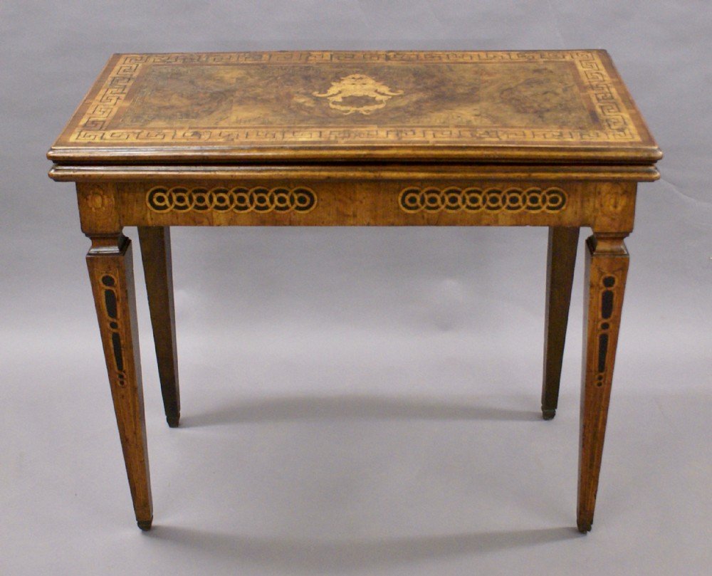 A rare 18th century Italian inlaid games table. Raised on square tapered legs with shaped molded toes. The table is in walnut and is profusely inlaid with geometric designs, Greek Key borders, pateria and a central mask all in a variety of woods including box wood and ebony. The back legs pull out a reveal a drawer and also support for the top when open. In very good condition commensurate with its age. 740mm high, 860mm wide and 430mm deep (460mm deep when open) North Italian. Circa 1785.