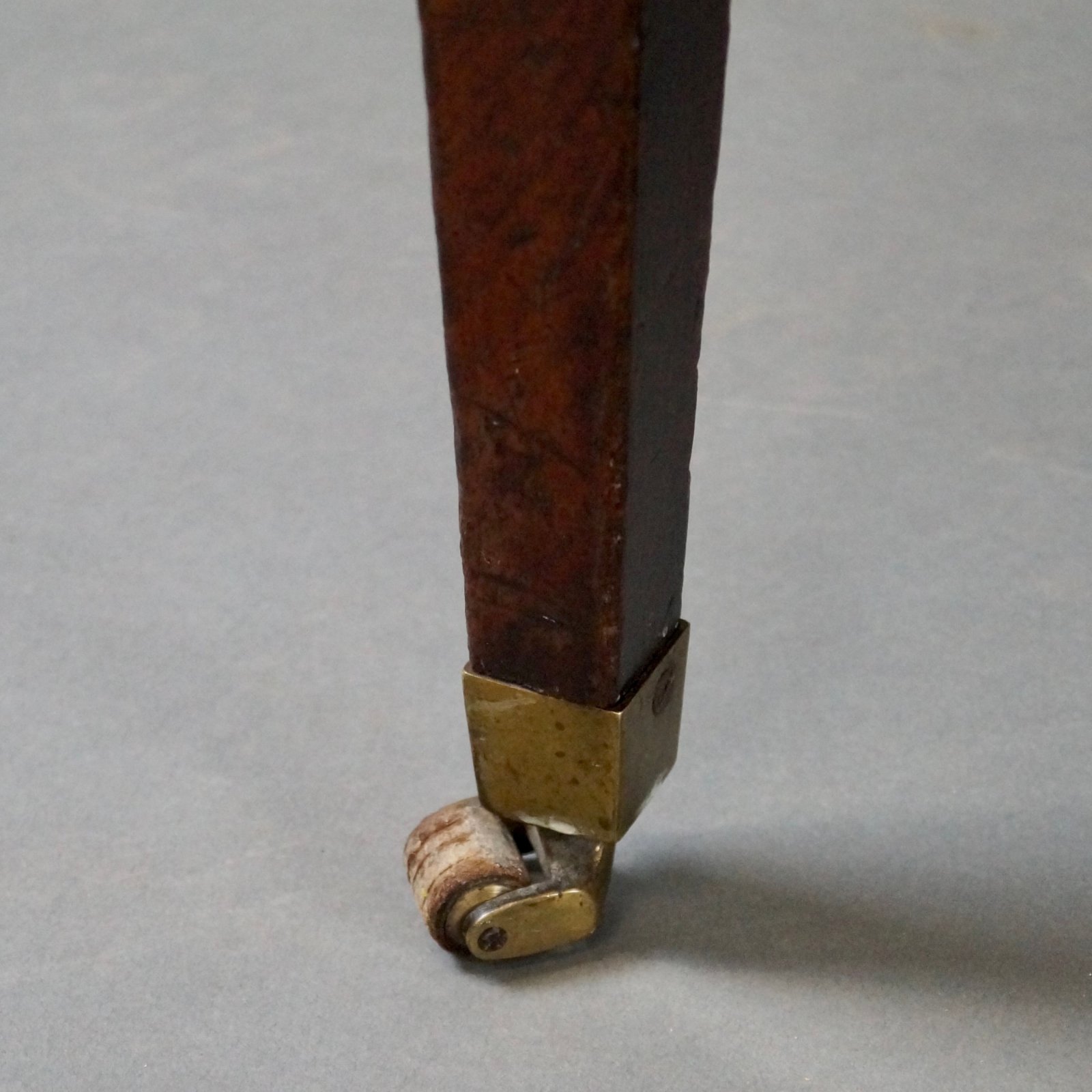 A rare 18thC Hepplewhite period mahogany sofa. Raised on square tapered legs with original brass castors and leather wheels. The well shaped, camel back frame is beautifully upholstered in leather. In very good and original condition. 915mm high, 1320mm wide and 760mm deep. English. Circa 1785.