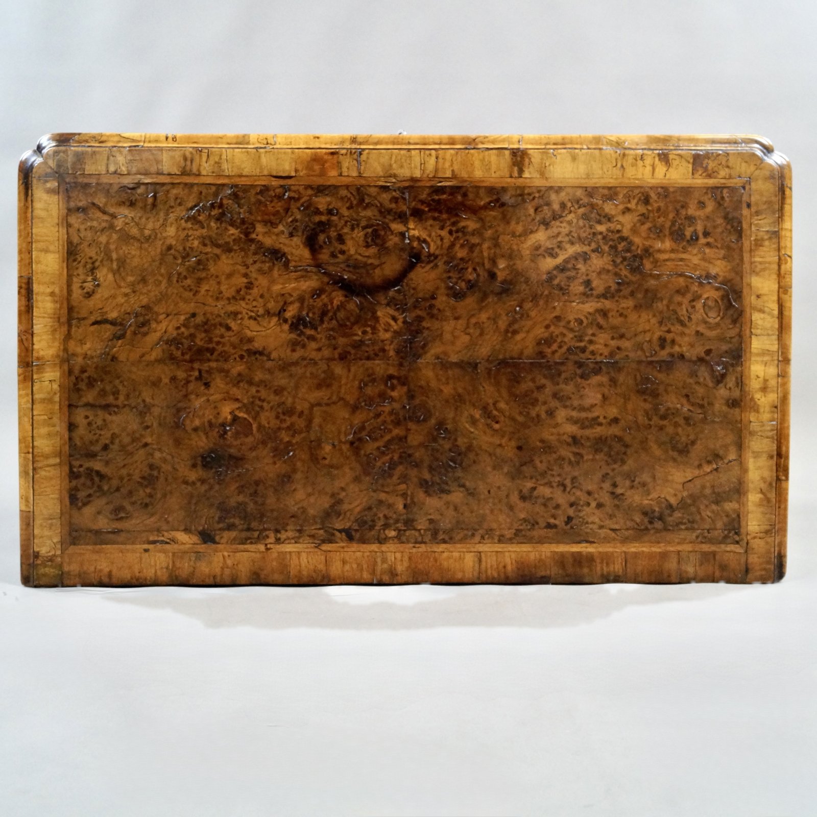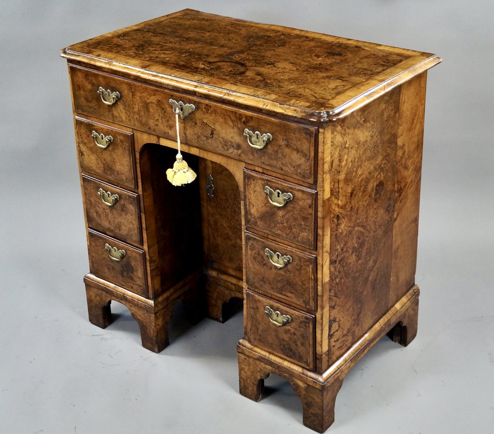 A rare George I, Burr oak knee-hole desk. Raised on bracket feet with seven oak lined drawers and knee-hole cupboard, all with original handles, and above a cross and feather banded top with molded edge and re-entrant corners. The desk is constructed in highly decorative burr oak which has adopted a lovely mellow colour. In very good and original condition. 830mm high, 850mm wide and 490mm deep. English. Circa 1725.