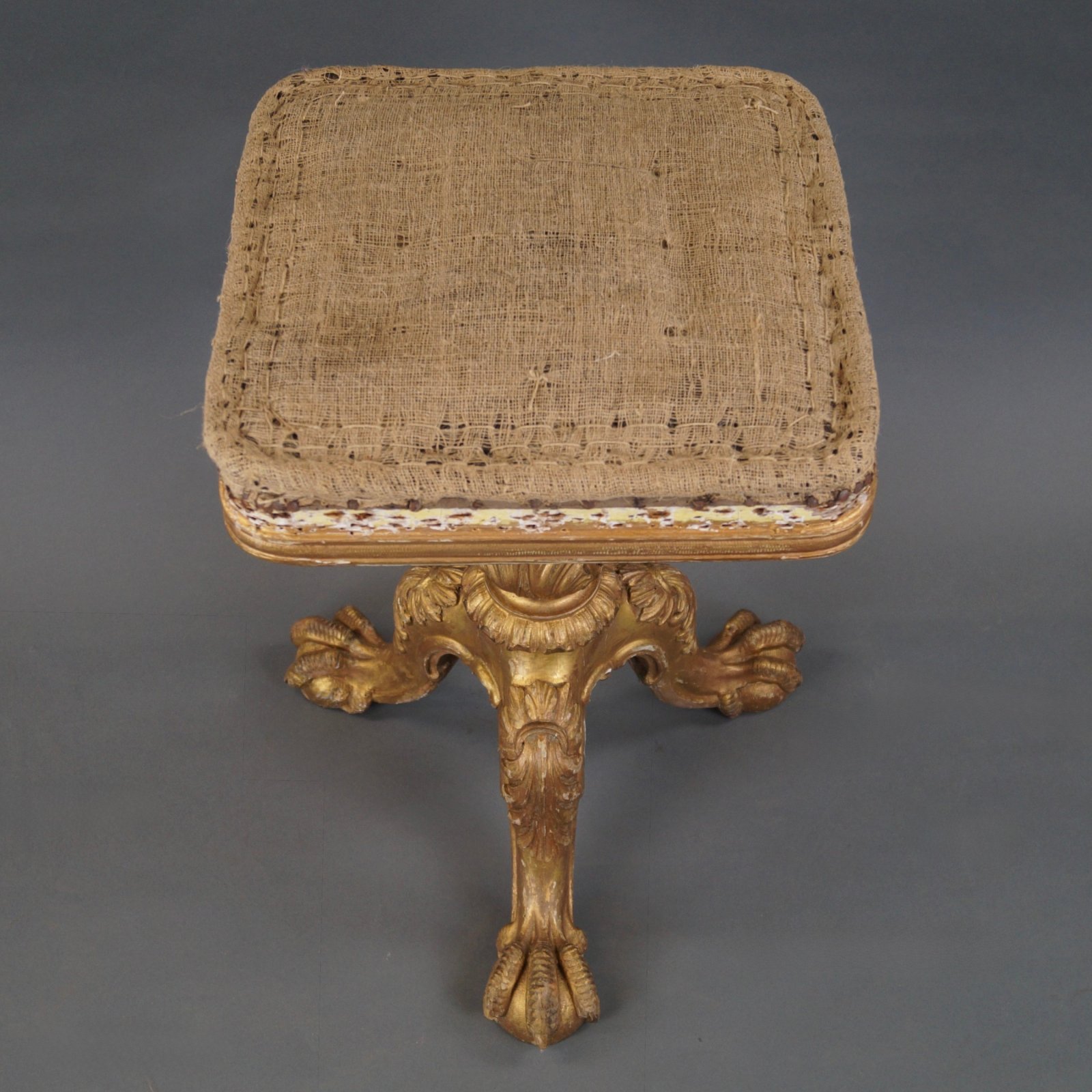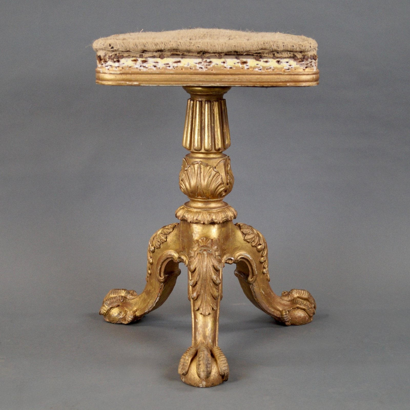 A rare gilt music stool attributed to Gillows. Raised on scaly claw and ball feet with acanthus carved knees supporting a carved and reeded column. The seat revolves and is height adjustable by means of a threaded steel screw and retains its original horse hair upholstery with roll stitched edge. The stool is a very rare item which retains some of its original gilding. 510mm high (at its lowest setting) the seat is 330mm square and the feet have a 410mm diameter. English. Circa 1835.