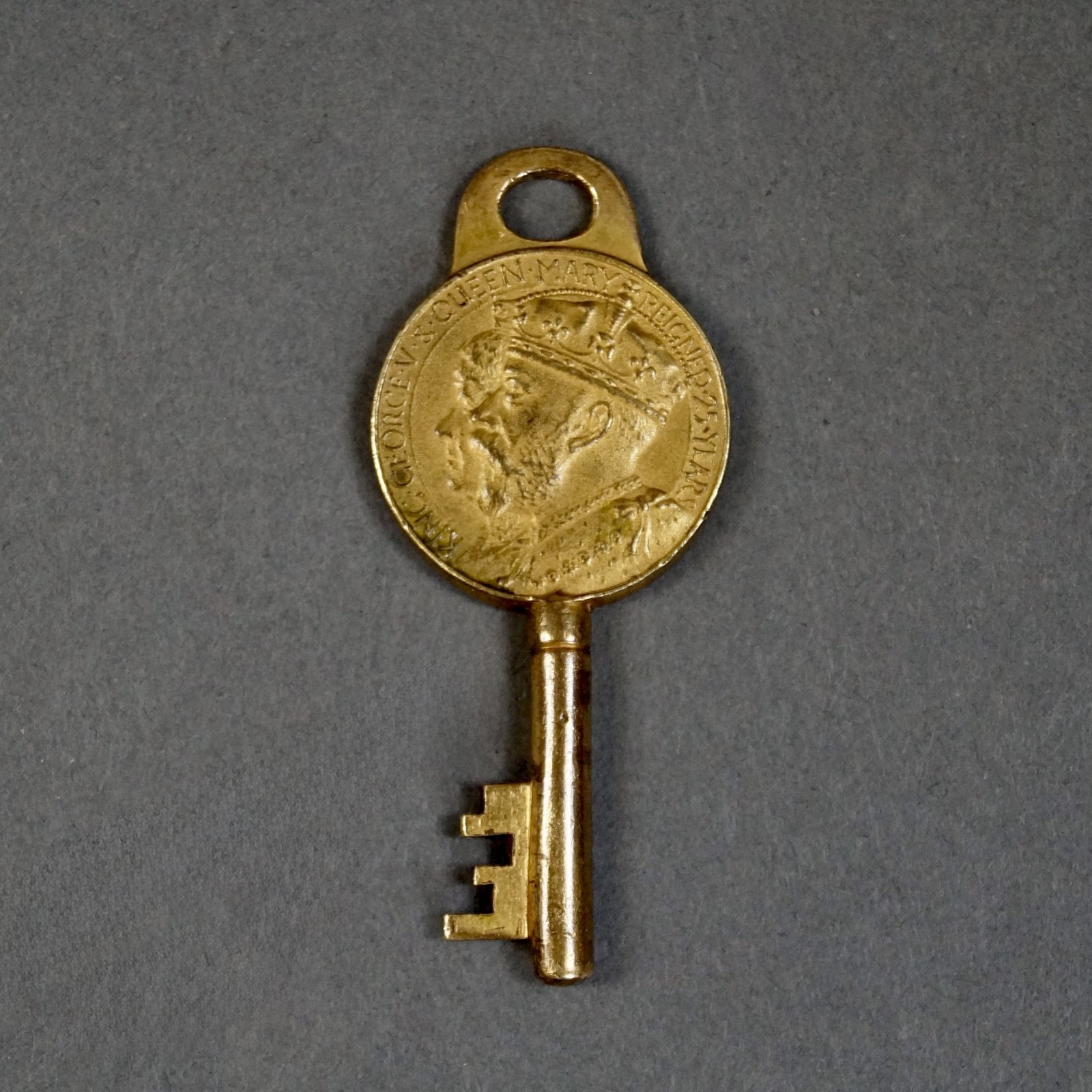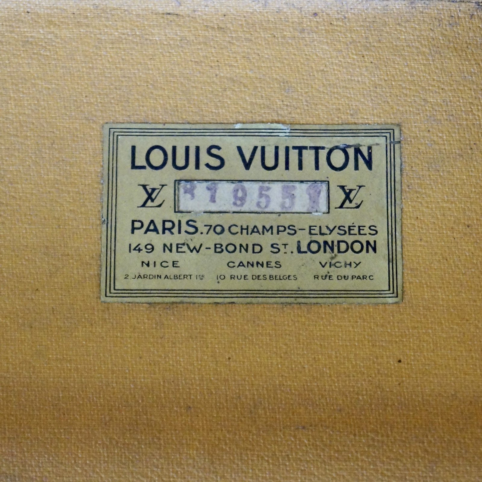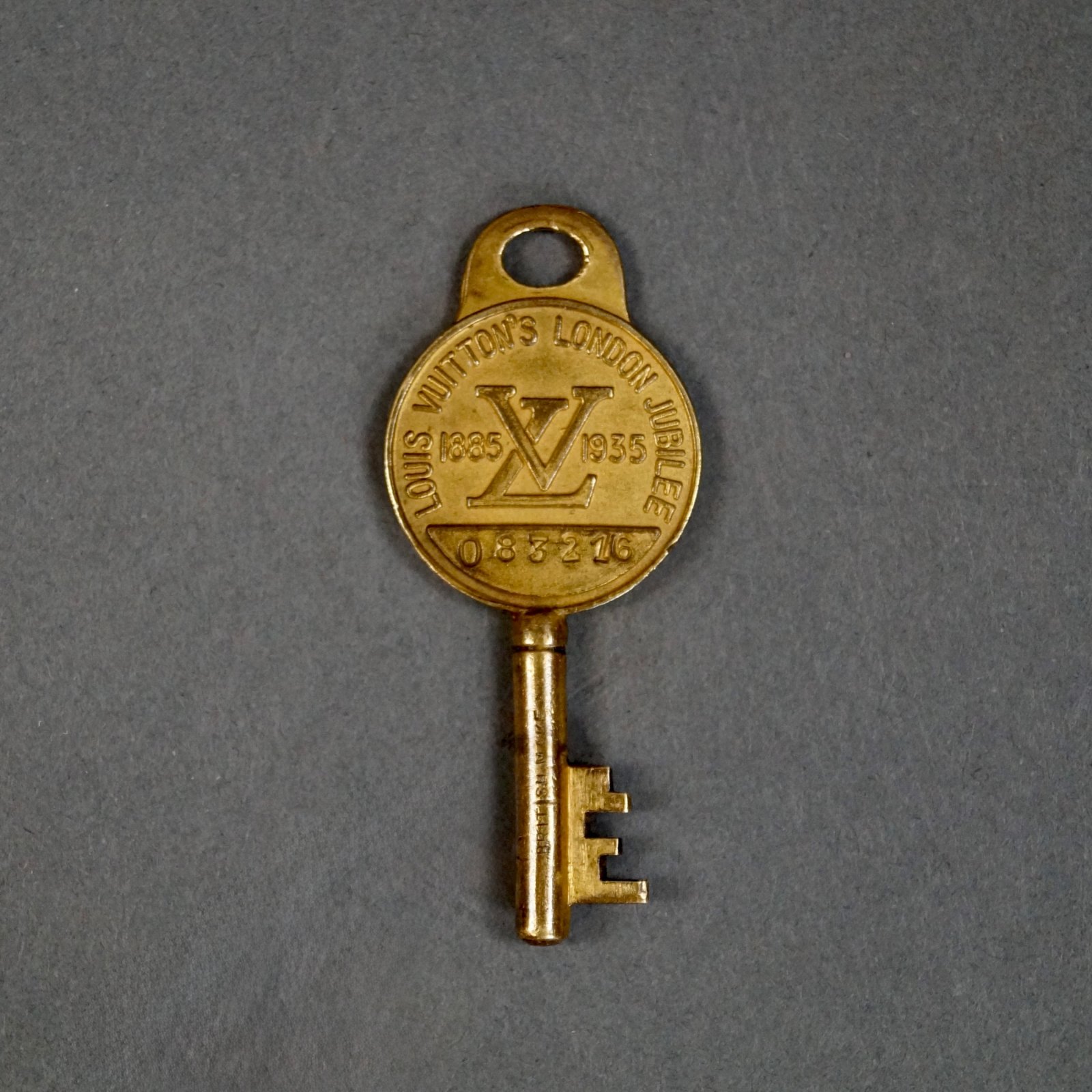 A rare Louis Vuitton George V & Queen Mary 25 year anniversary trunk. In very good, original and unrestored condition and with its original commemorative key. 870mm high, 550mm wide and 230mm deep. French. Dated 1935.