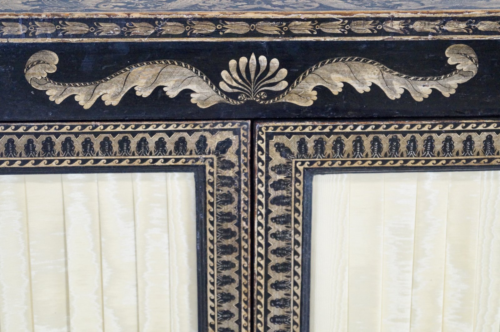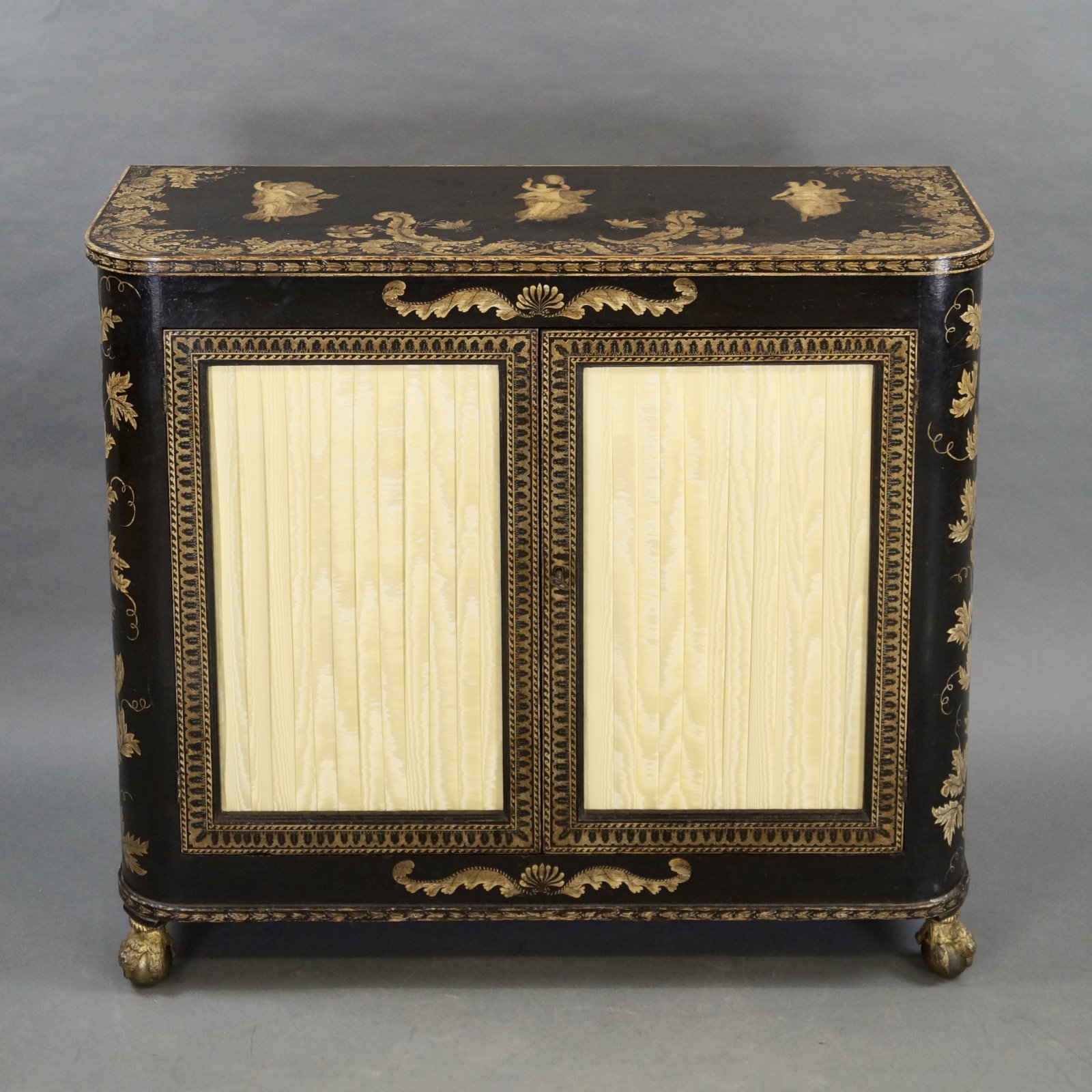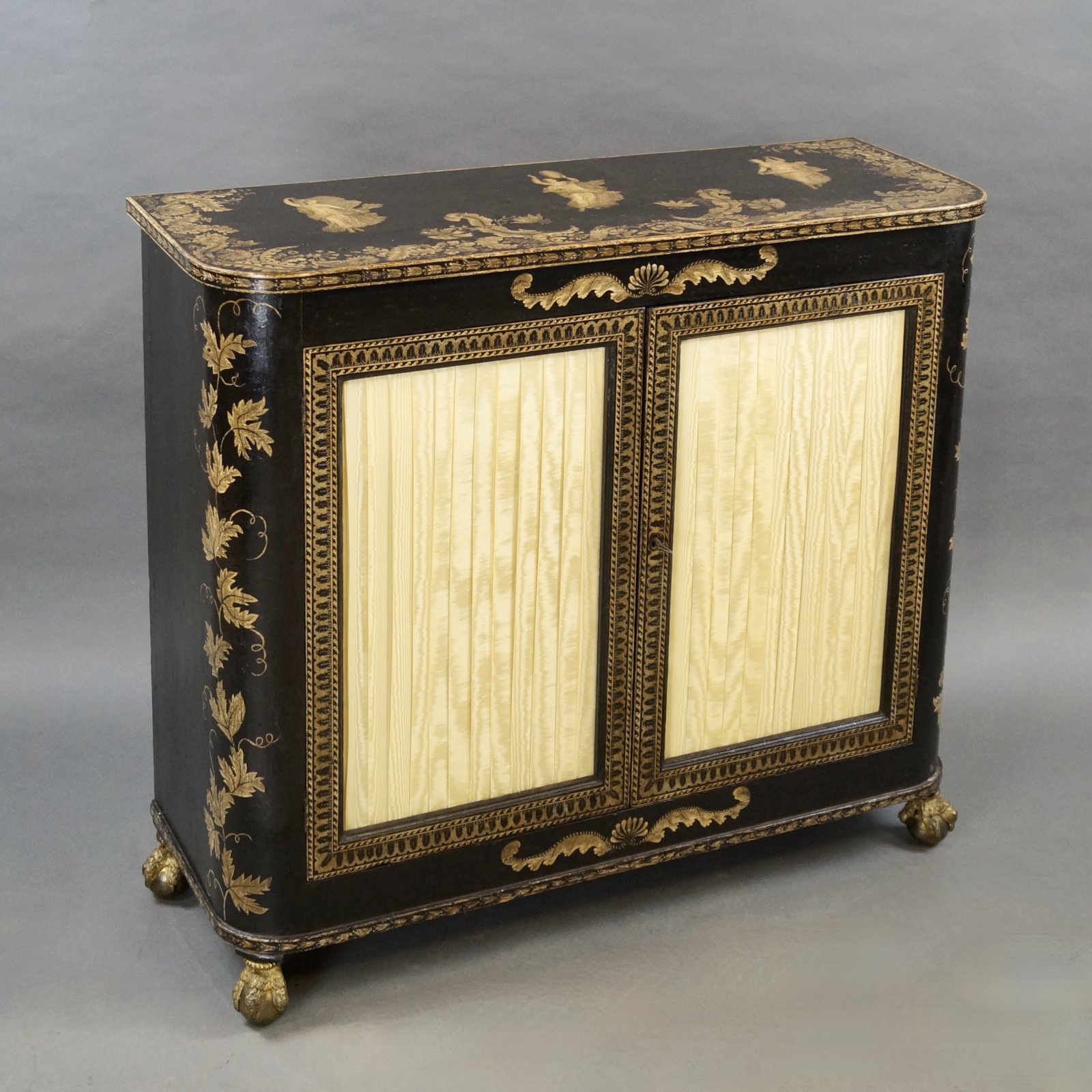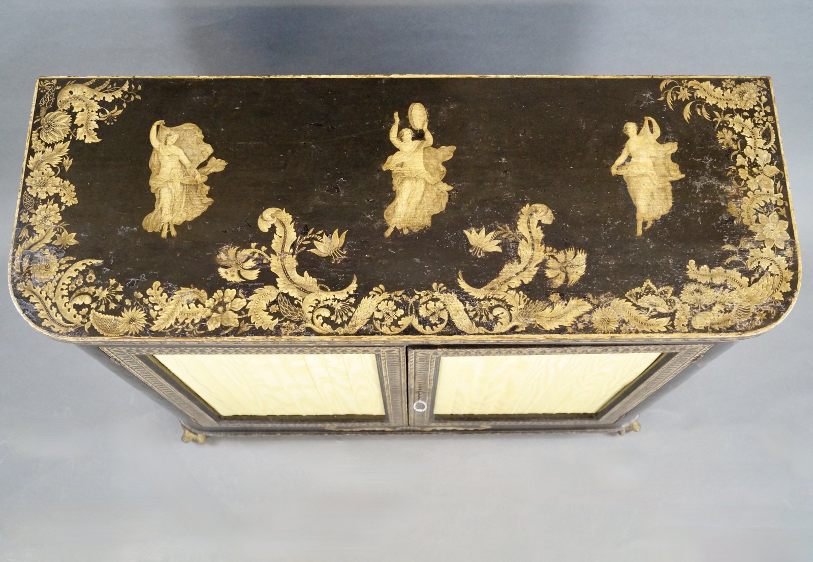A rare Regency pen-work side cabinet. In very good and original condition and retaining its original detailed decoration, which consists of classical figures dancing and playing tambourines, floral and foliate designs and filigree pattern around the doors which have pleated water silk panels and enclose a single shelved interior. The cabinet stands on its original brass claw and ball feet. 850mm high, 970mm wide and 360mm deep. English. Circa 1820.
