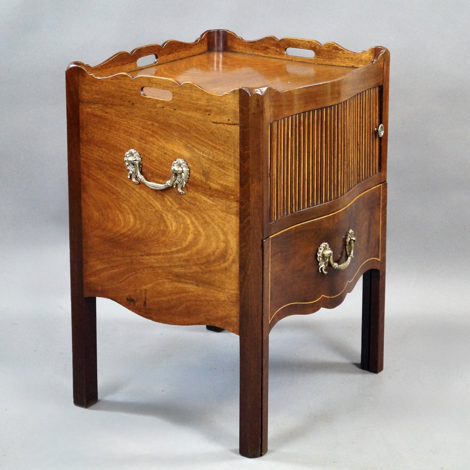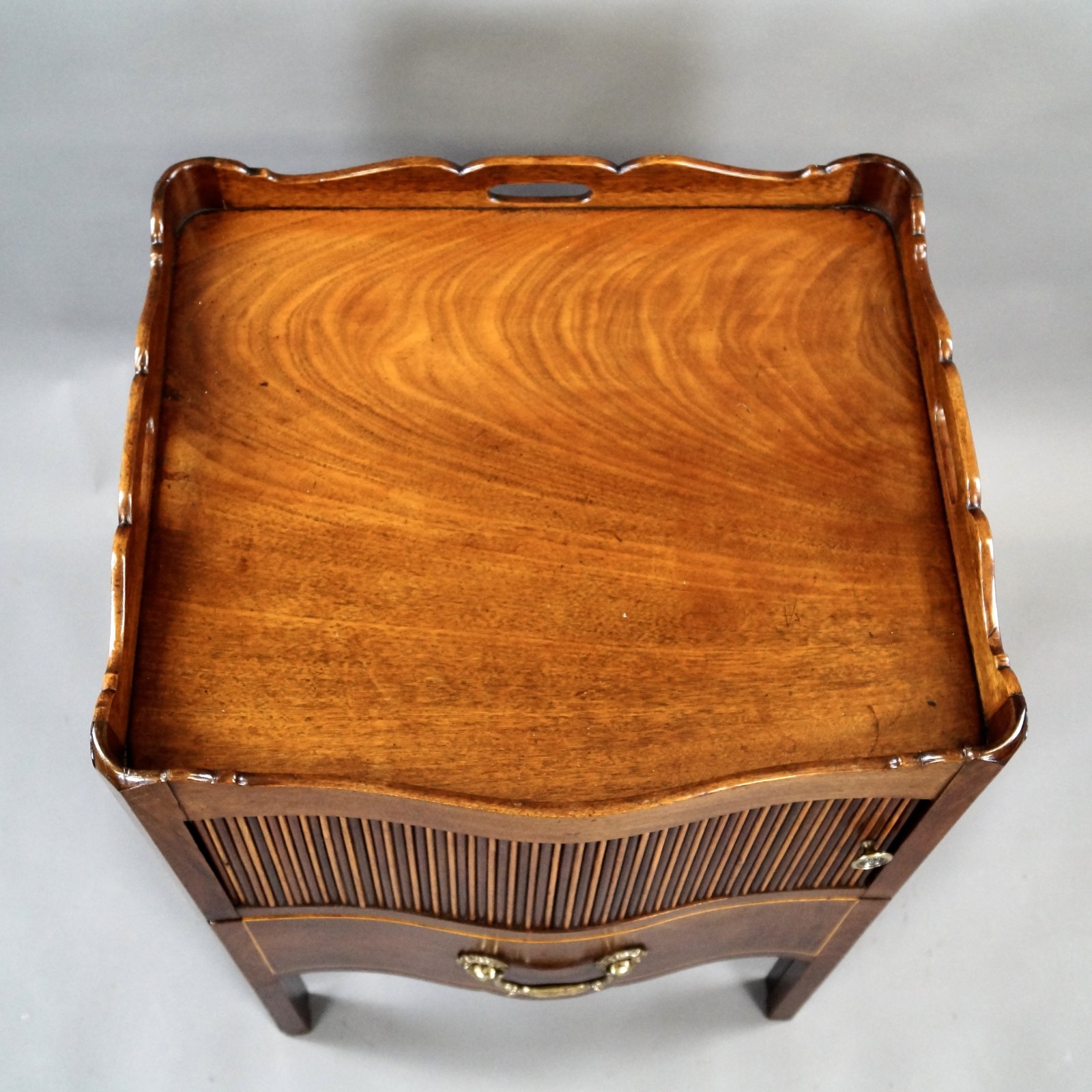 A rare George III mahogany, serpentine fronted Tray-Top Commode, with tambour cupboard of alternating mahogany and boxwood above a sliding drawer and with superb and original handles. 760mm high, 570mm wide and 500mm deep. English. Circa 1790.