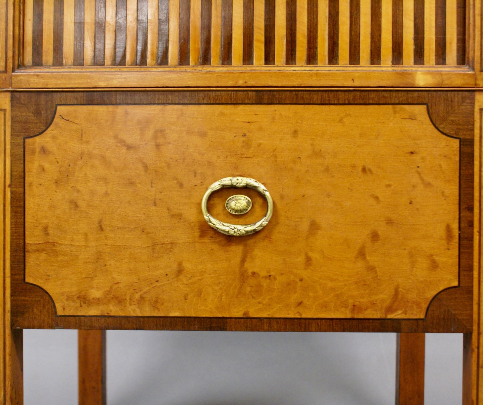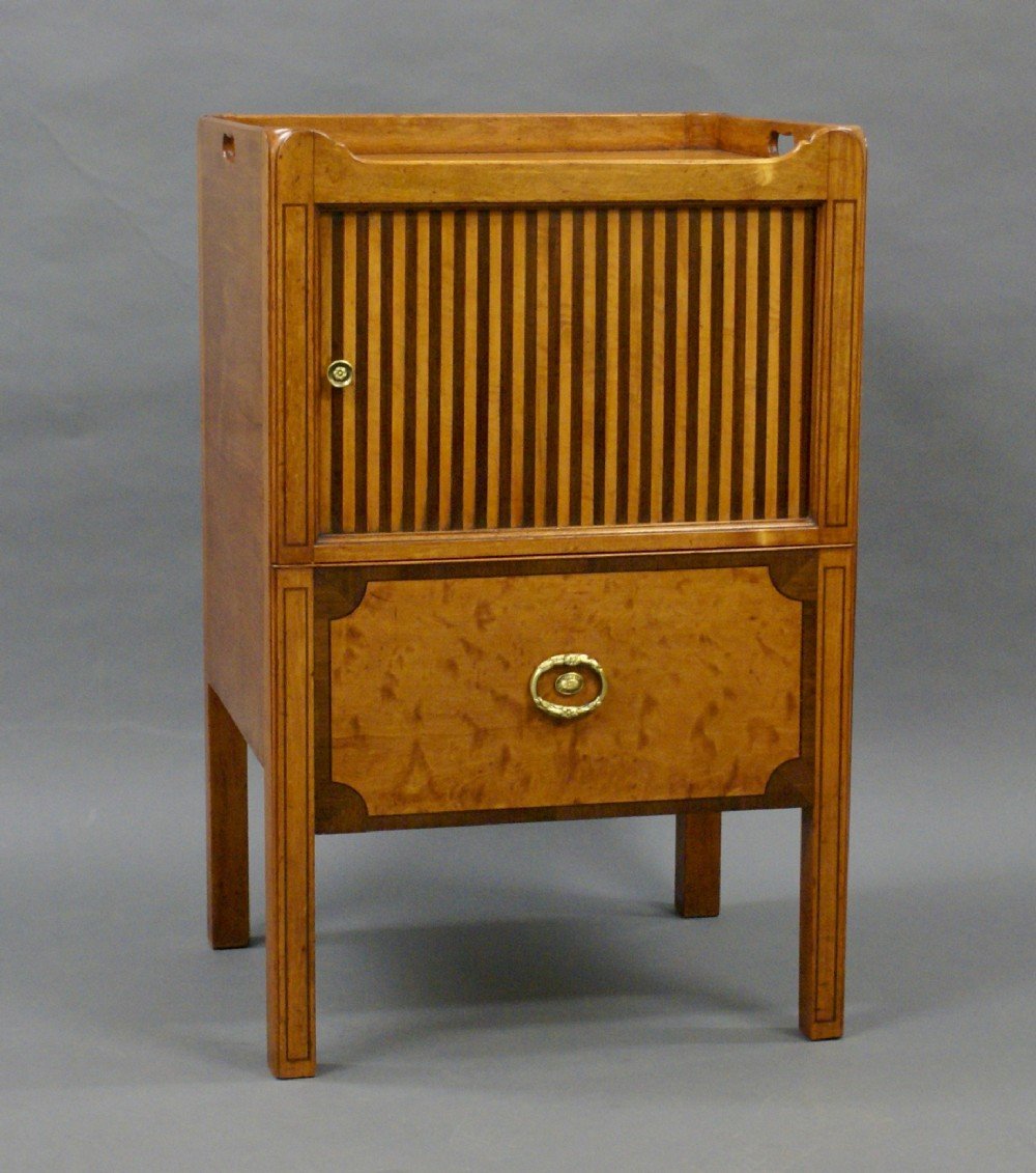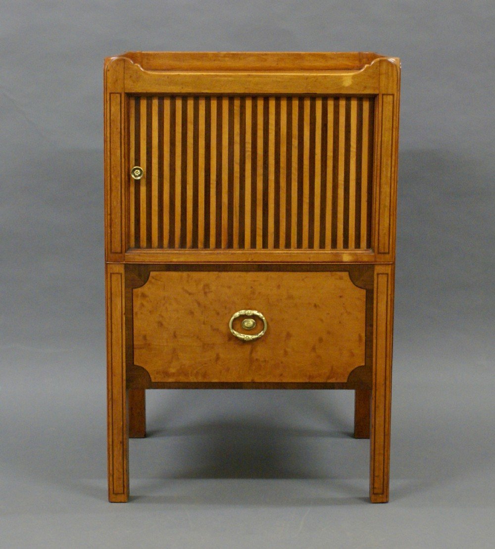 A rare tray-top commode attributed to Gillows. In satinwood and Partridge wood, with a slide out commode converted to a drawer and above a tambour fronted cupboard, both with original handles. The galleried top with carrying handles to either side. In very good condition and exceptionally unusual. 790mm high, 510mm wide and 430mm deep. English. Circa 1790.