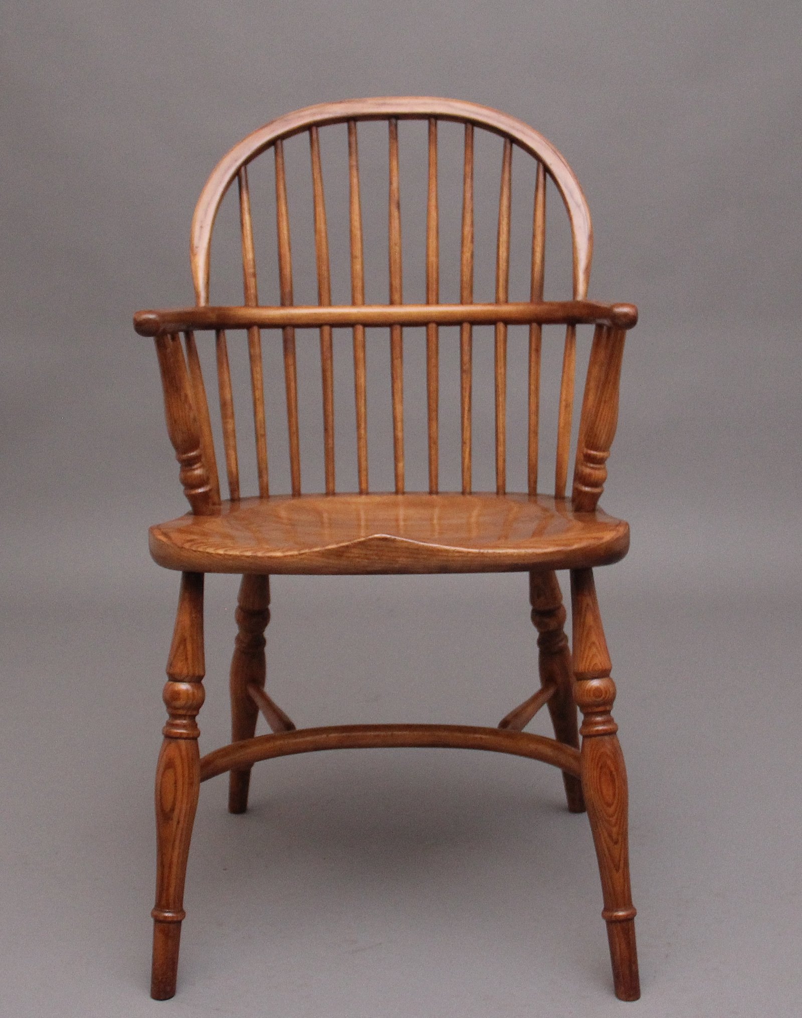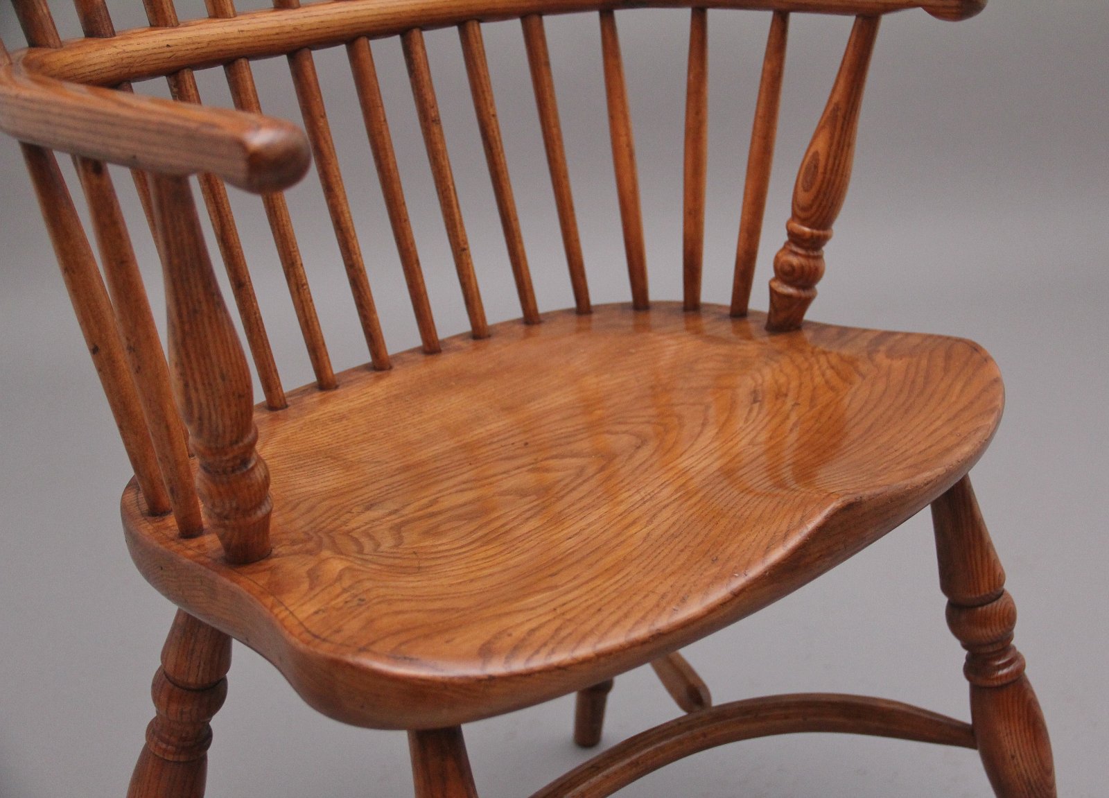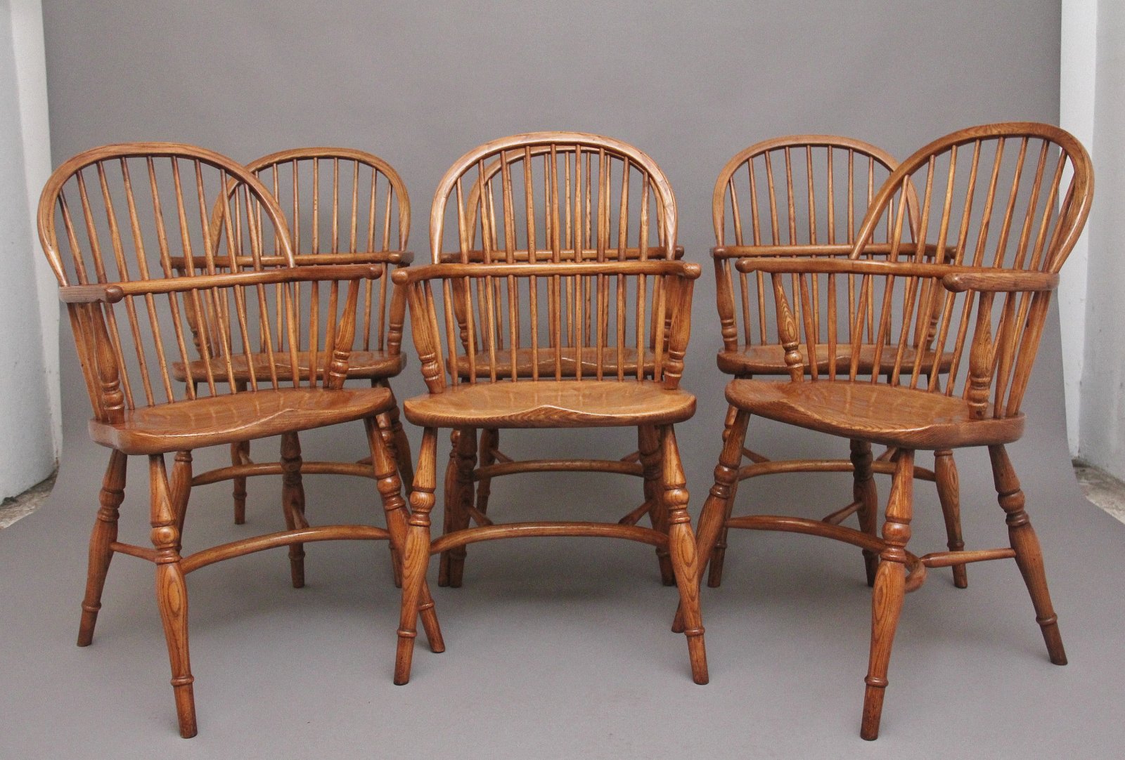 A lovely set of six mid 20th Century stick back Windsor armchairs in ash with an elm seat, having a saddle seat, turned legs and united by a shaped stretcher, all in excellent condition and having a lovely rich colour. Circa 1960.
