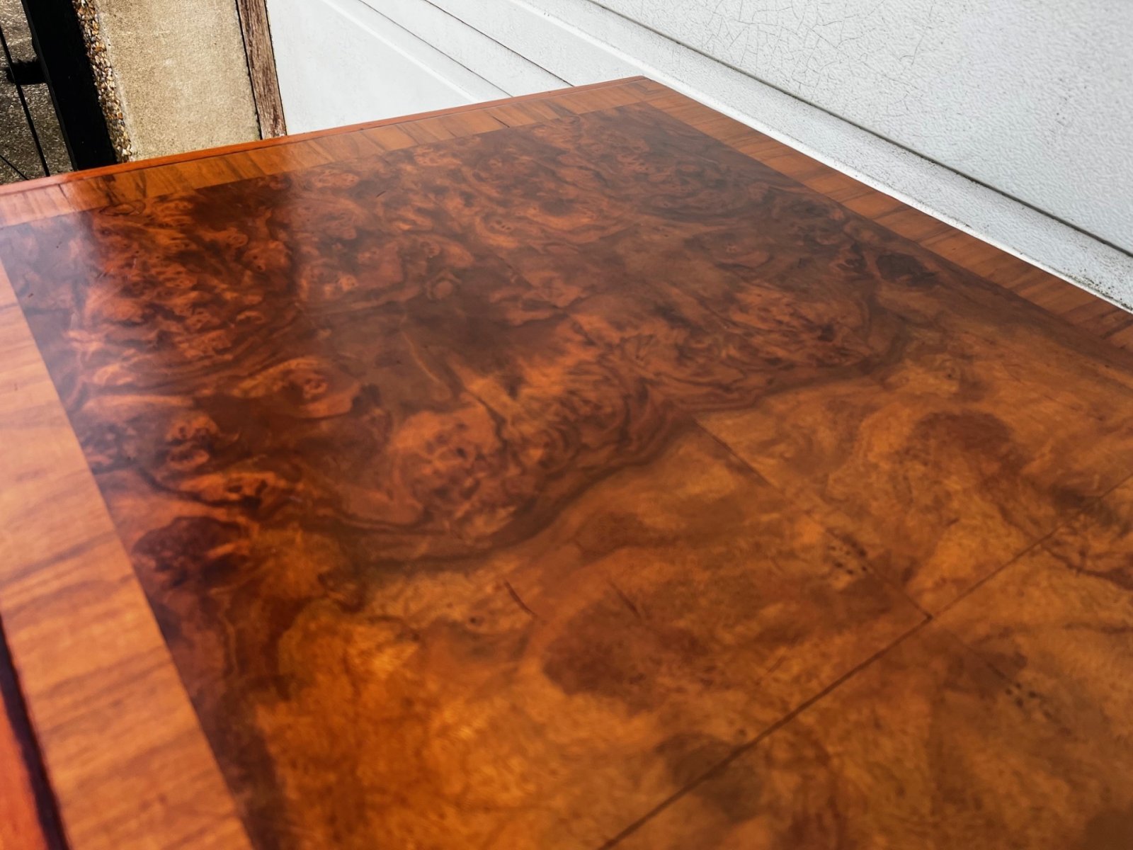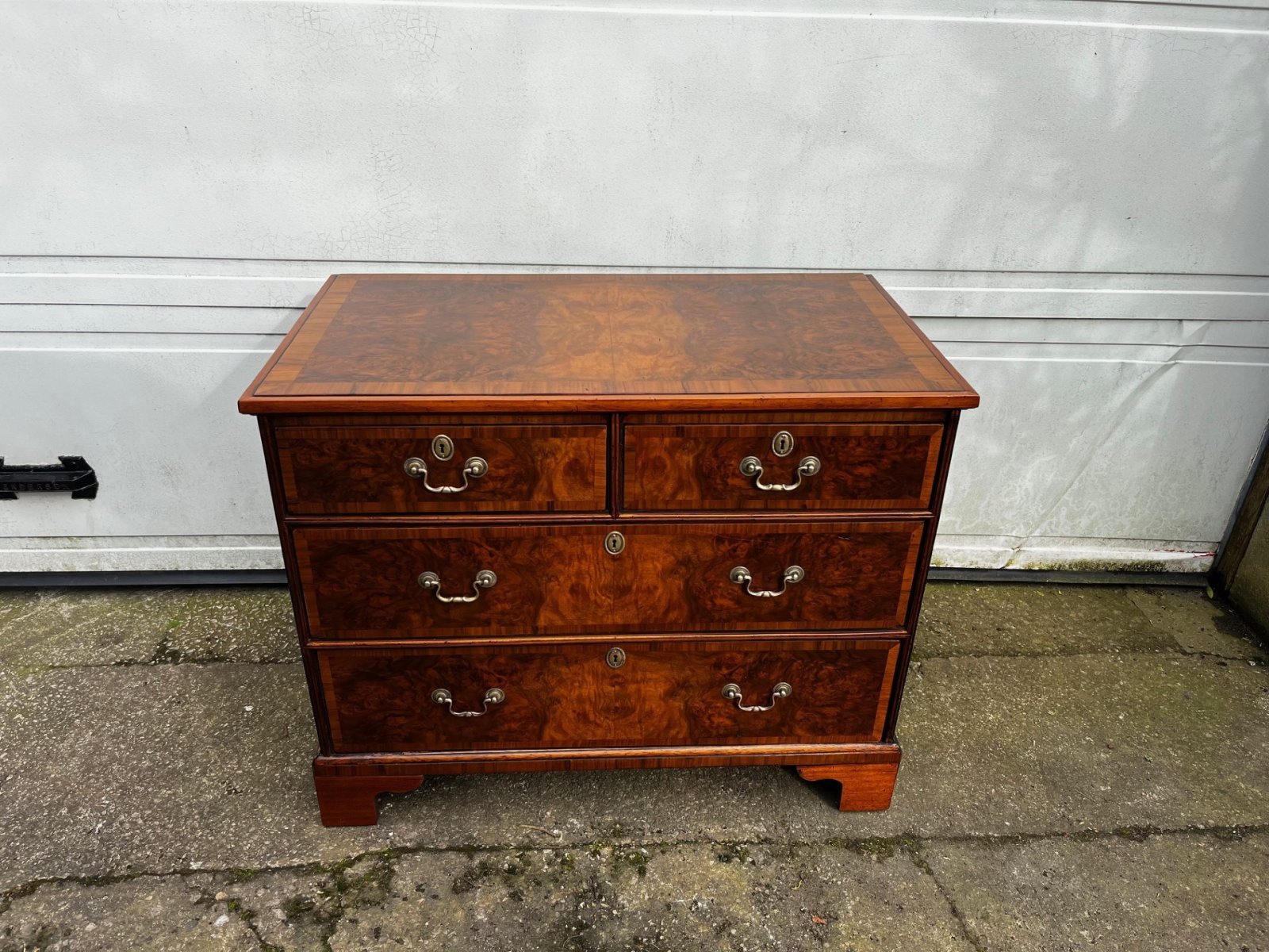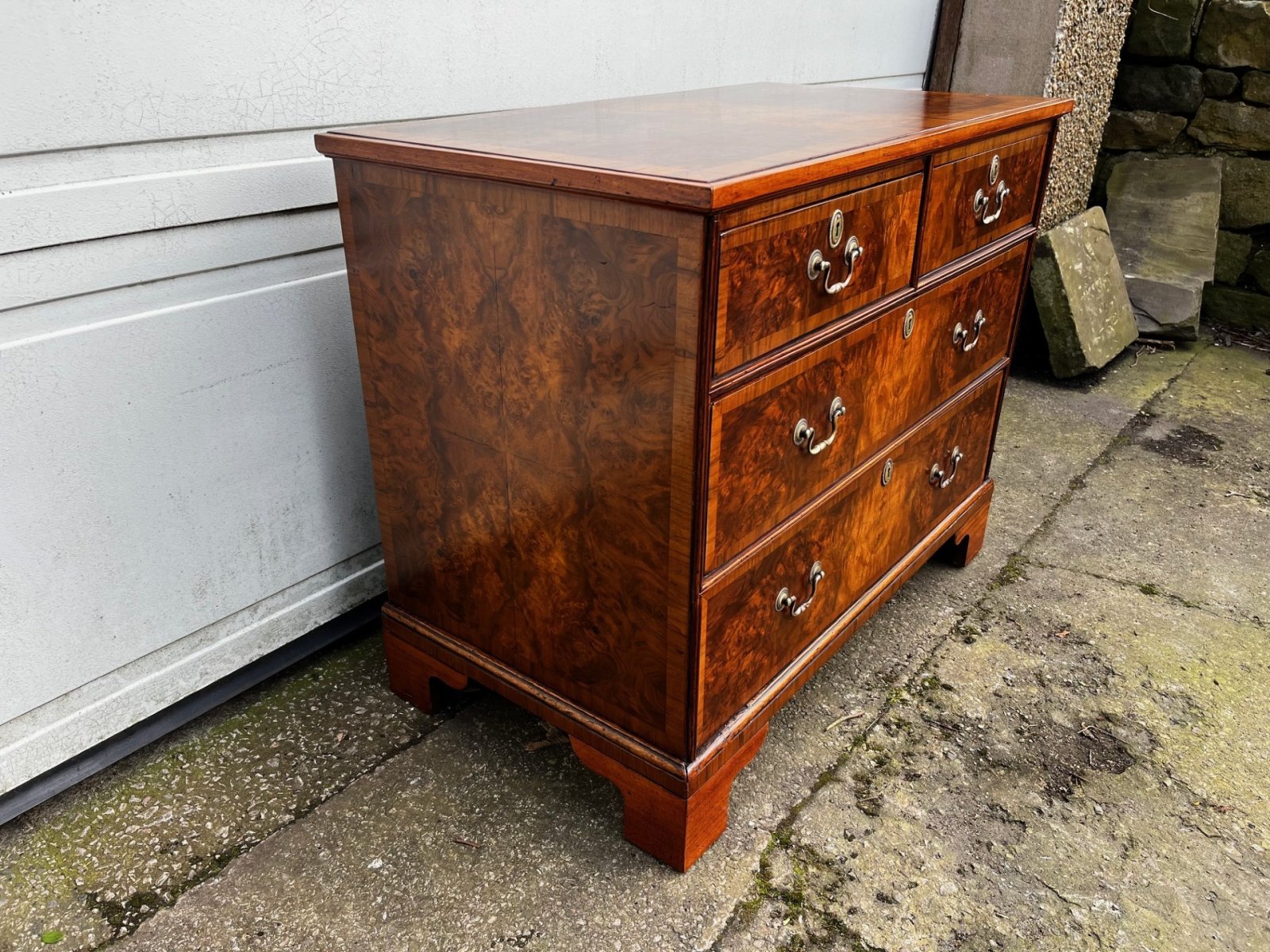 A Small 19th Century Burr Walnut Veneered Chest Of Drawers. Having a rectangular veneered burr walnut top with walnut banding above an arrangement of two short and two long rectangular oak lined drawers. The fronts veneered in burr walnut and banded in walnut with traditional brass swan neck handles and escutcheons. The sides veneered in burr walnut and raised on shaped bracket feet. English Circa 1820-1830, fully restored and re-polished ready to be placed in your home