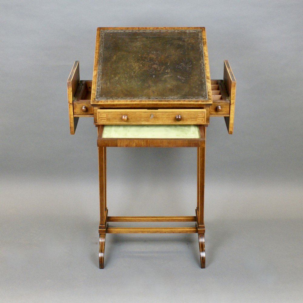 A small Regency rosewood writing table. Standing on shaped feet with tapered supports, united by stretchers and above a single frieze drawer with slide under. The top has a rising top with original leather inset writing surface and cross banded edge. To either side are satinwood banded flaps that open to reveal compartments for writing implements. The table retains its original turned wooden knobs, working lock and a very good colour and waxed patina and is in very good condition. 750mm high, 610mm wide and 400mm deep. English. Circa 1830.