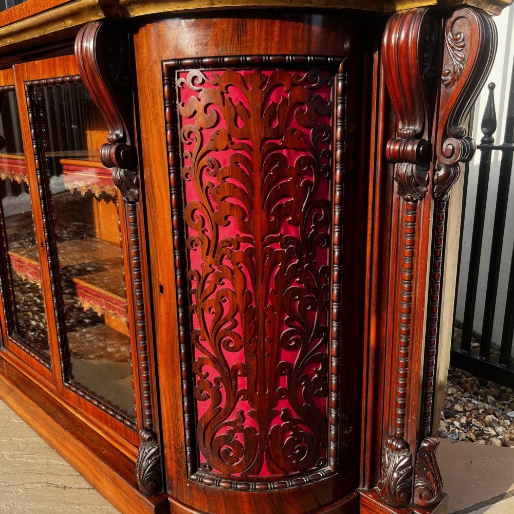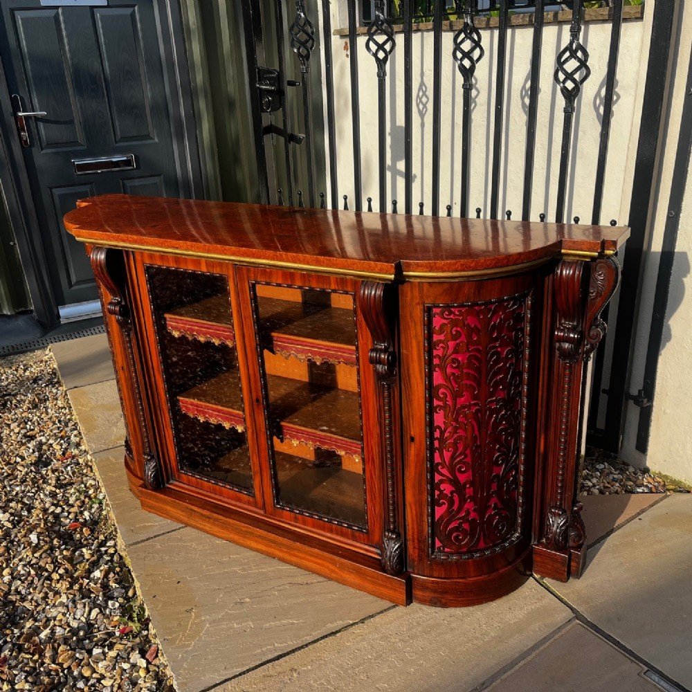 A Stunning Quality Early Victorian Period Gonçalo Alves and Amboyna bookcase/credenza. The D shaped top in beautifully figured amboyna above twin glazed central doors with sausage and pea mouldings, opening to reveal two adjustable bookshelves which retain their original leather dust covers. The ends having bowed doors with sausage and pea mouldings and wonderful pierced fretwork panels back in silk. Having finely carved corbels and acanthus leaf appliqués and raised on a shaped plinth. In stunning original condition throughout. Attributed to Gillows of Lancaster, famous for using this rare and exotic timber in their furniture production of this Period. English circa 1840-1850