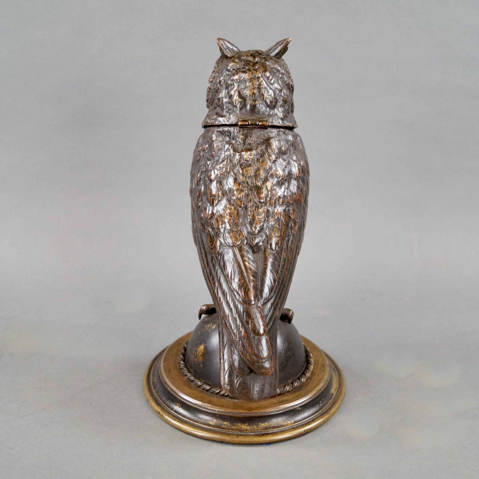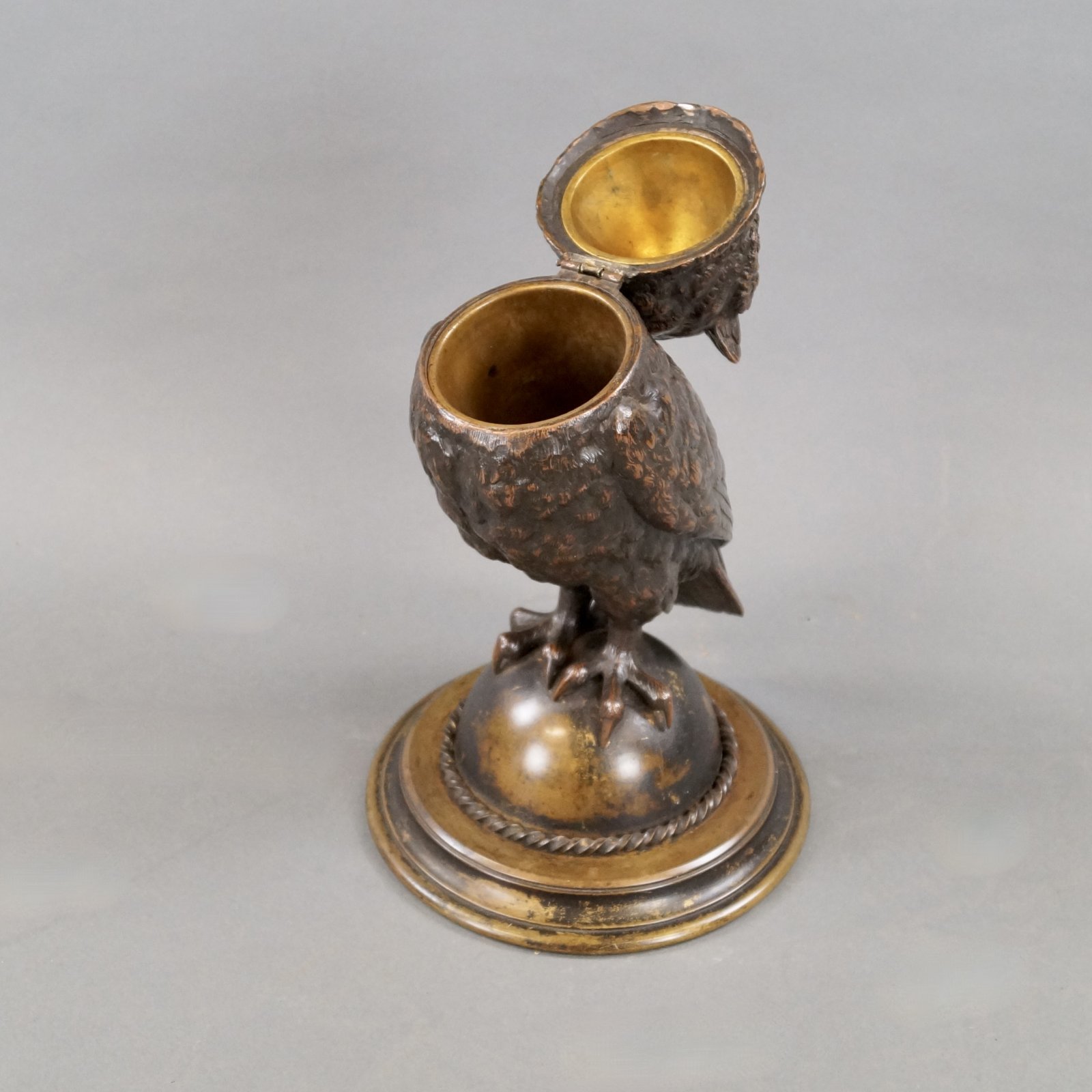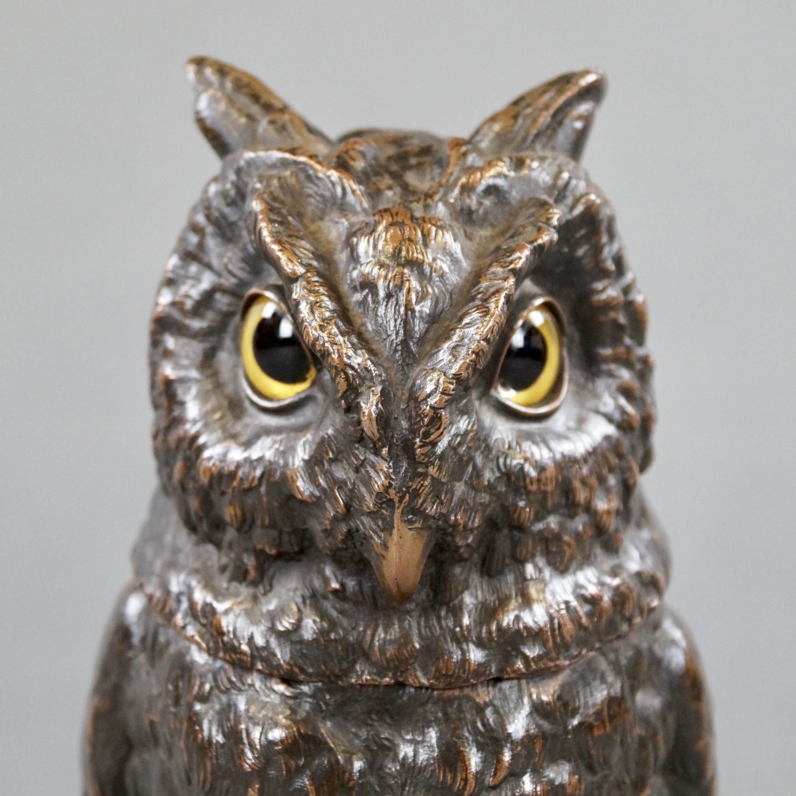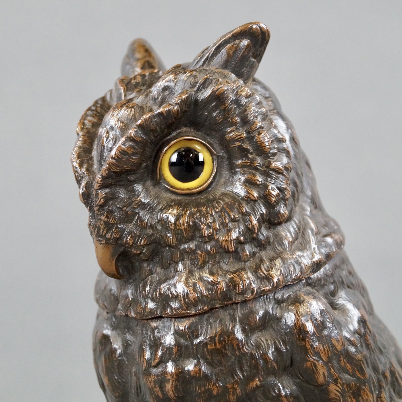 A Superb Bronze Owl tobacco jar. Dating from the late 19th century and made in Austria, this fine bronze owl measures 330mm high, 200mm wide and 220mm wide, is in very good condition and has its original glass eyes.