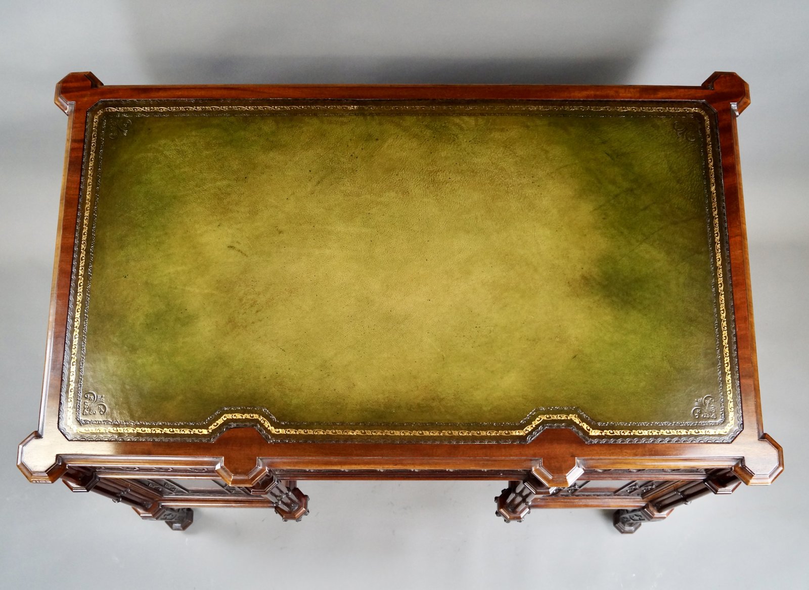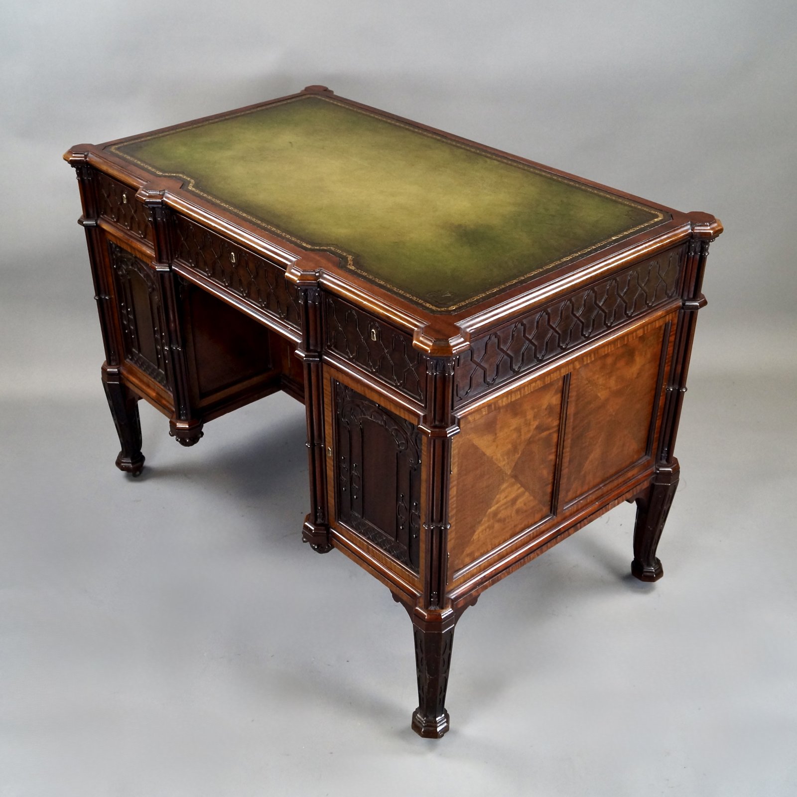 A superb mahogany Gothic revival desk. Beautifully constructed, this desk stands on short cabriole legs with pad feet and castors. To either side of the knee-hole there are cluster columns, carved panels ( concealing drawers and sliding trays) and blind fretwork to the drawer fronts. The ends and back are further decorated with parquetry panels and fretwork. The top has a molded and banded edge and an inset vellum green leather writing surface with gilt and blind tooling. The desk also has a full compliment of working Bramah locks and two keys. A very high quality piece in terms of materials used and craftsmanship. In very good and original condition. 790mm high, 1090mm wide and 650mm deep. English. Circa 1890.