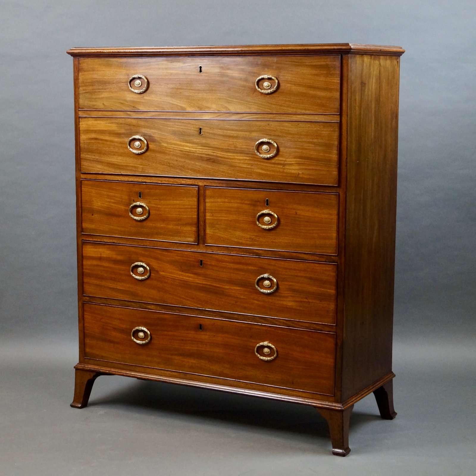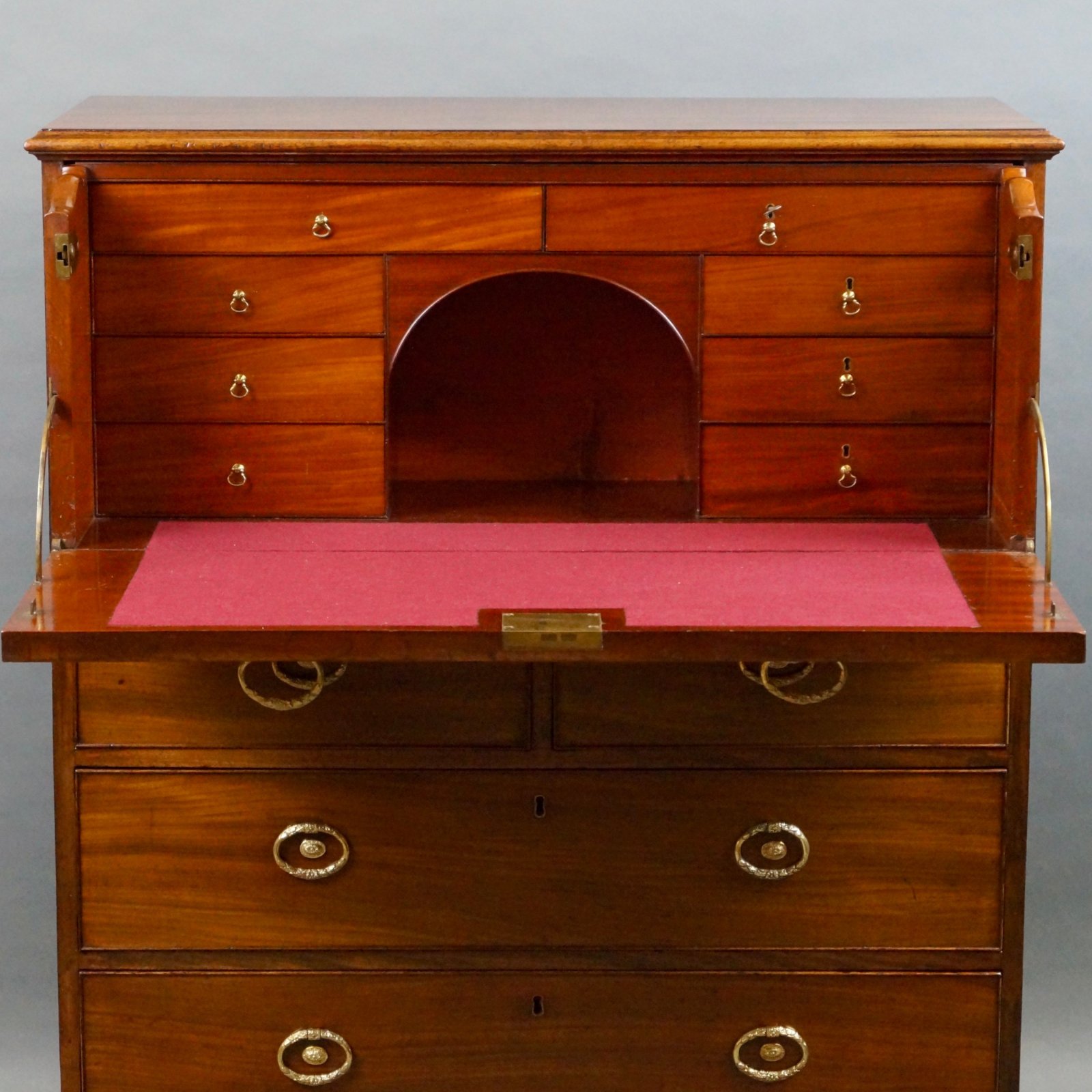 Raised on fine shaped feet, above which are 2 short and 2 long oak lined, cock beaded drawers and a secretaire drawer, with an interior of small drawers and an arched pigeon hole, all with original, distinctively Gillows brass handles. The chest is in fine quality mahogany, retains all its original elements and has a good colour and patina. 1140mm high, 940mm wide and 410mm deep. English. Circa 1790.