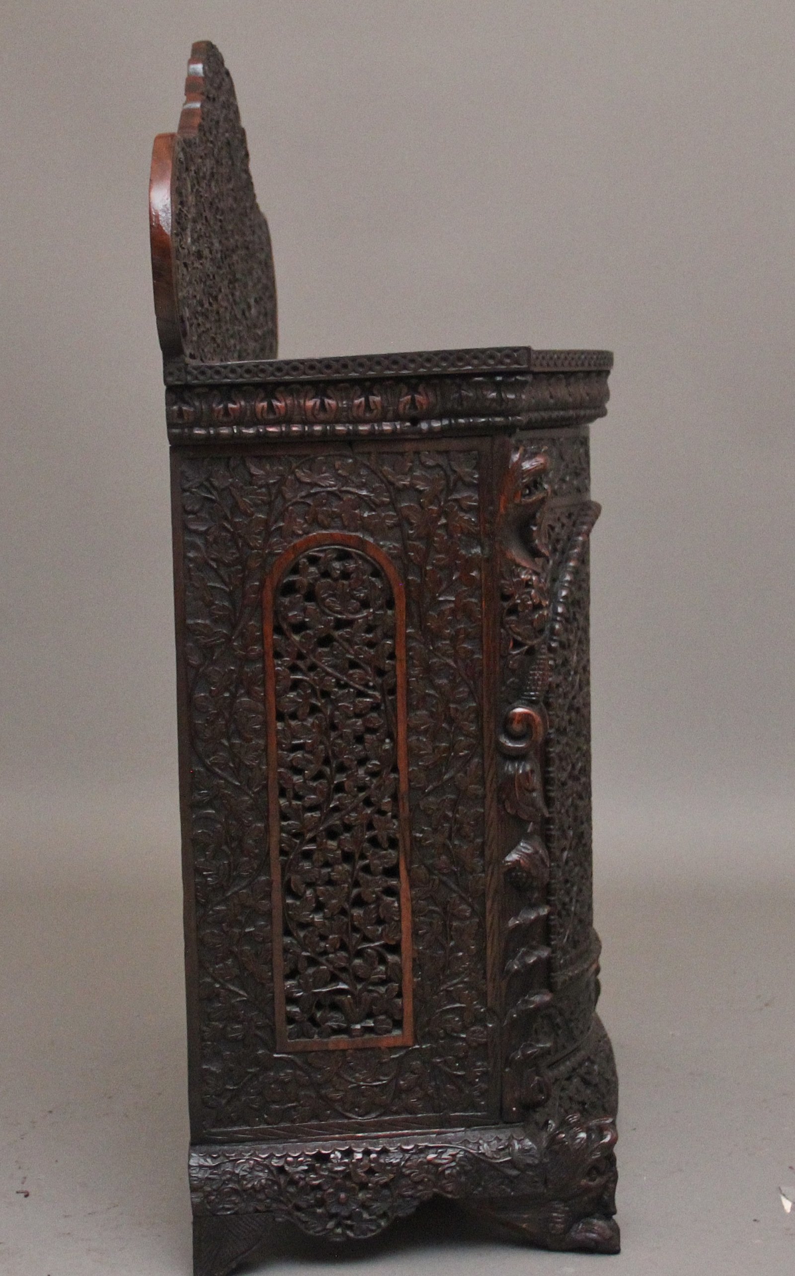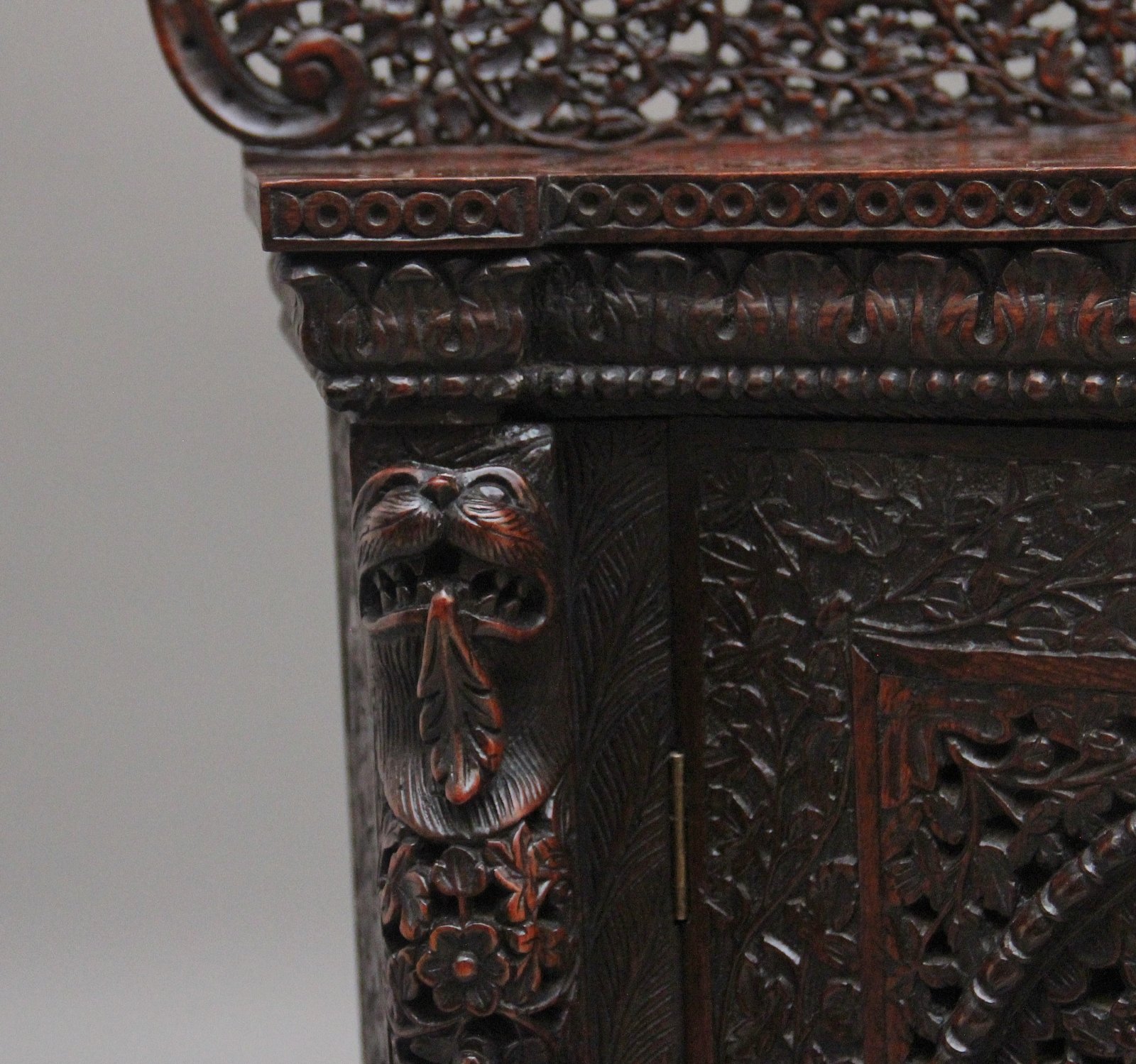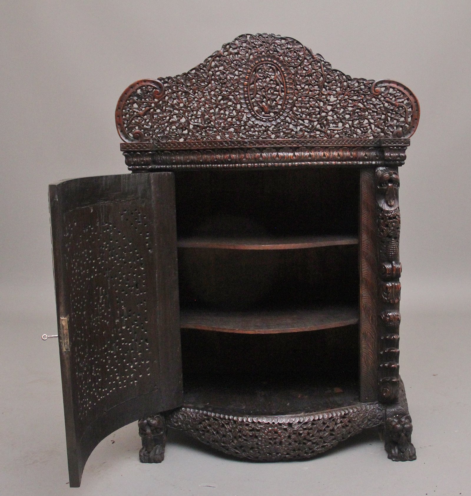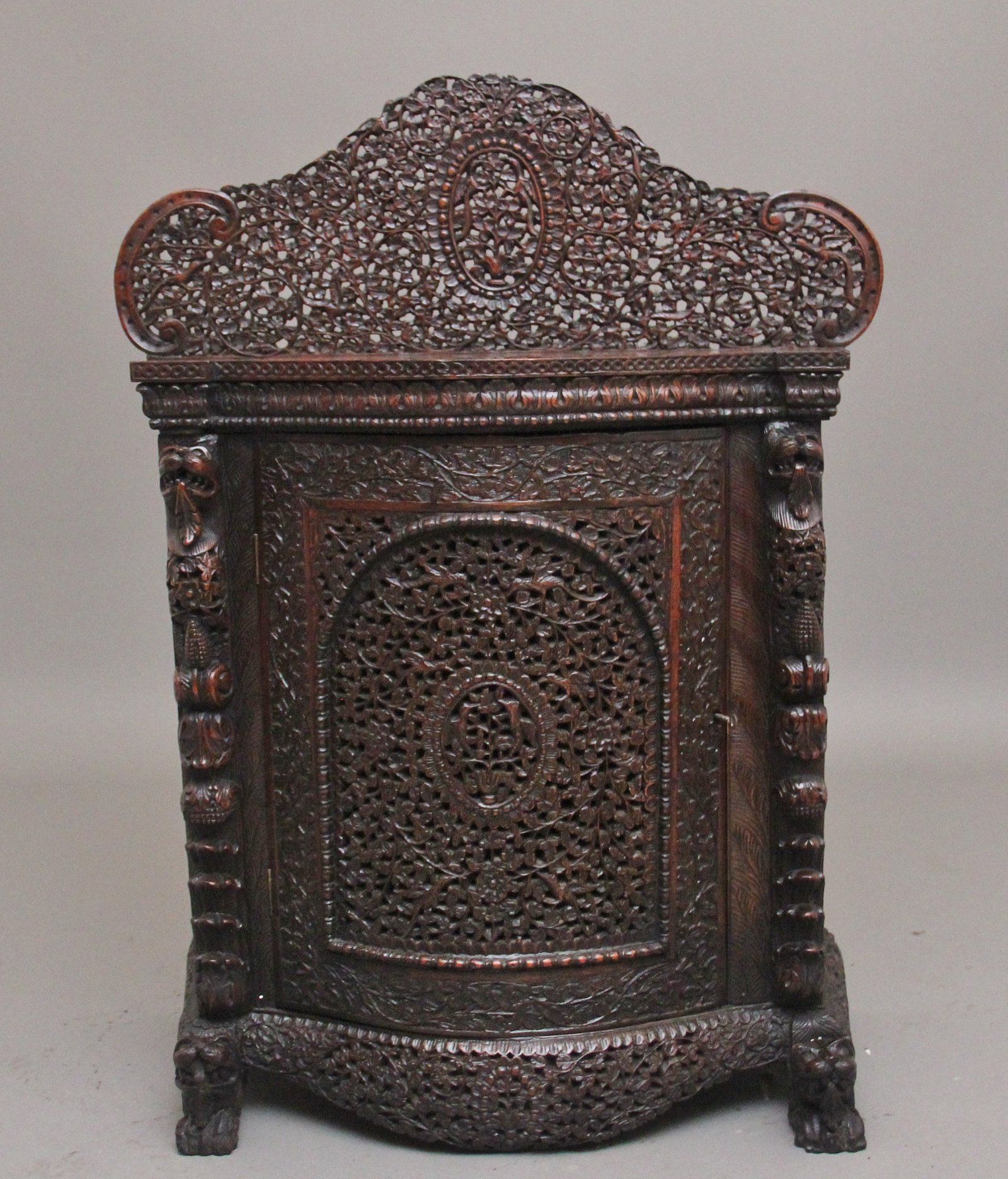 A superb quality mid 19th Century Anglo-Indian carved hardwood cabinet, having a nice figured shaped top with a highly decorative pierced and carved upstand consisting of various foliage with an oval panel at the centre with a pair of cranes, C shapes incorporating decorative scroll at either side, the top having an intricate carved edge with a frieze below with acanthus leaf carving, a single door below opening to reveal two shelves inside, the door front profusely carved all over with further foliage, central arched panel pierced and carved with further foliage and various birds and a decorative oval panel at the centre, intricate carved columns either side incorporating mythical figure heads, fruit and scrolls, lovely shaped and carved apron and supported on further mythical figure heads. Wonderful crisp carving and in excellent condition, Circa 1840.