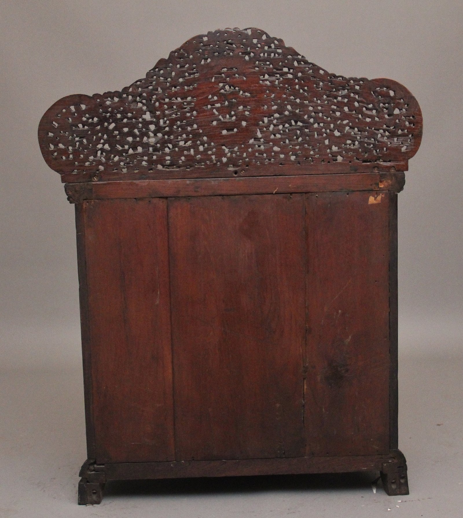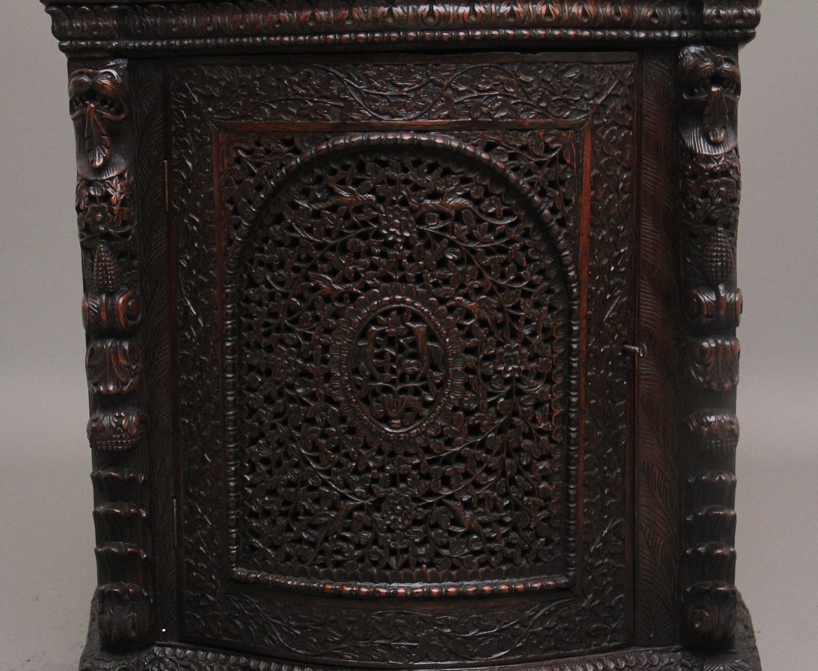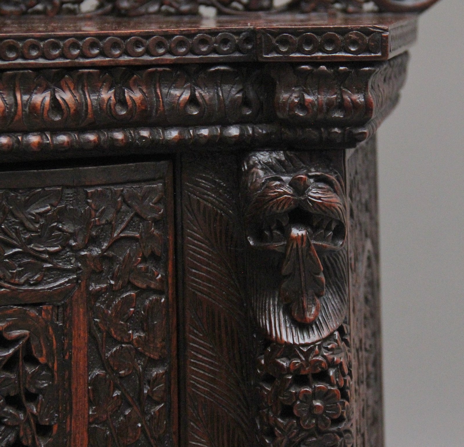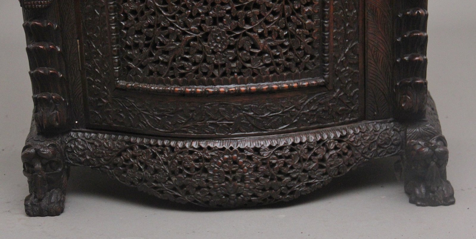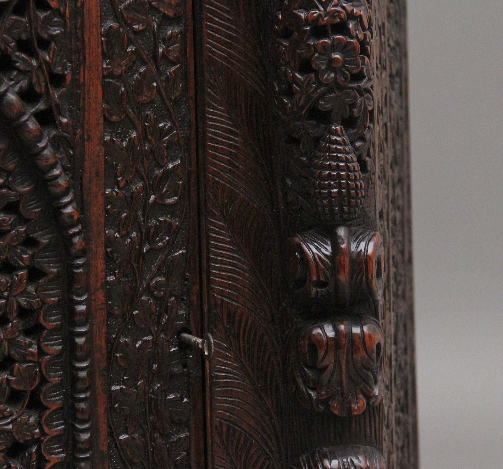 A superb quality mid 19th Century Anglo-Indian carved hardwood cabinet, having a nice figured shaped top with a highly decorative pierced and carved upstand consisting of various foliage with an oval panel at the centre with a pair of cranes, C shapes incorporating decorative scroll at either side, the top having an intricate carved edge with a frieze below with acanthus leaf carving, a single door below opening to reveal two shelves inside, the door front profusely carved all over with further foliage, central arched panel pierced and carved with further foliage and various birds and a decorative oval panel at the centre, intricate carved columns either side incorporating mythical figure heads, fruit and scrolls, lovely shaped and carved apron and supported on further mythical figure heads. Wonderful crisp carving and in excellent condition, Circa 1840.