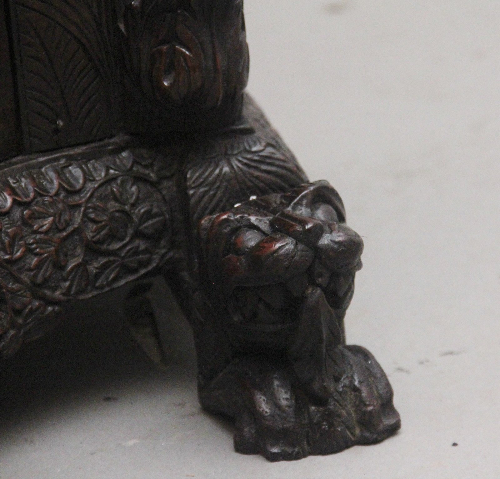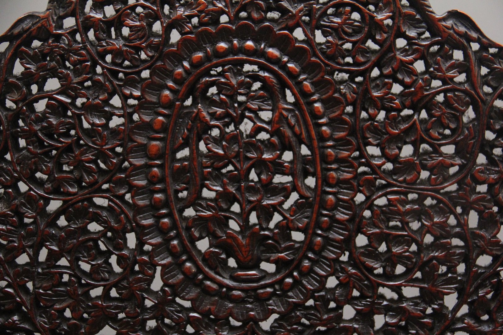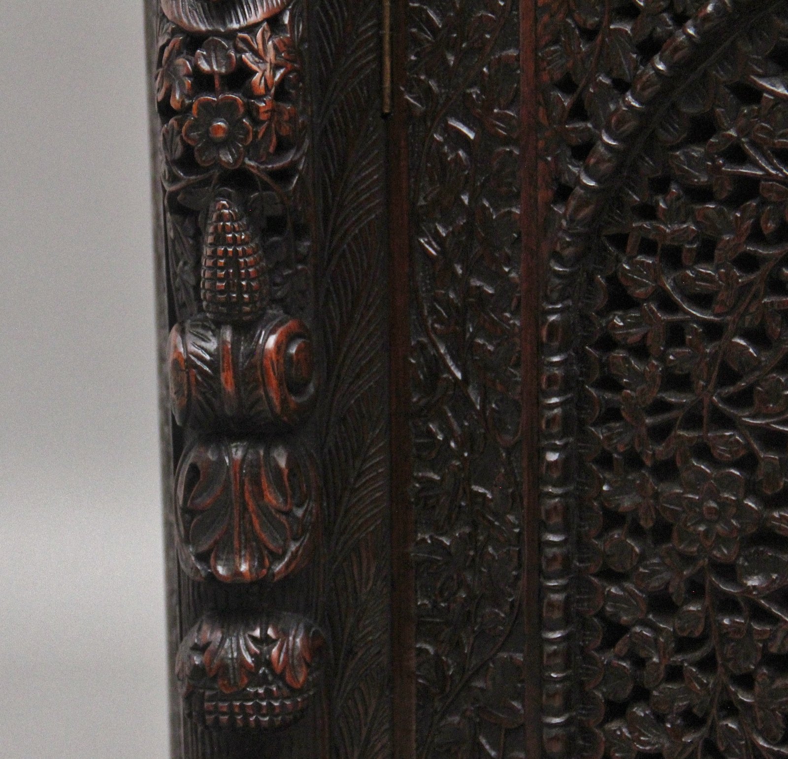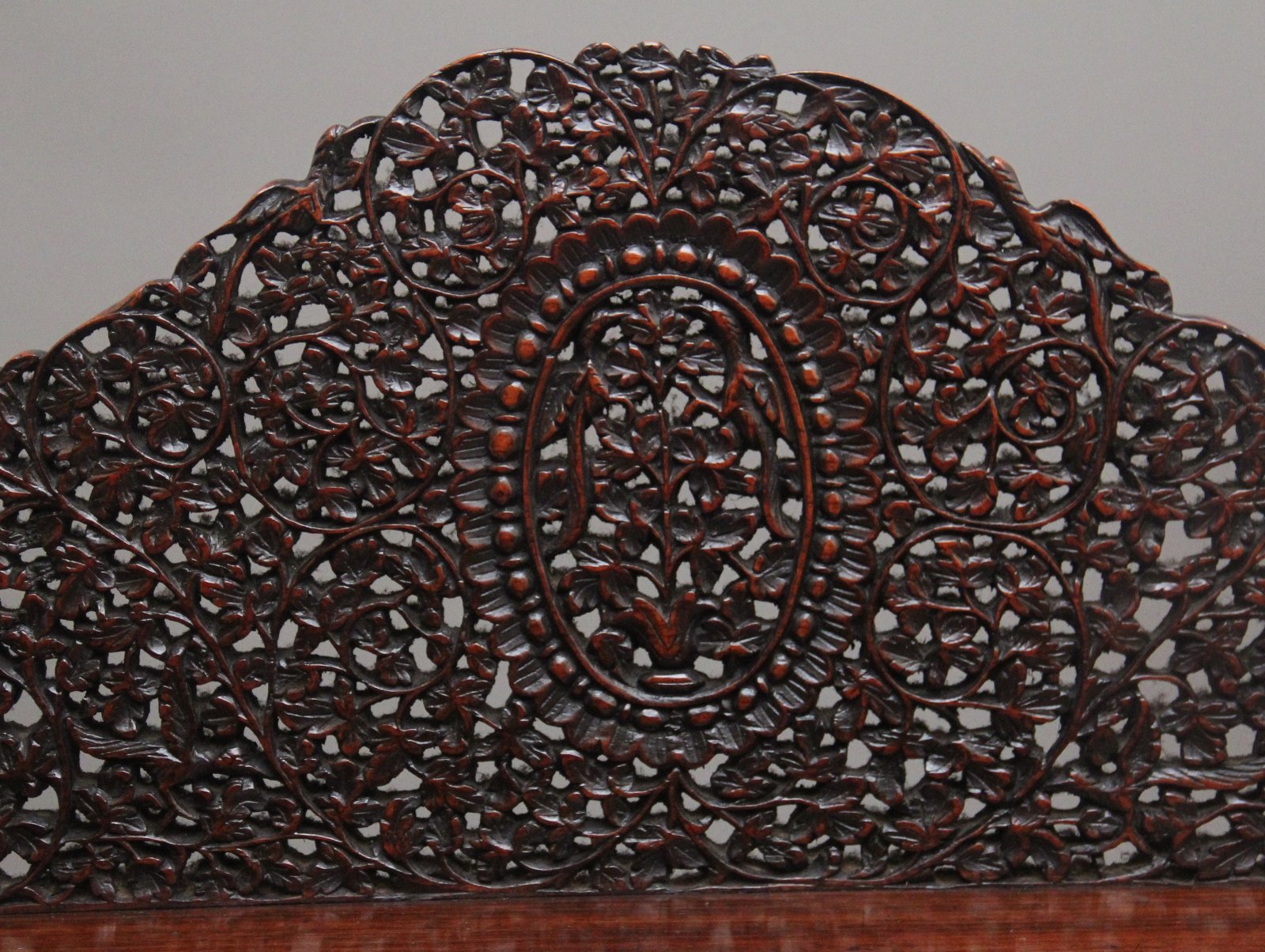 A superb quality mid 19th Century Anglo-Indian carved hardwood cabinet, having a nice figured shaped top with a highly decorative pierced and carved upstand consisting of various foliage with an oval panel at the centre with a pair of cranes, C shapes incorporating decorative scroll at either side, the top having an intricate carved edge with a frieze below with acanthus leaf carving, a single door below opening to reveal two shelves inside, the door front profusely carved all over with further foliage, central arched panel pierced and carved with further foliage and various birds and a decorative oval panel at the centre, intricate carved columns either side incorporating mythical figure heads, fruit and scrolls, lovely shaped and carved apron and supported on further mythical figure heads. Wonderful crisp carving and in excellent condition, Circa 1840.