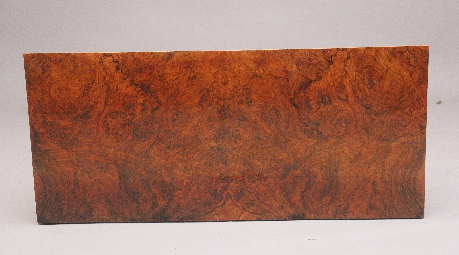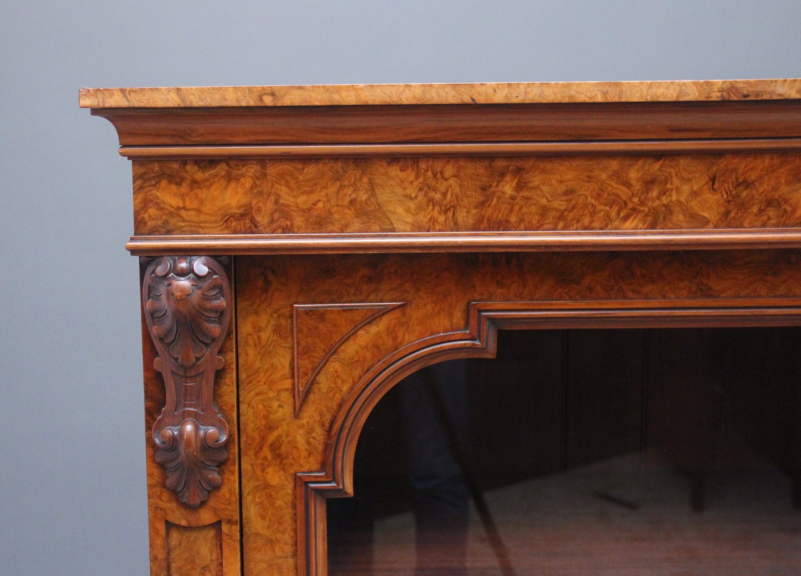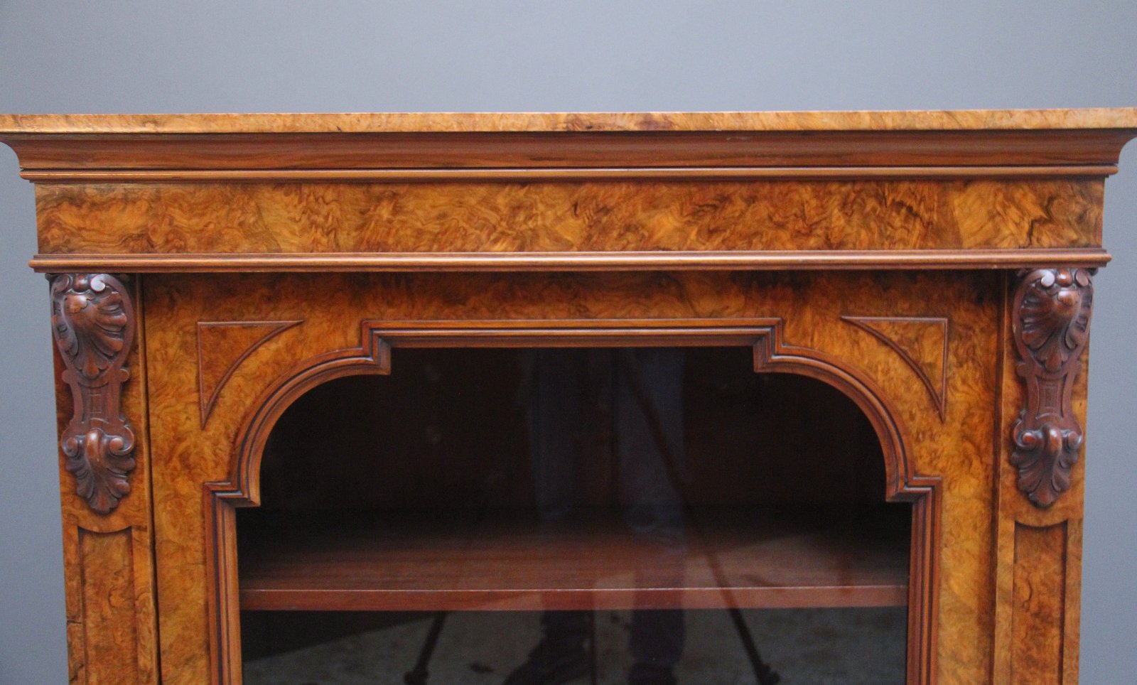 A large and impressive 19th Century burr walnut bookcase/cabinet, having a wonderful figured stepped top above a single shaped panelled glazed door with a double moulded edge with raised triangular decoration in the top corners, opening to reveal three adjustable shelves, columns either side with bold carved decoration at the top on either side, raised on a moulded plinth base. Wonderful burr walnut figuration throughout including the sides of the cabinet, a truly remarkable piece of furniture. Circa 1850.