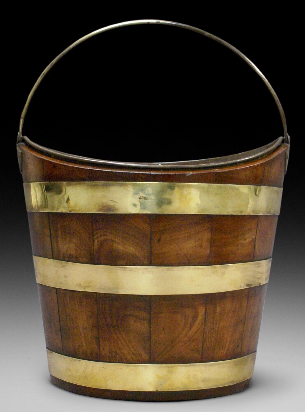 A fine quality Georgian oval bucket in beautifully selected and butterfly matched Cuban mahogany and with brass bands, carrying handle and later liner. In good condition and of excellent colour and patina. 340mm high, 370mm wide and 280mm deep. Circa 1790.