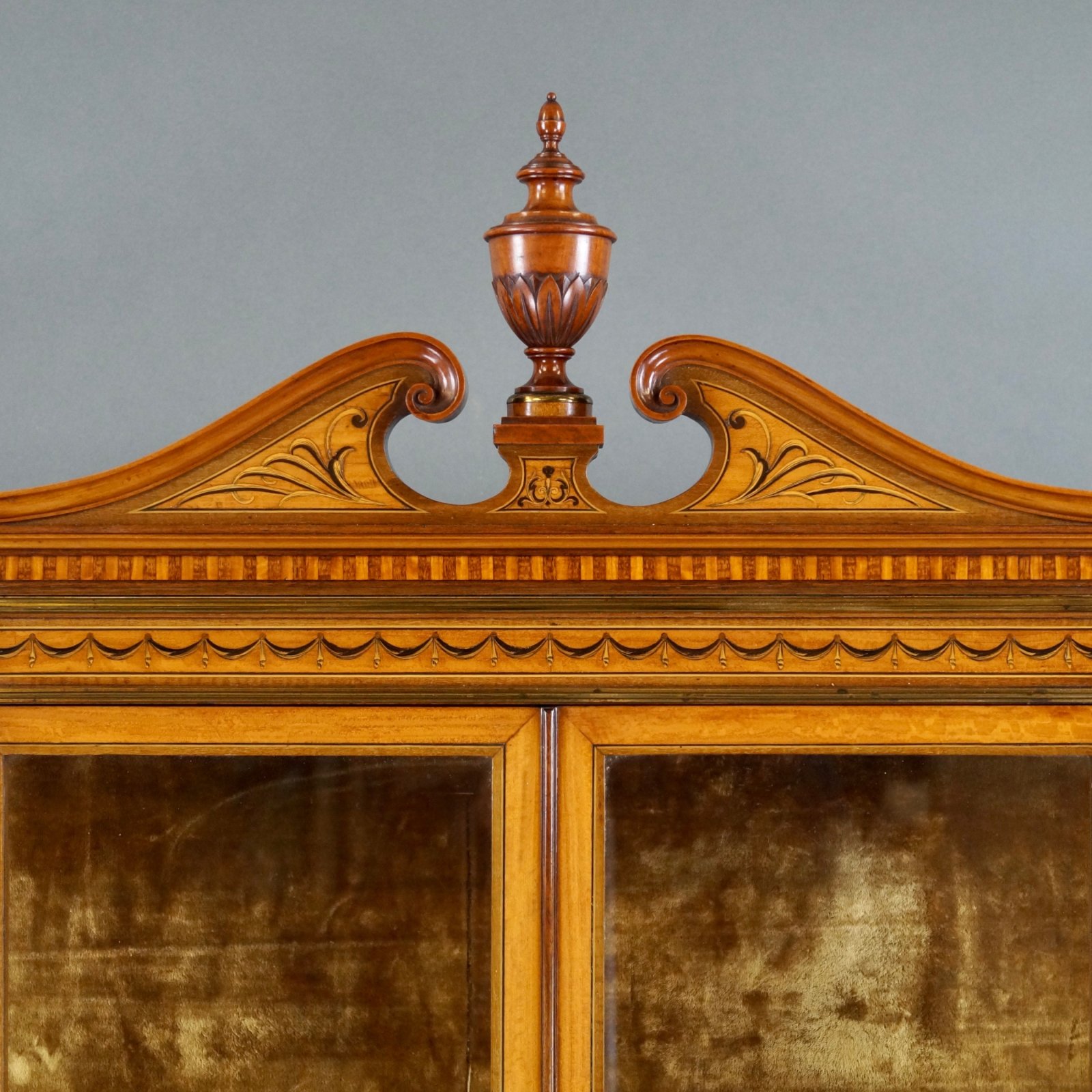 A superb quality West Indian satinwood & marquetry display cabinet. Constructed to the highest cabinet making standards, the cabinet stands on turned feet with curved glazed sides and a central door enclosing a single plate glass shelf and mirrored back. The top is similarly shaped but with a pair of doors, a single shelf and velvet lined back. The cabinet is beautifully inlaid with a variety of hardwoods in the form of Harebells, swags, patera, foliate designs and Griffons and is topped with a swan-neck cornice and carved vase shaped urn. In very good and original condition. 1930mm high, 1020mm wide and 380mm deep. English. Circa 1880.