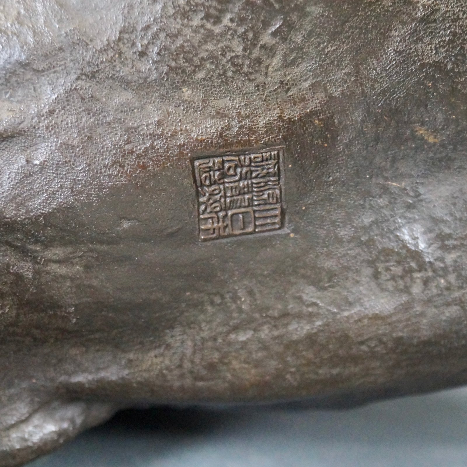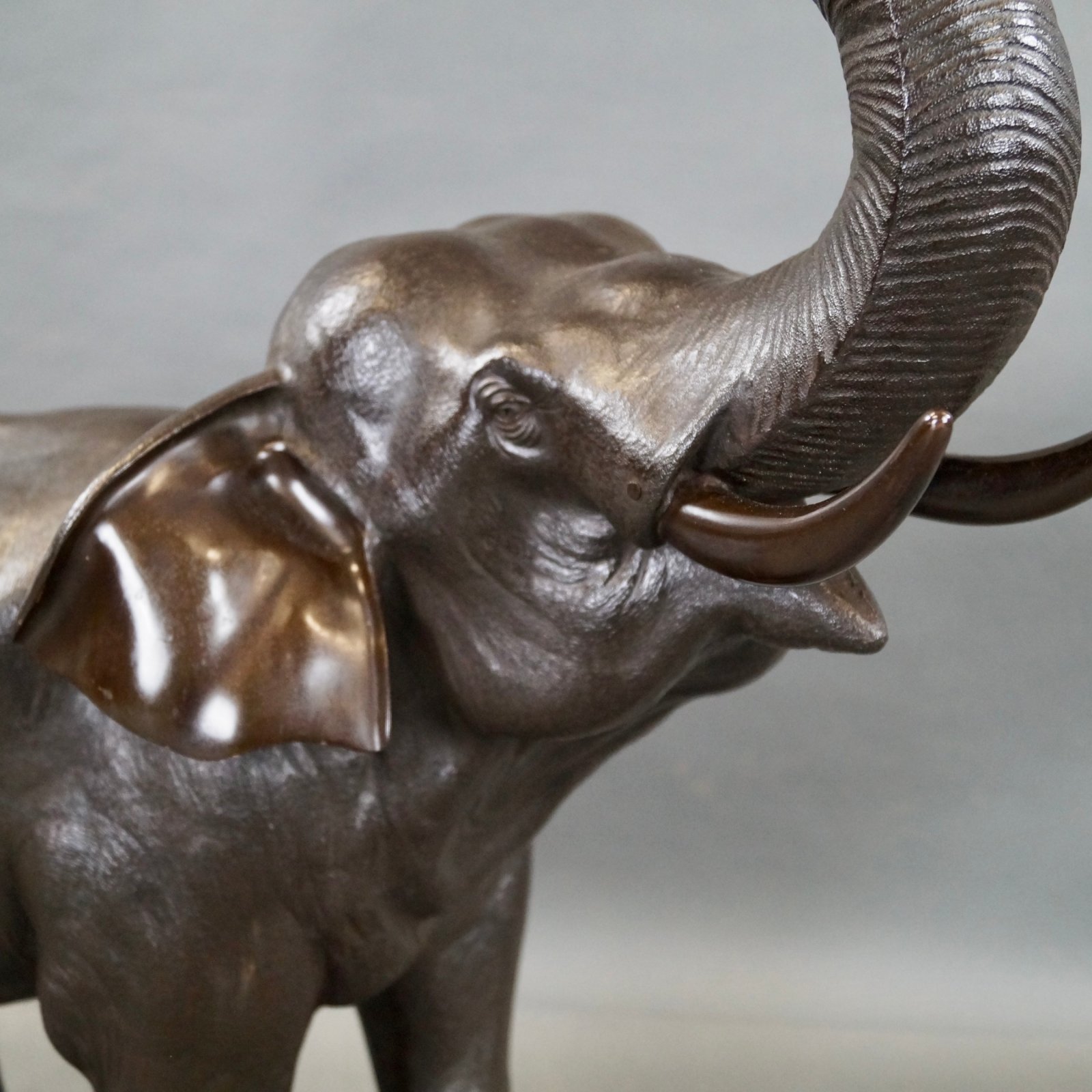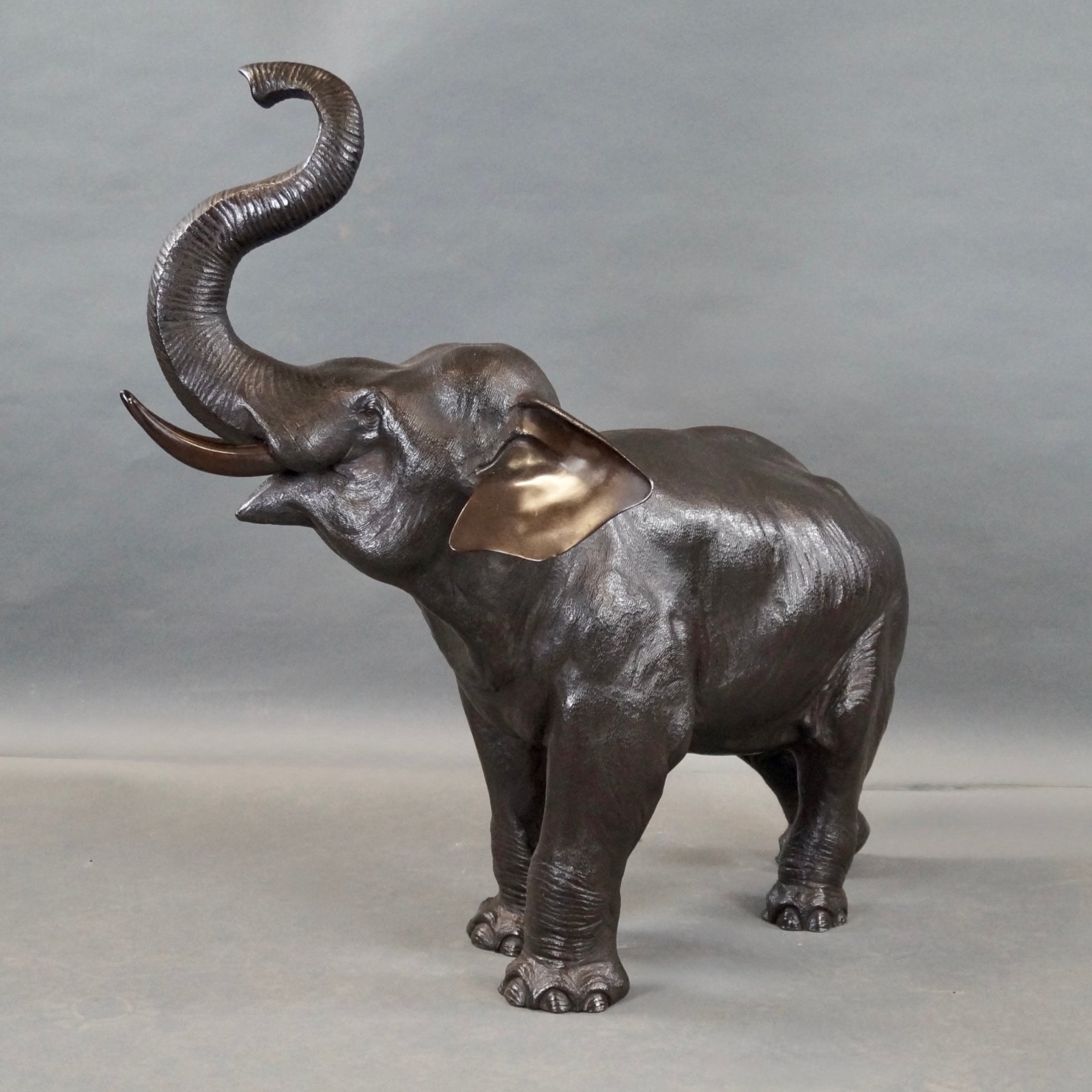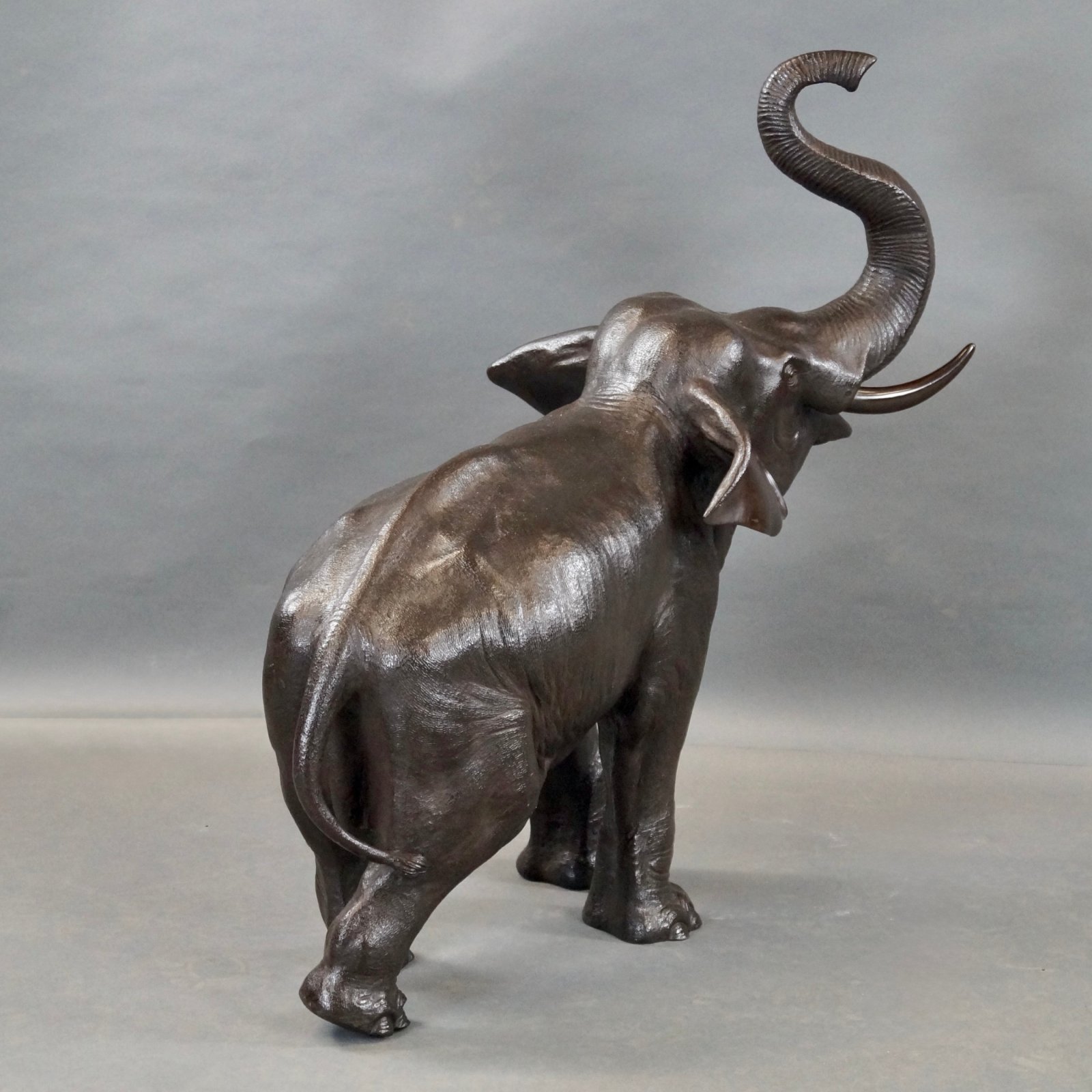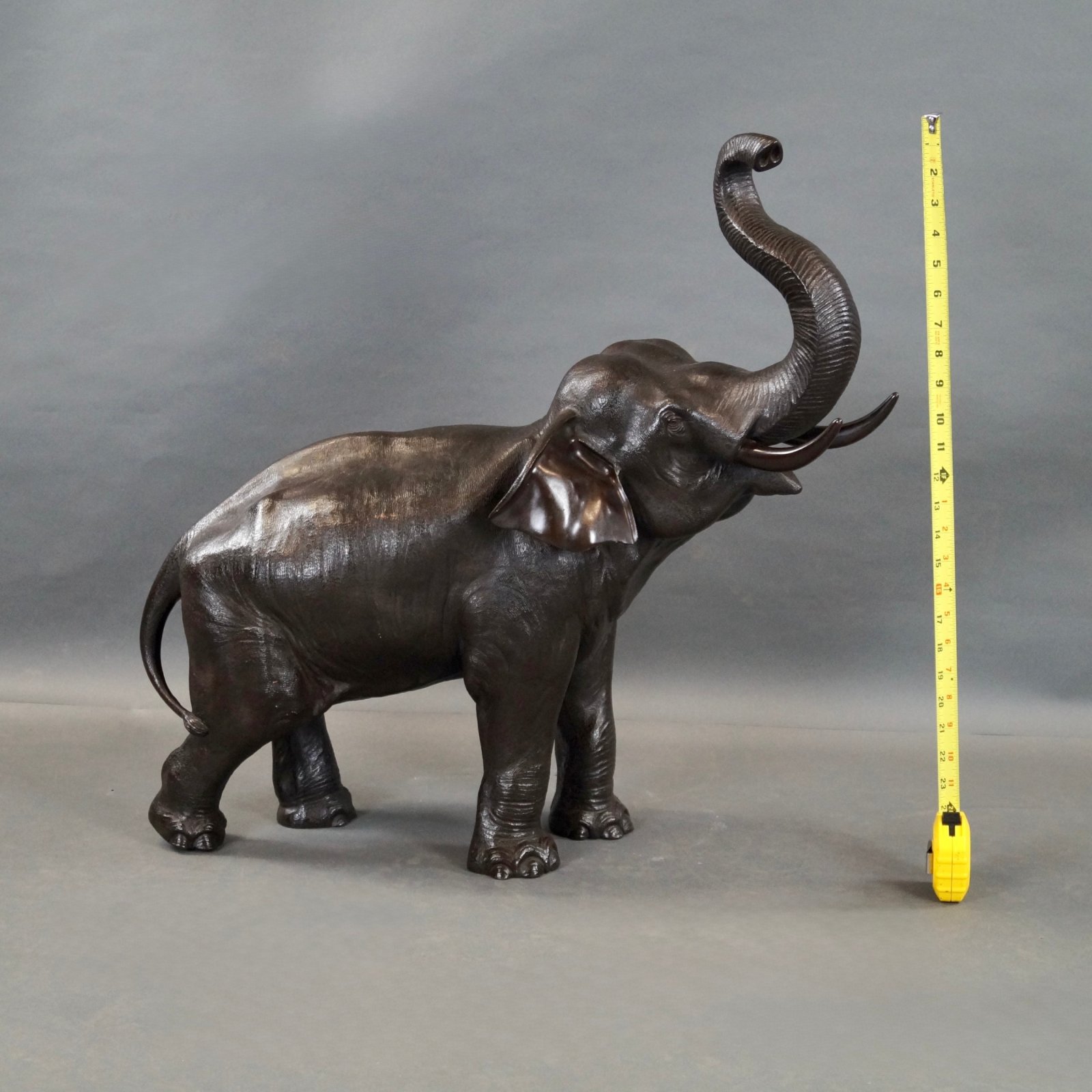 A very large Japanese Meiji period Bronze Elephant okimono. This exceptionally imposing bronze stands 660mm (26'') tall with trunk raised, (a symbol of good luck) and has a lovely textured surface and patina. In very good and original condition and singed underneath. 660mm high, 690mm wide and 350mm deep. Japan. Circa 1880.
