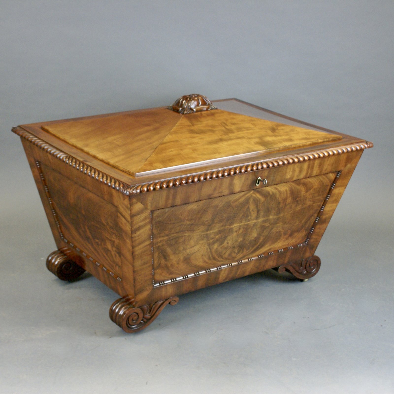A very large Regency mahogany sarcophagus wine cooler. In exceptional and original condition and with a great colour, this wine cooler or cellarette is capable of holding up to 30 bottles. It is raised on carved scroll feet with brass castors and has flame mahogany panels all round. The top has a carved gadrooned molding and a central foliate carved embellishment. 610mm high, 890mm wide and 660mm deep. English. Circa 1830.