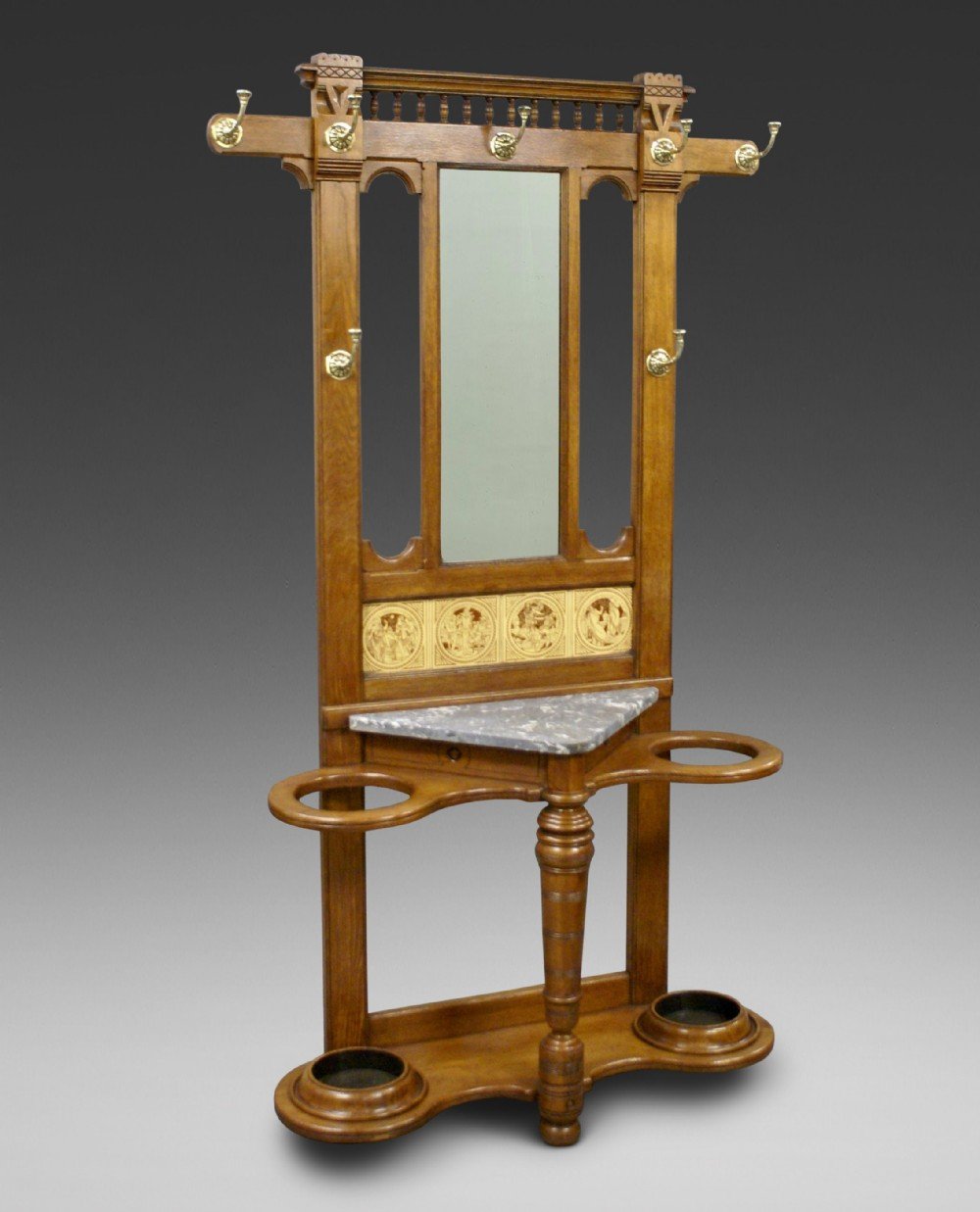 A Victorian hall stand in English Oak with original tiled back, mirror, marble and brass coat/hat hooks. In very good condition. 2070mm high, 1070mm wide and 370mm deep. English. Circa 1870