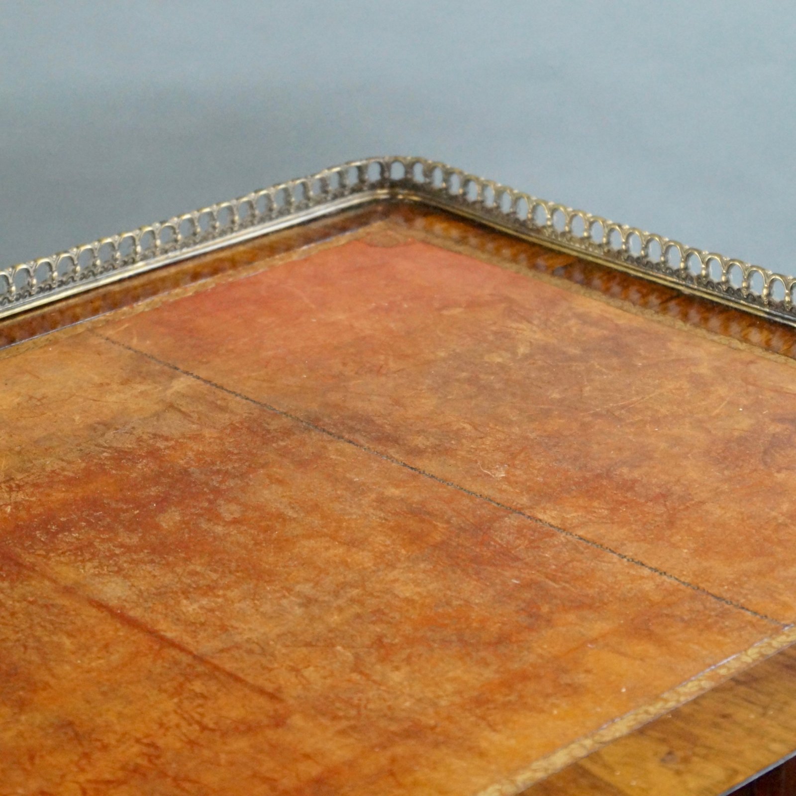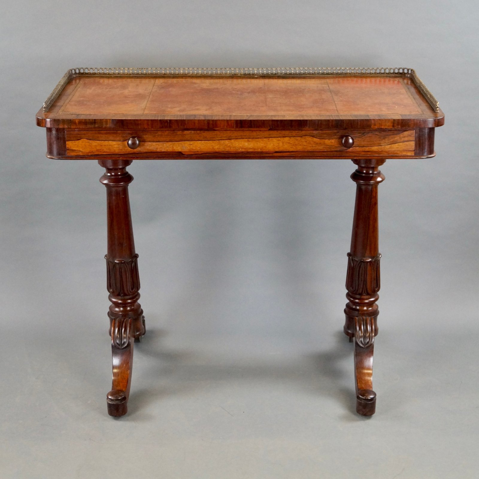 A Victorian Rosewood writing table. Raised on turned and carved end supports with cabriole legs and concealed castors. Above is a single frieze drawer and dummy on the reverse all with original turned wooden knobs. The cross-banded top has an inset leather writhing surface and decorative brass gallery. In very good and original condition. 760mm high, 920mm wide and 510mm deep.English. Circa 1850.