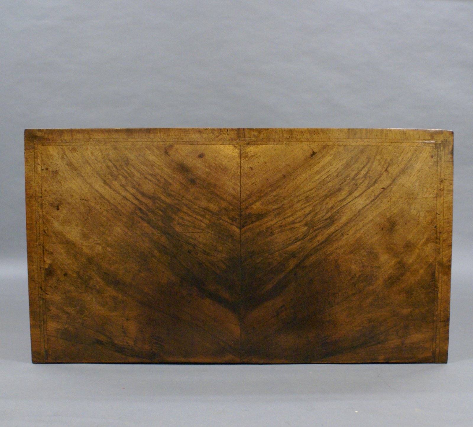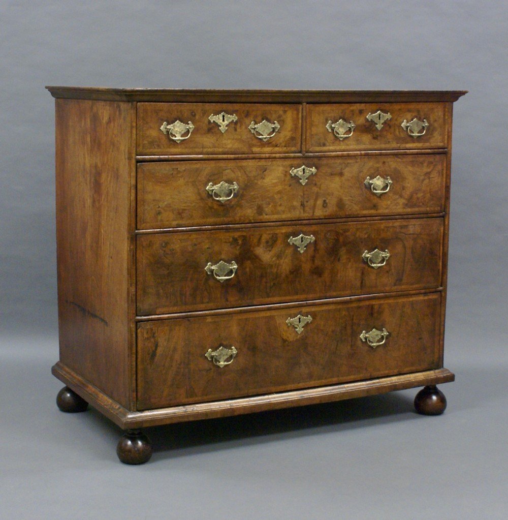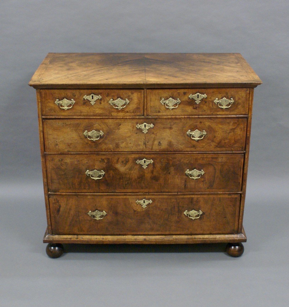 A William & Mary chest of drawers in well figured walnut, raised on on bun feet (later replacements) and with cross grain moldings and feather banding. The two short and three long drawers are oak lined drawers with brass drop handles (19th century replacements) and original steel locks. The book matched top is also feather and crass banded. In very good condition and of good colour. 930mm high, 1040mm wide and 570mm deep. English. Circa 1700