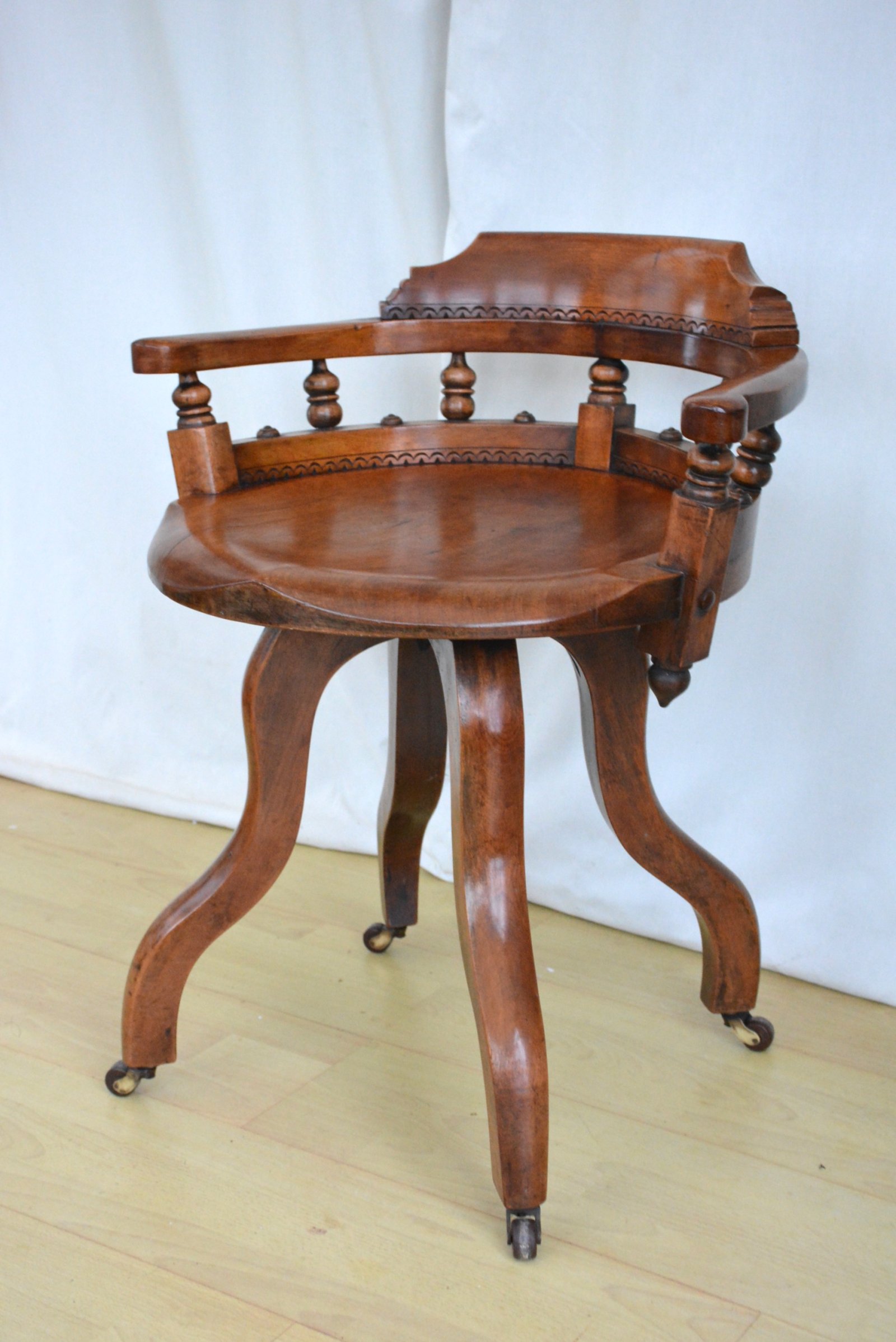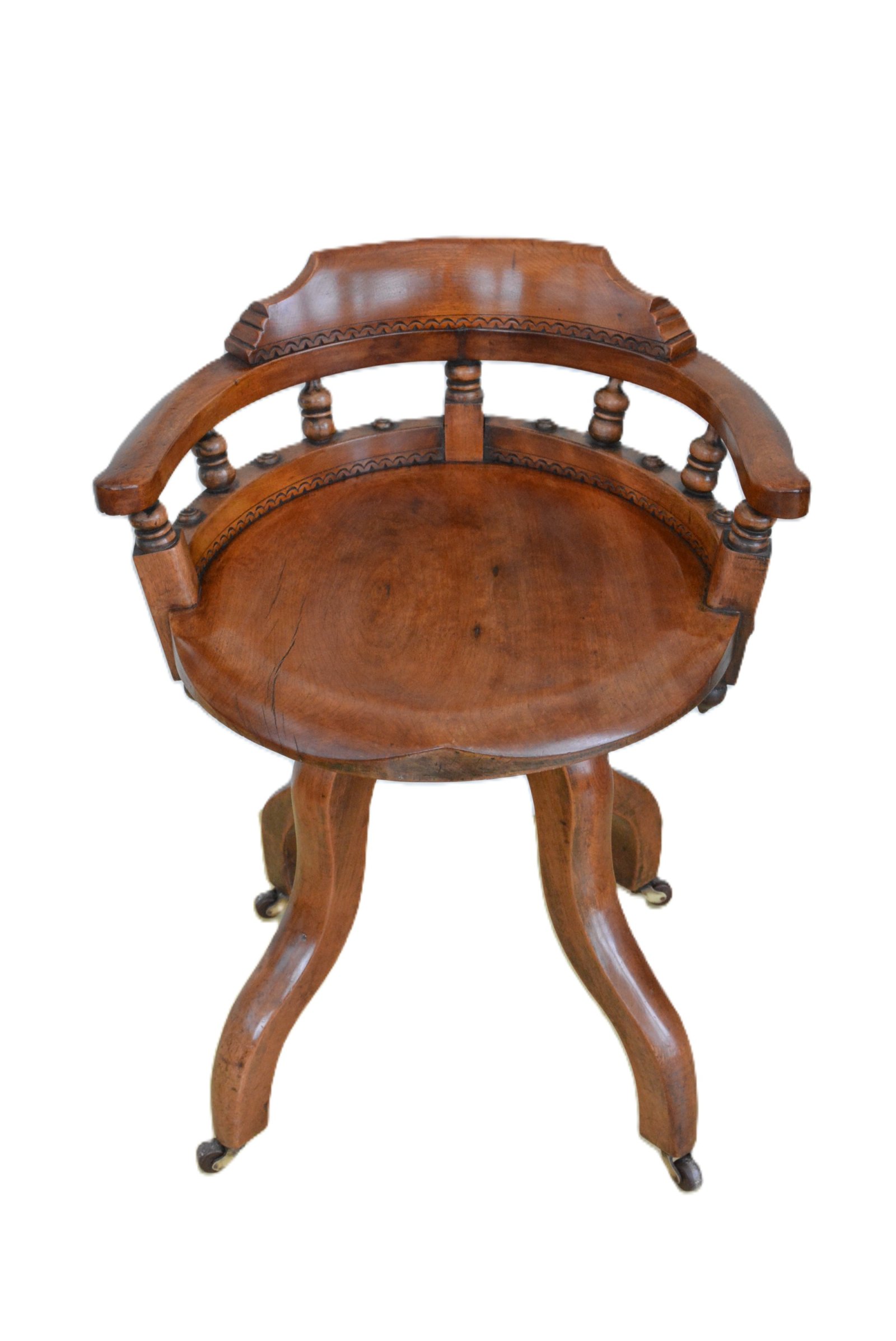 K0639 Very stylish and comfortable Aesthetic Movement revolving desk chair in walnut, having shaped and carved top rail with a detailed fan carving and figured walnut outswept arms, all supported and carved spindles and terminating in a single plank figured walnut saddle seat. The chair is raised on four solid walnut cabriole legs fitted with original revolving mechanism in good order, all terminating in original brass castors. This antique chair is in home ready condition. Solid, sturdy, woodworm free. c1880