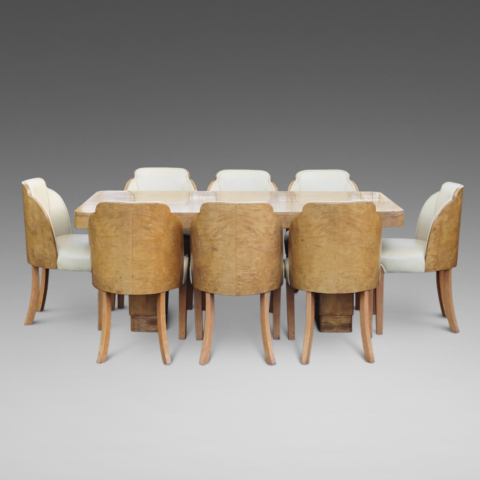 Harry & Lou Epstein Cloud Dining Suite in burr maple. Comprising of eight chairs, upholstered in cream leather and matching dining table with plate glass top. In original condition having been in the same ownership for the past 70 years. table dimensions 750mm high, 1830mm wide and 910mm deep. English. Circa 1935.
