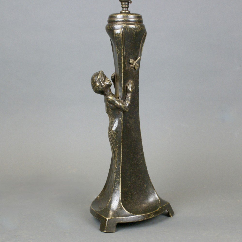An Art Nouveau bronze table lamp. Raised on a triform base with a young woman in a flowing dress peaking around at a dragonfly. 640mm high (including shade) 180mm wide and 180mm deep. (excluding shade) French. Circa 1910.