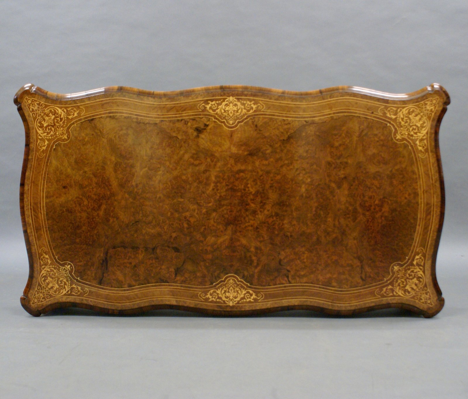 An English ormolu mounted bureau plat possibly by Gillows. In burr walnut, tulip-wood and amaranth and raised on cabriole legs with fine quality ormolu mounts and sabot feet. The shaped frieze has a central drawer with dummies either side and the the reverse. The shaped top is in beautifully book matched burr walnut with a marquetry inlaid border and a goncalo alves, cross grain molded edge. In very good condition. 740mm high, 1270mm wide and 700mm deep. English. Circe 1860.