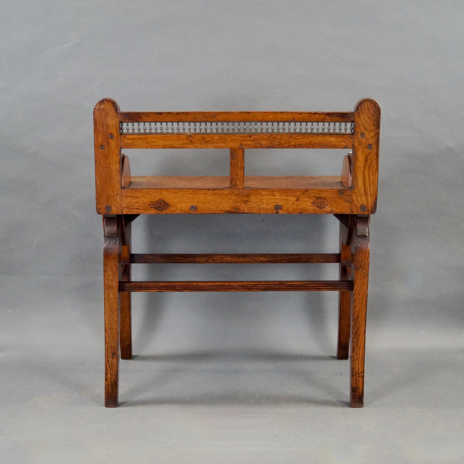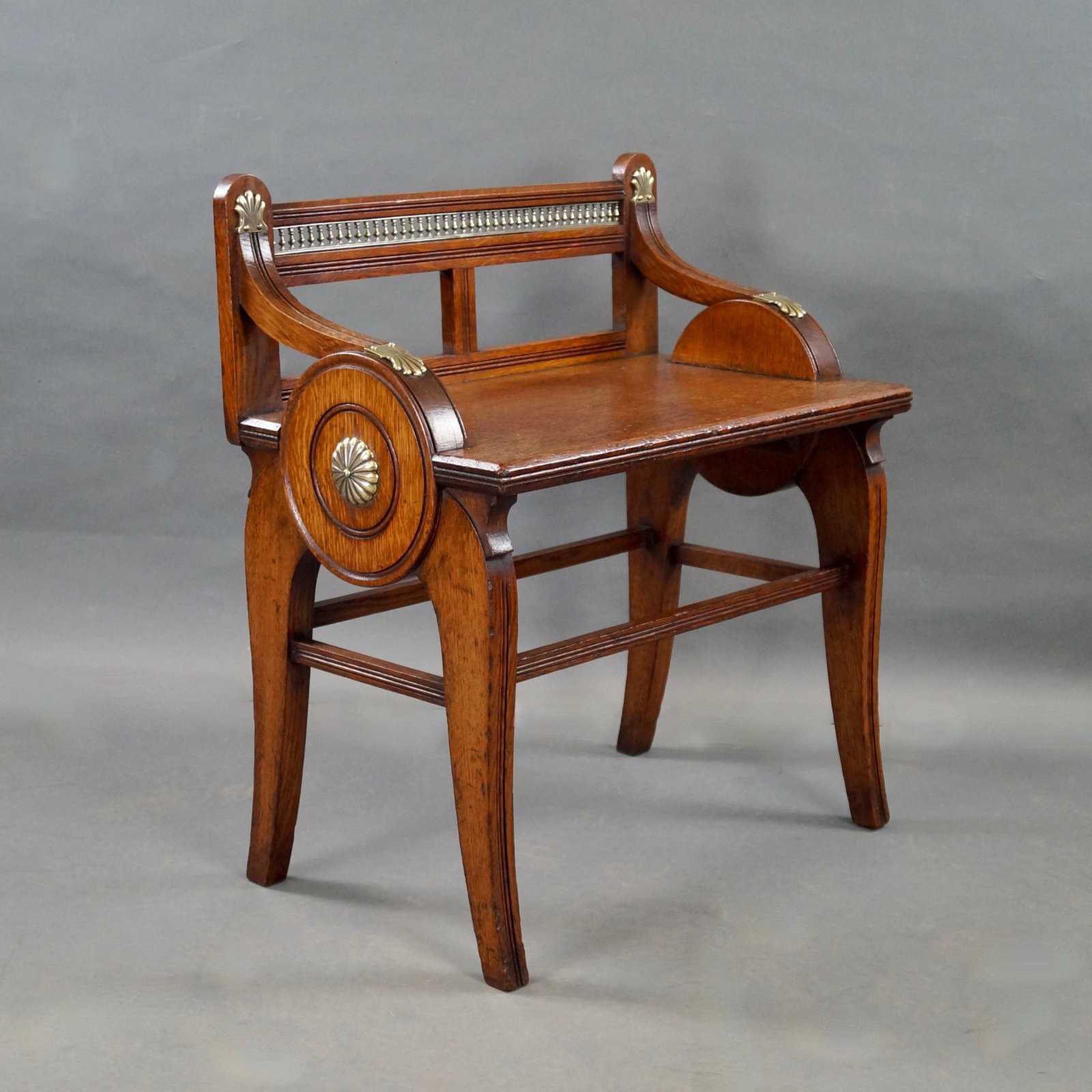 An oak and brass mounted hall bench by James Shoolbred & Co. In very good and original condition and bearing the registered design mark on the back rail. 630mm high, 560mm wide and 330mm deep. English. Circa 1885.