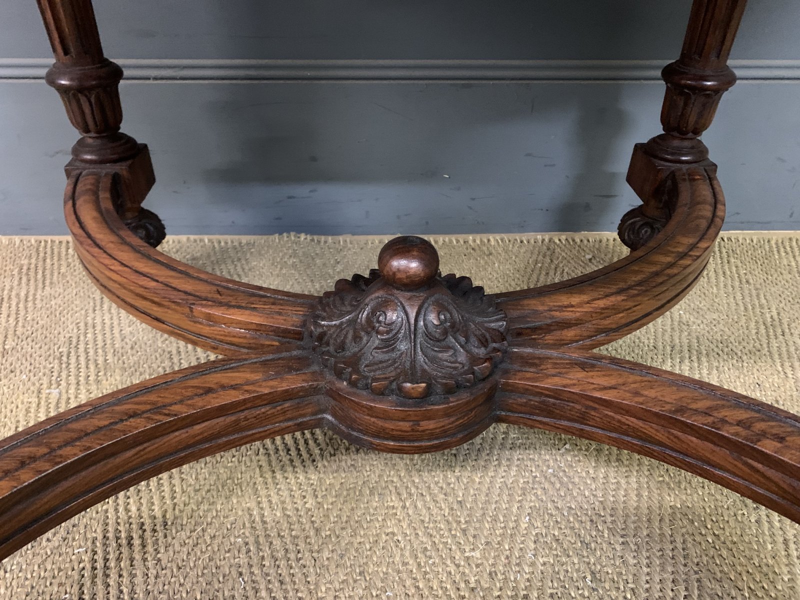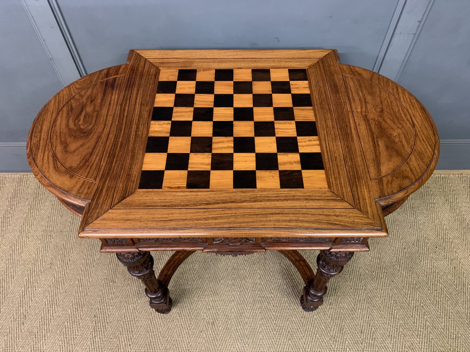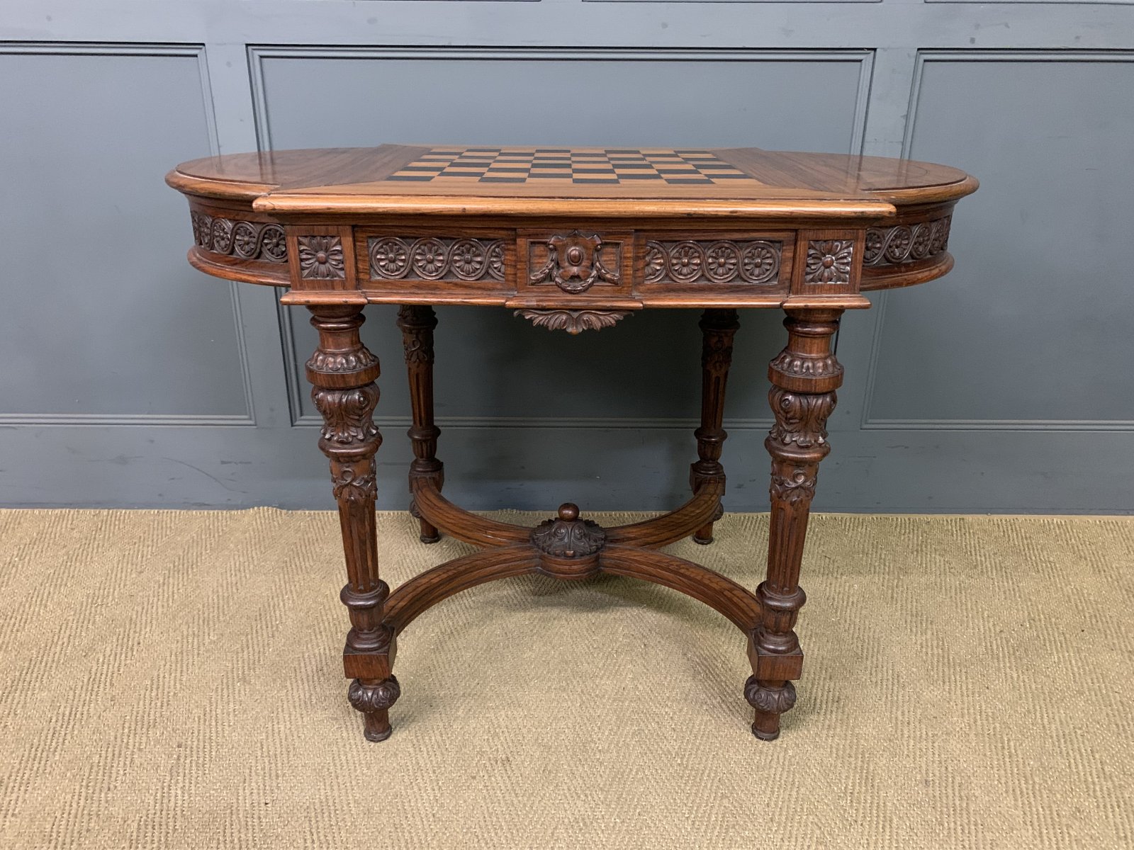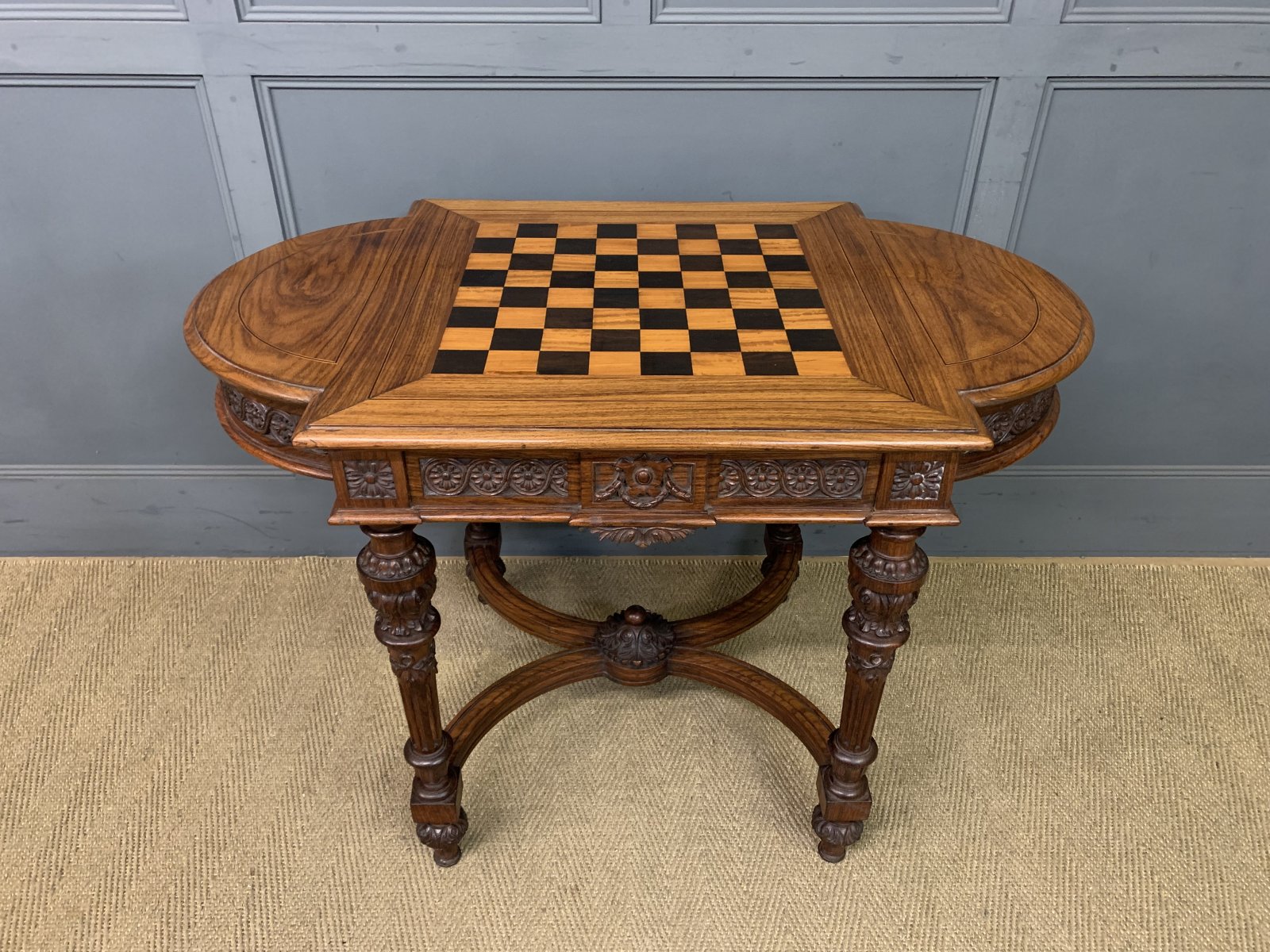 eneers. The shaped top is inset with a chess board with squares in satinwood and ebony. The top is further decorated with inlay again in satinwood and ebony. The base is decorated with crisply carved detailings throughout. Standing on turned tapering legs which are united by an x-frame under-stretcher. With a single drawer to the freeze and finished to the rear. Sympathetically refinished in our workshops to a very high standard and now offered for sale in excellent condition with a good colour and patina.