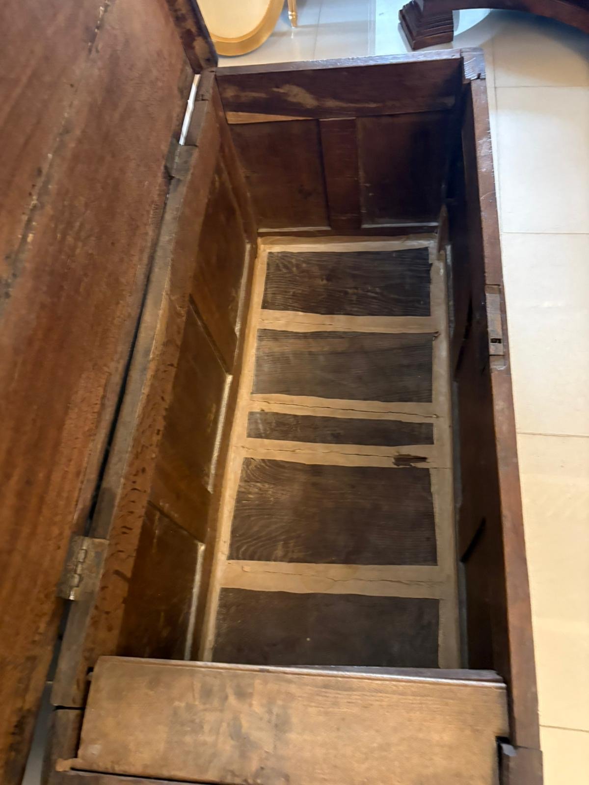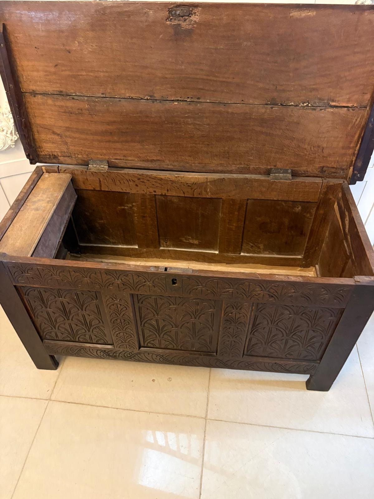 The original candle box is a particularly desirable survival. Positioned internally, it was designed to safely store candles, tinder and small personal items away from the main contents of the chest. In a time before electric lighting, candles were valuable everyday essentials, and keeping them dry, protected and easily accessible was important. The presence of the candle box adds authenticity and gives a direct insight into how the piece would have been used.