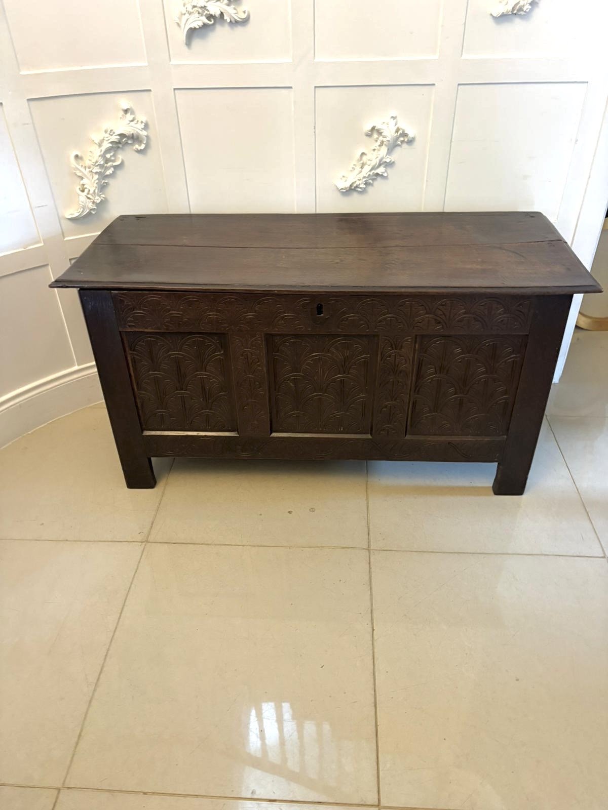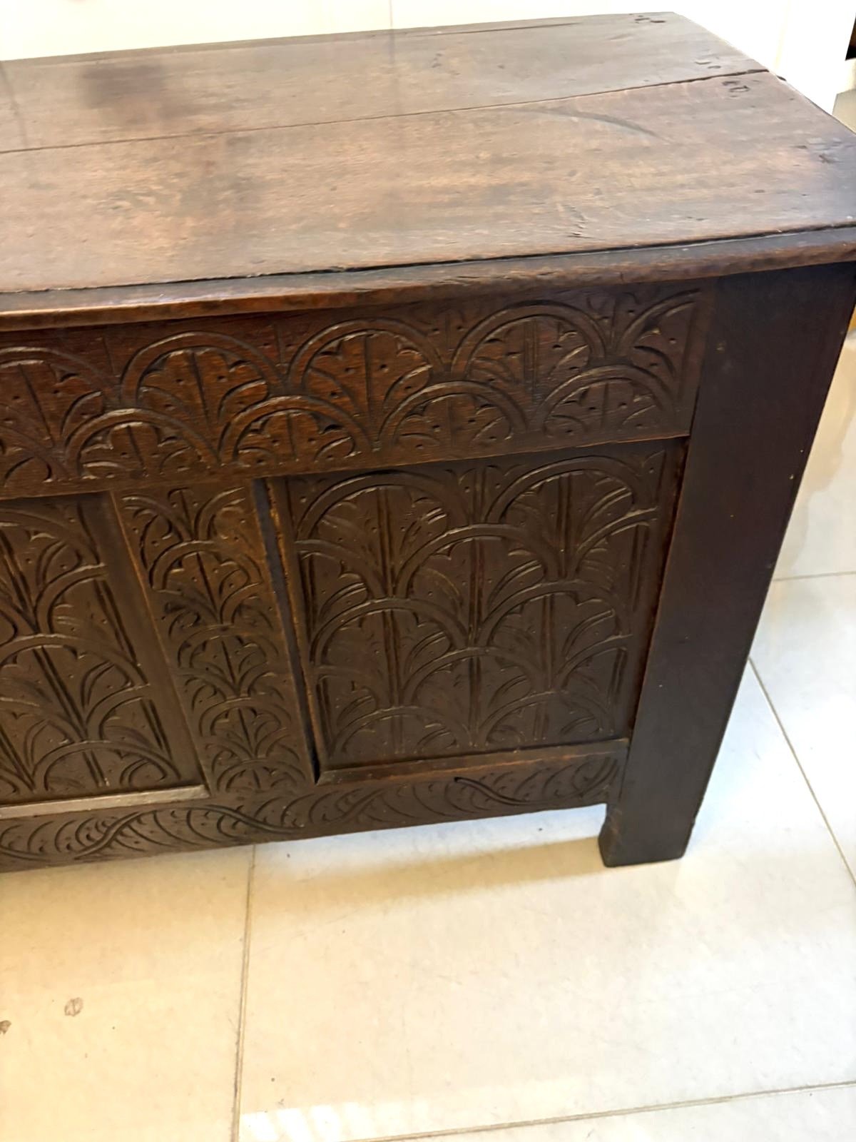 See shipping detailsA superb antique oak coffer of excellent colour and presence, the front beautifully carved with repeating stylised foliate panels, framed by simple upright stiles and raised on solid end supports. The hinged plank top opens to a generous interior, retaining its original candle box to one side.
