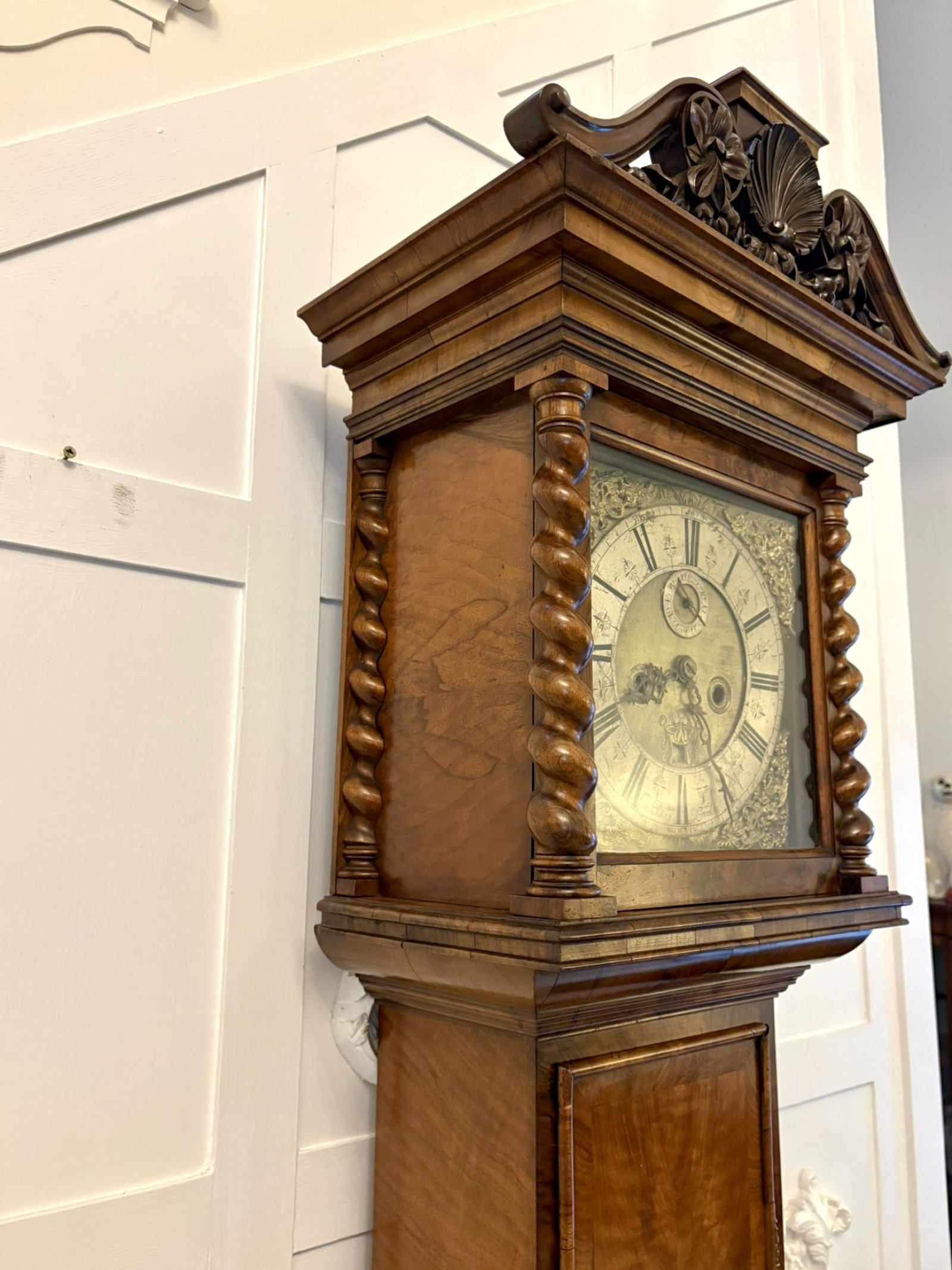 The clock is housed in a later burr walnut case constructed in the first half of the 19th century, and clearly made to accommodate an earlier square-dial movement. The case is of good quality, veneered in richly figured burr walnut with attractive book-matched panels. The hood is flanked by barley-twist columns and surmounted by a broken-arch pediment with a carved central shell and foliate detailing. The long trunk door and shaped base are well proportioned creating a visually balanced and impressive overall presence.