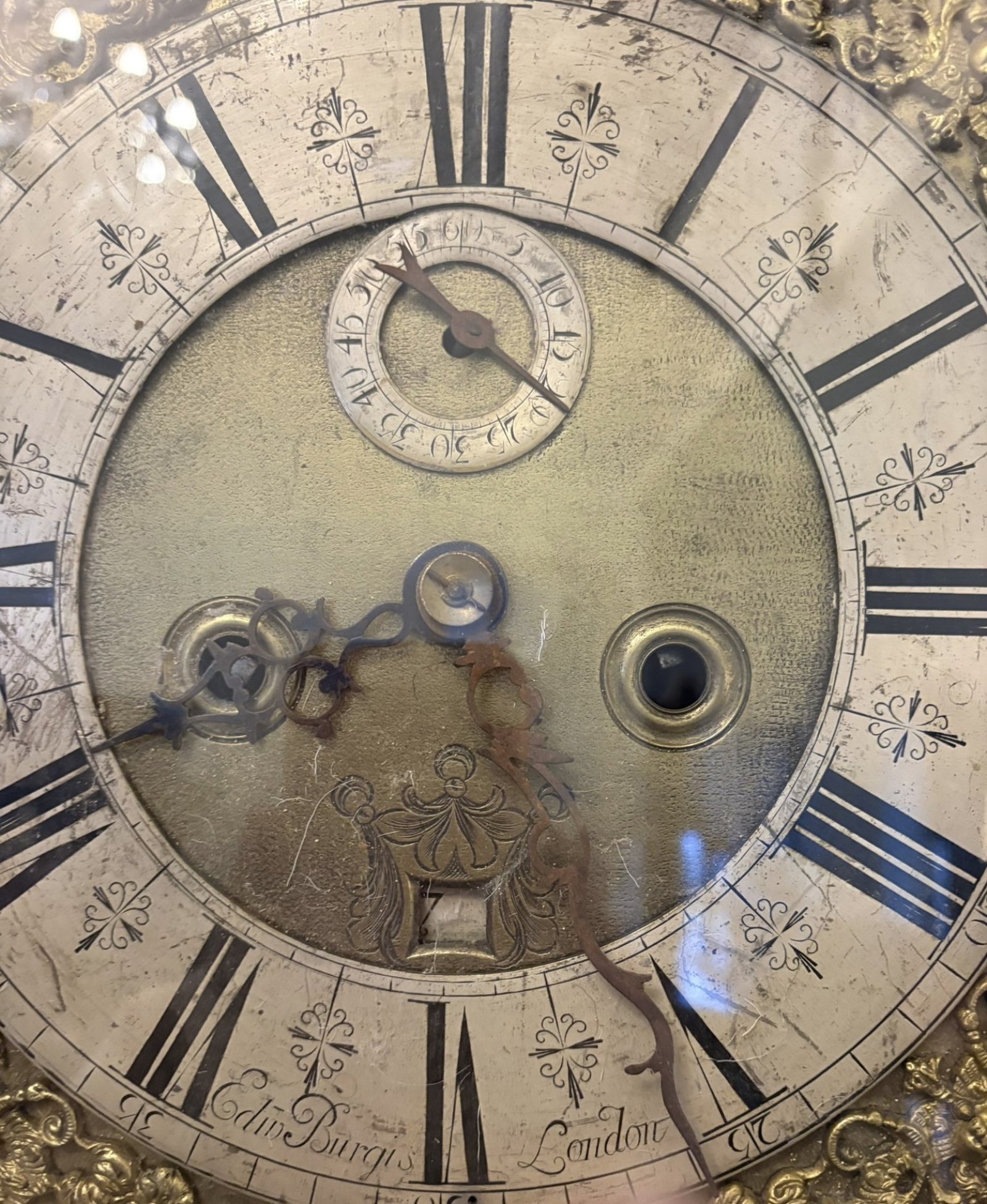 A fine and imposing English longcase clock housing an early 8-day brass movement signed by Edin Burgis, London. The square brass dial is richly detailed with a silvered chapter ring engraved with Roman numerals and minute markers enclosing a finely matted centre. The upper section is fitted with a subsidiary seconds dial, while the lower centre incorporates a calendar aperture, a feature associated with higher-quality London work of the late 17th century.