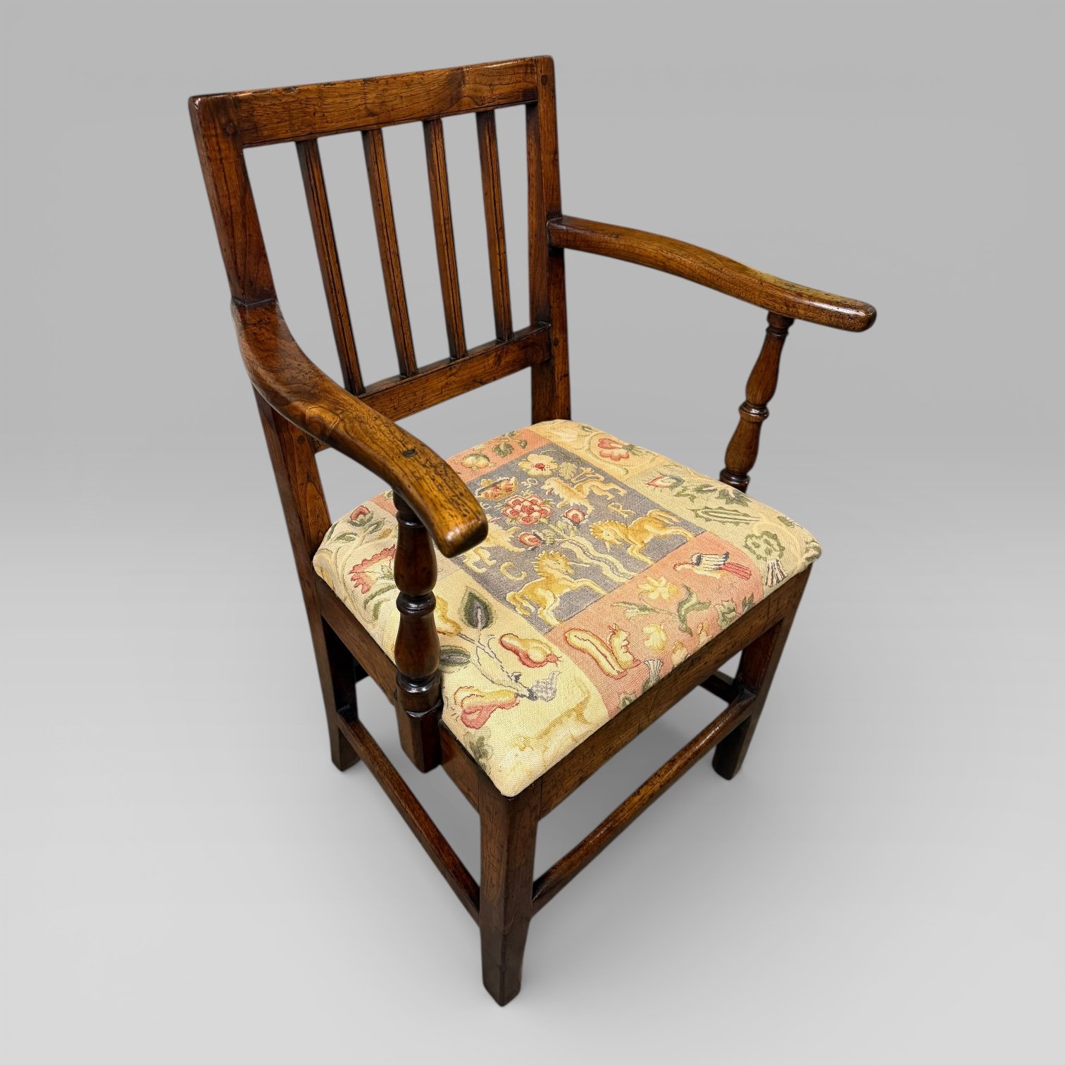 The chair has straight legs joined by stretchers, with turned supports to the shaped arms, providing strength and comfort. Made from walnut, it is a well-proportioned example of an 18th century country carver, suitable for use as a desk chair, hall chair, or occasional seating.