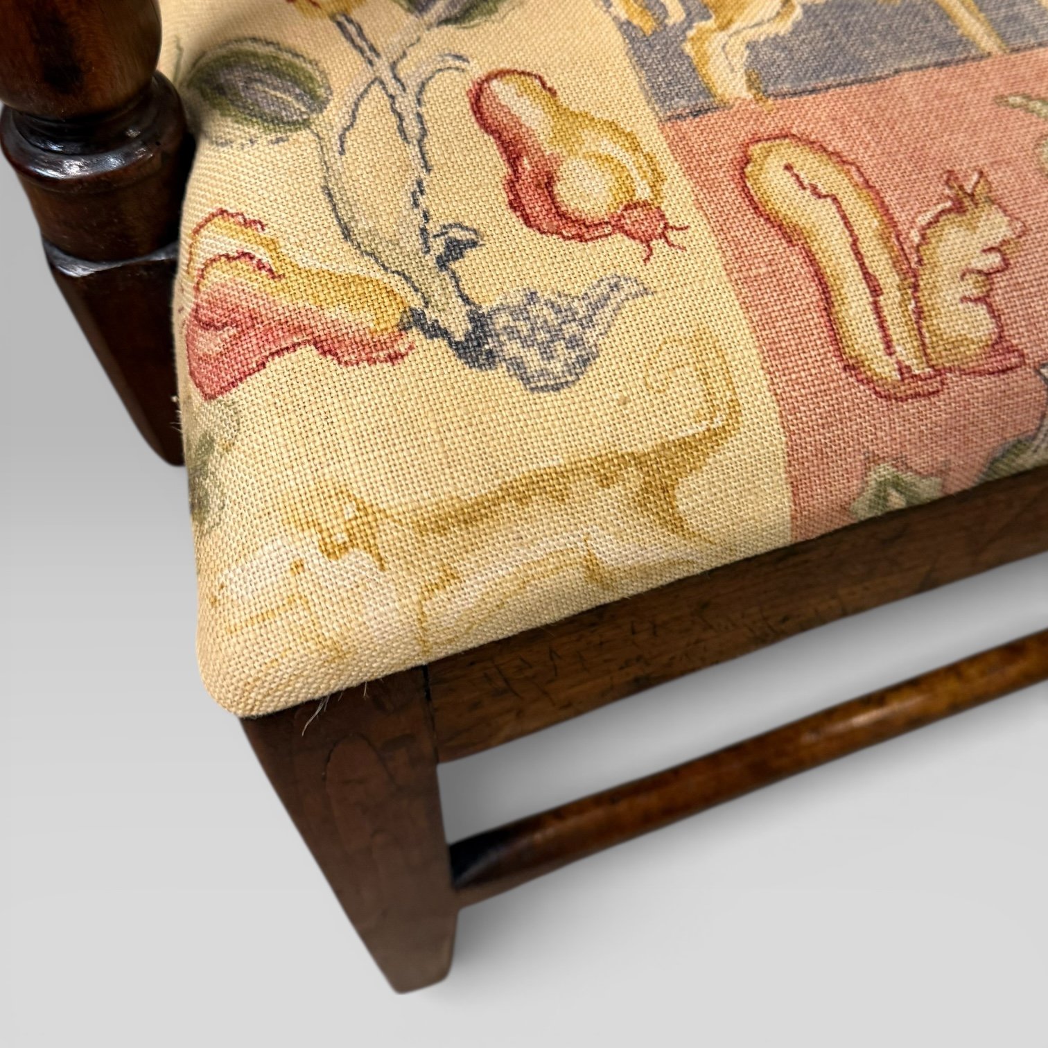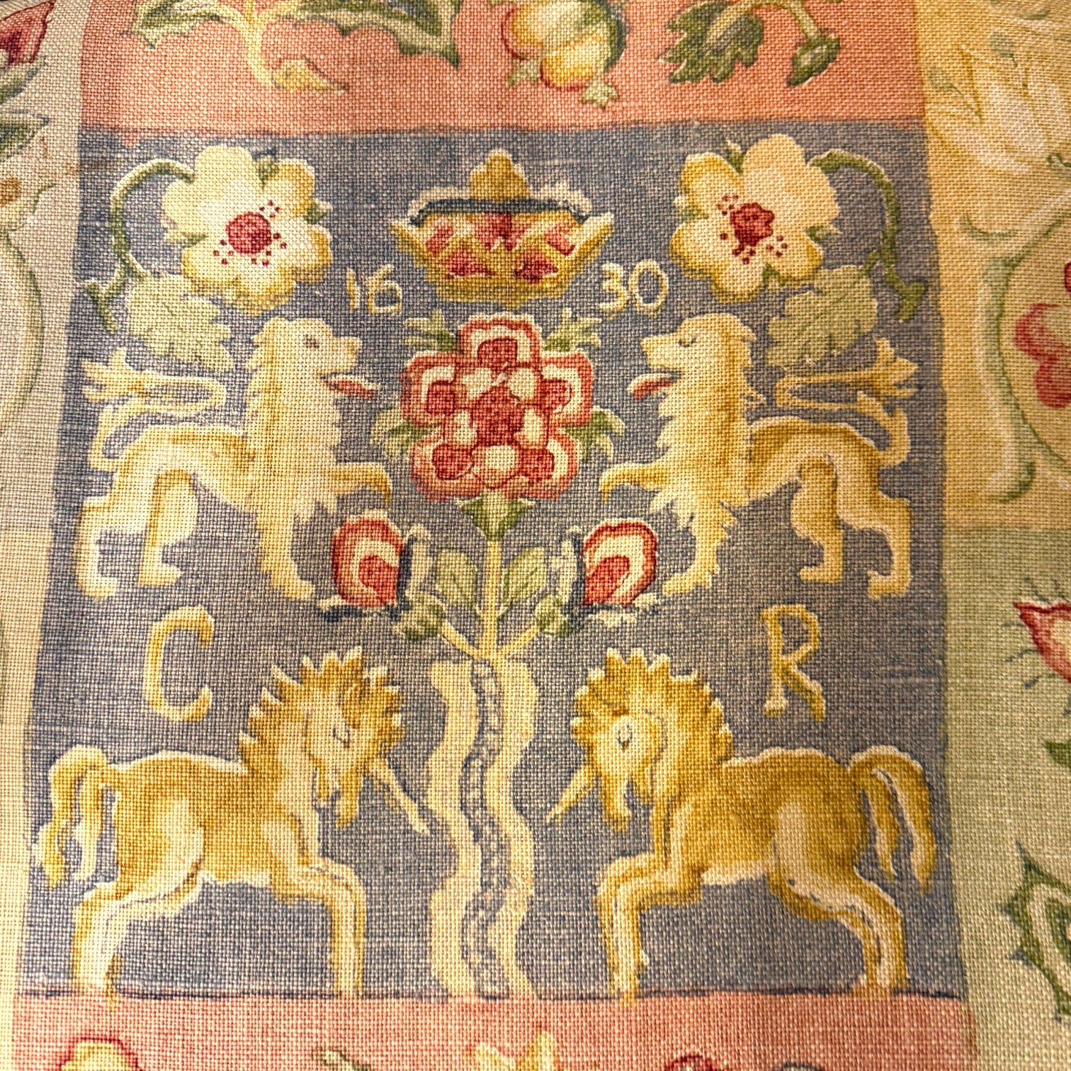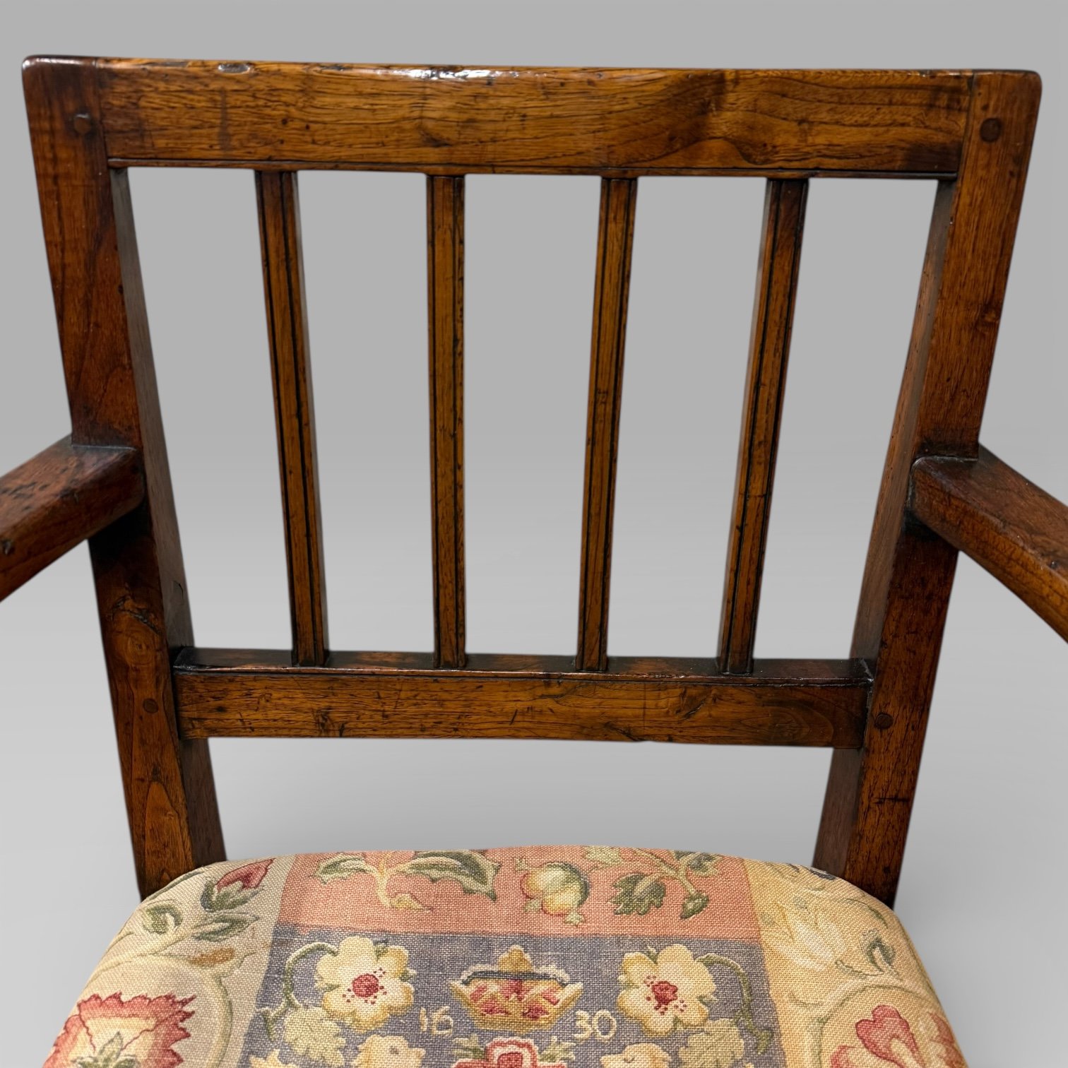 An antique 18th century country farmhouse walnut carver chair, fitted with a loose seat cushion decorated with royal and heraldic motifs. The cushion features the royal cipher of King Charles I (reigned 1625–1649), the date 1630, and traditional heraldic imagery including lions, unicorns, and Tudor roses. The decoration reflects English heraldic design, used here in a decorative context.