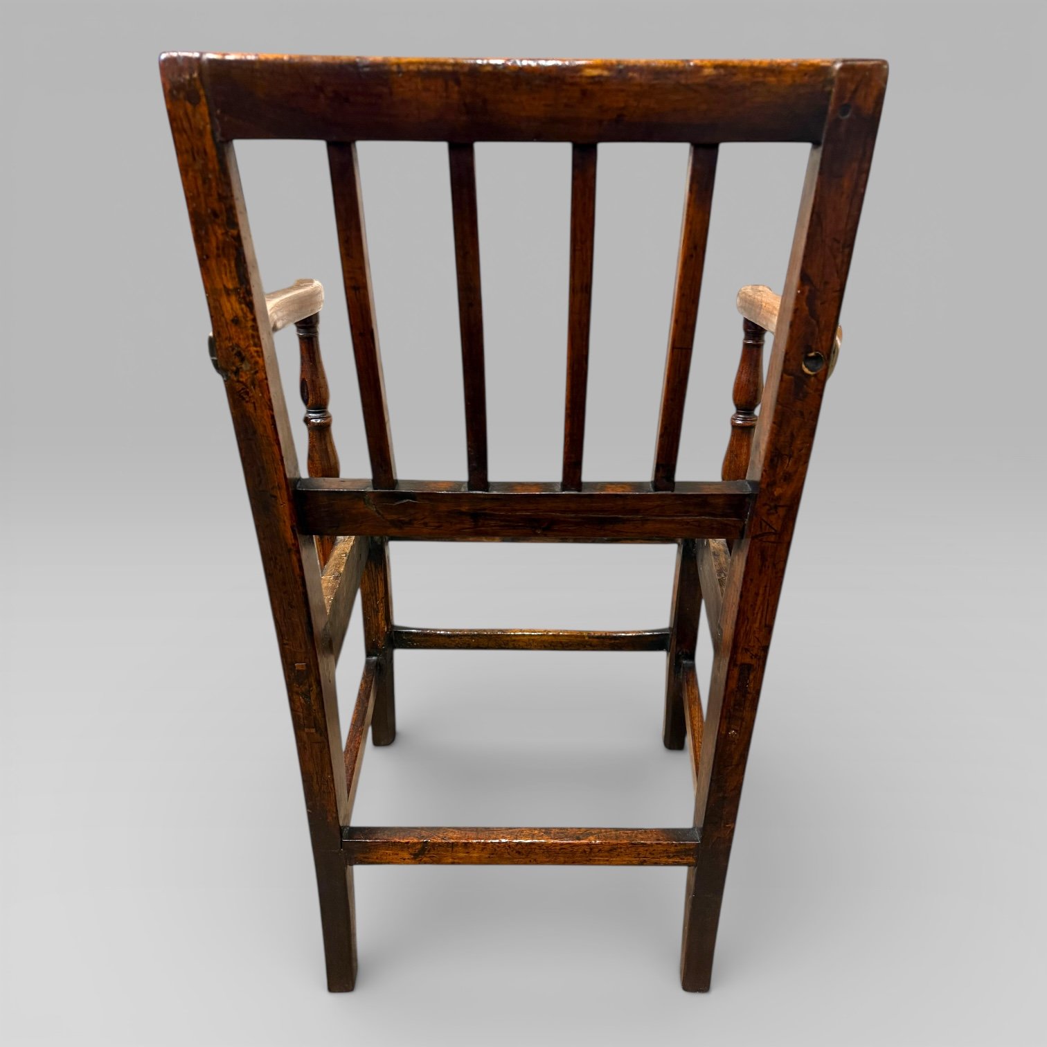 When the seat cushion is removed, the chair displays a notable construction feature, with no rear seat rail supporting the cushion. Instead, the seat rests on the front and side rails, giving the chair an unusual and distinctive form of construction that is less commonly seen on country chairs of this type.