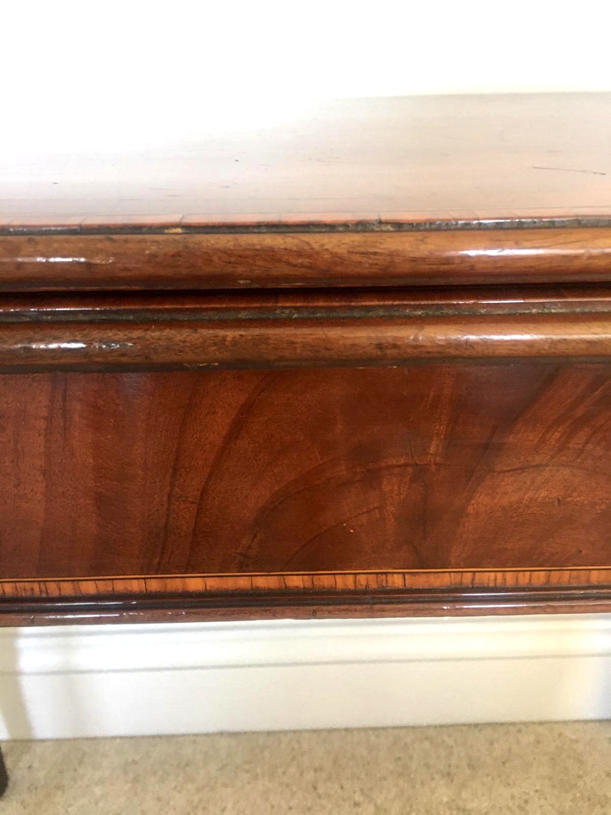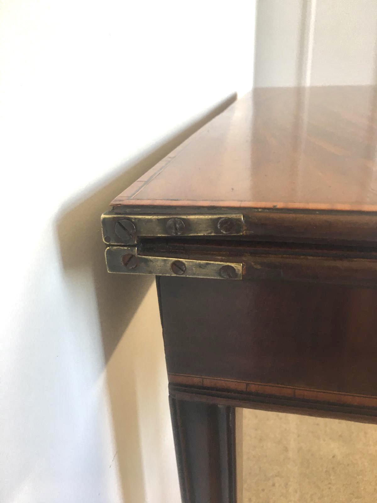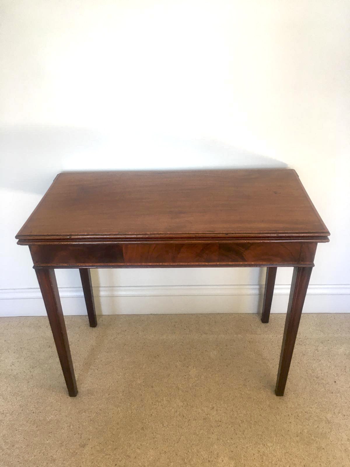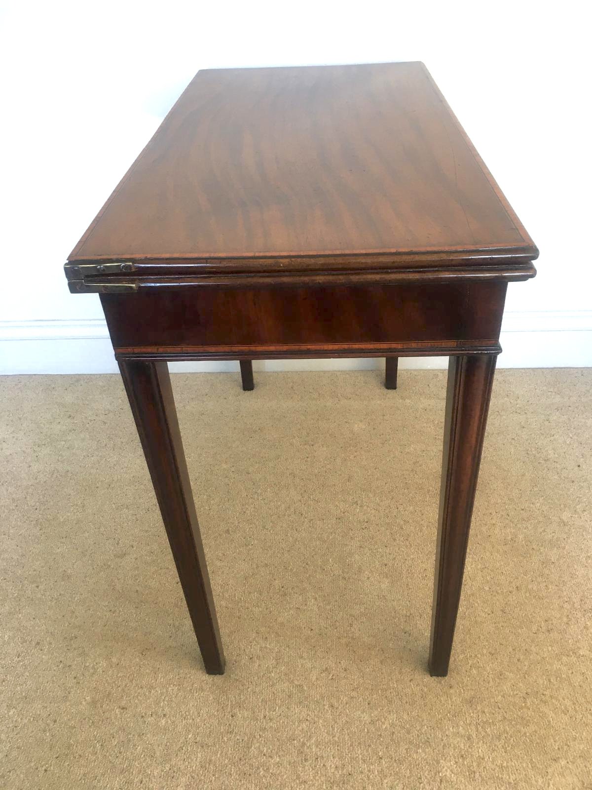 Antique 18th century George III mahogany inlaid tea/side table having a quality mahogany lift up top crossbanded in satinwood which opens to reveal a polished figured mahogany inside crossbanded in satinwood, mahogany frieze also crossbanded in satinwood and supported by square tapering reeded shaped legs, the back two legs swing open to support the top.