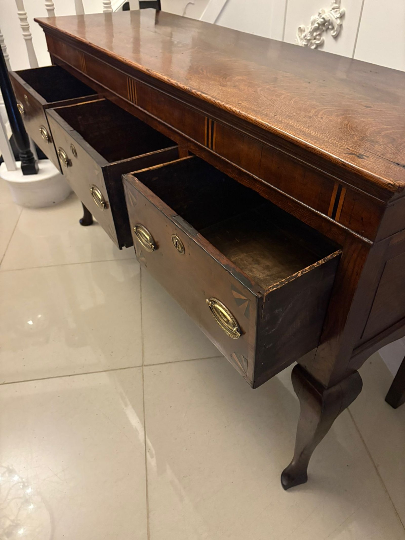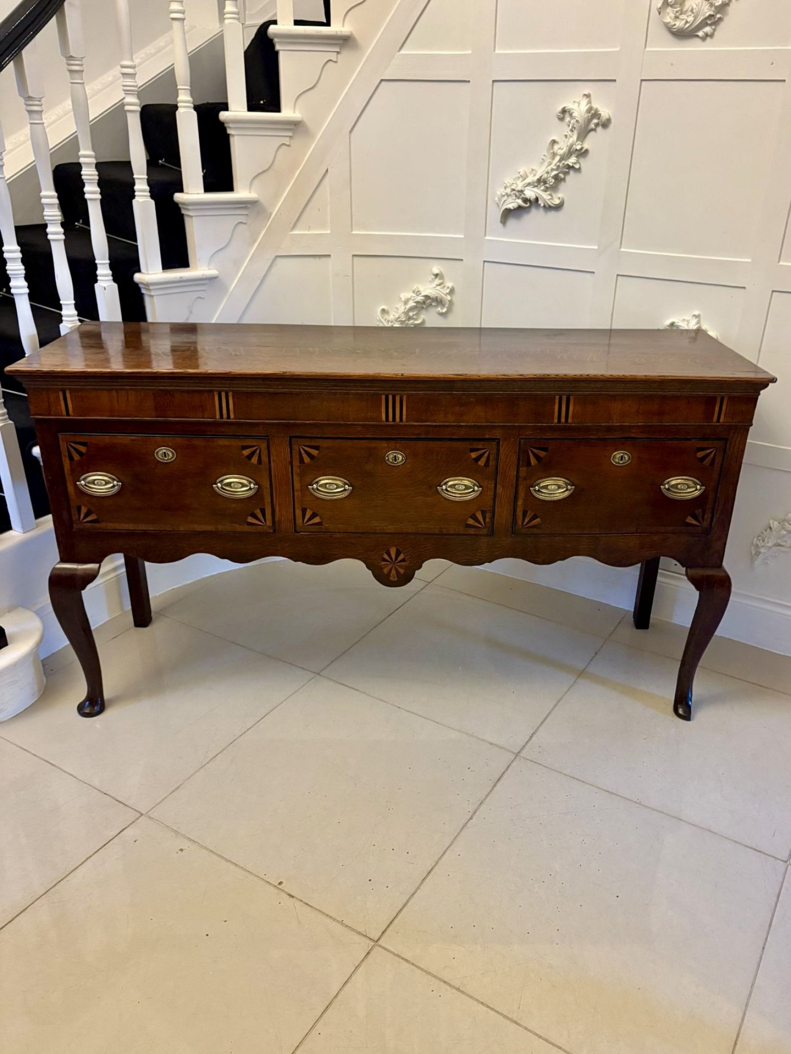 Standing on refined cabriole legs to the front and square supports to the rear, the dresser base has a graceful, balanced profile. The shaped apron with its central inlaid patera provides an attractive decorative flourish without overwhelming the clean Georgian lines.