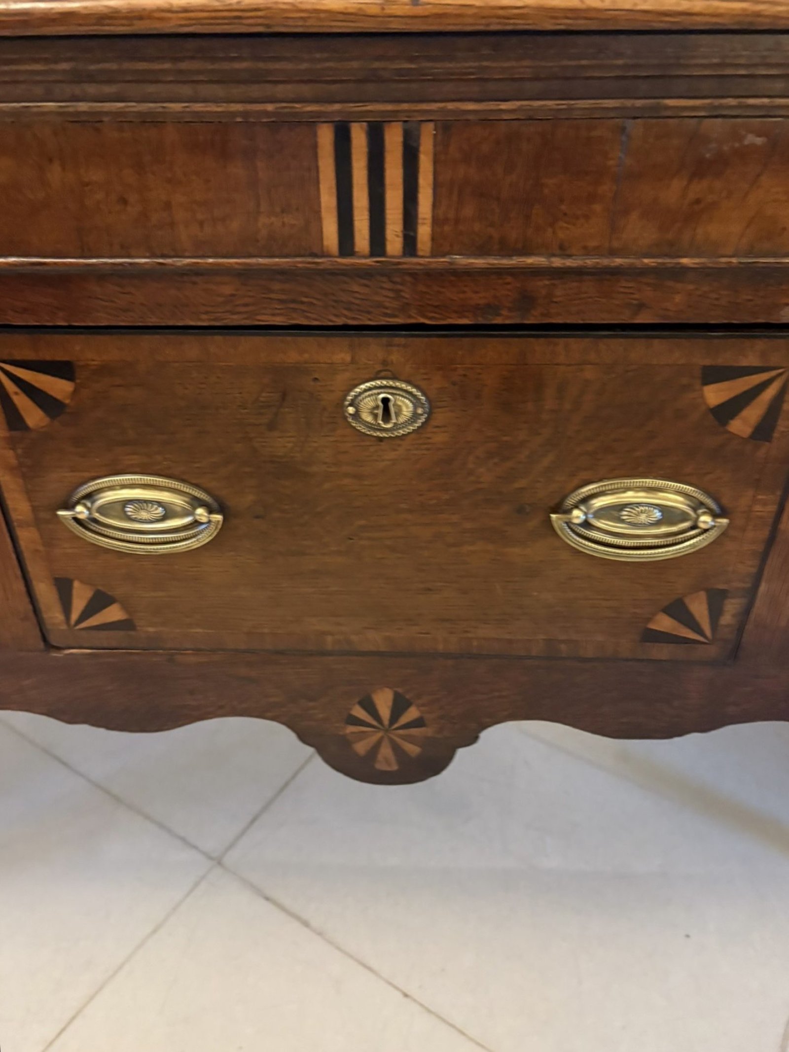 A handsome 18th Century George III oak and mahogany dresser base of long, elegant proportions. The piece is arranged with three full-length drawers across the frieze, each decorated with striking fan-shaped inlay and fitted with original oval brass plate handles. The beautifully figured oak top displays natural grain movement and depth, adding warmth and character.
