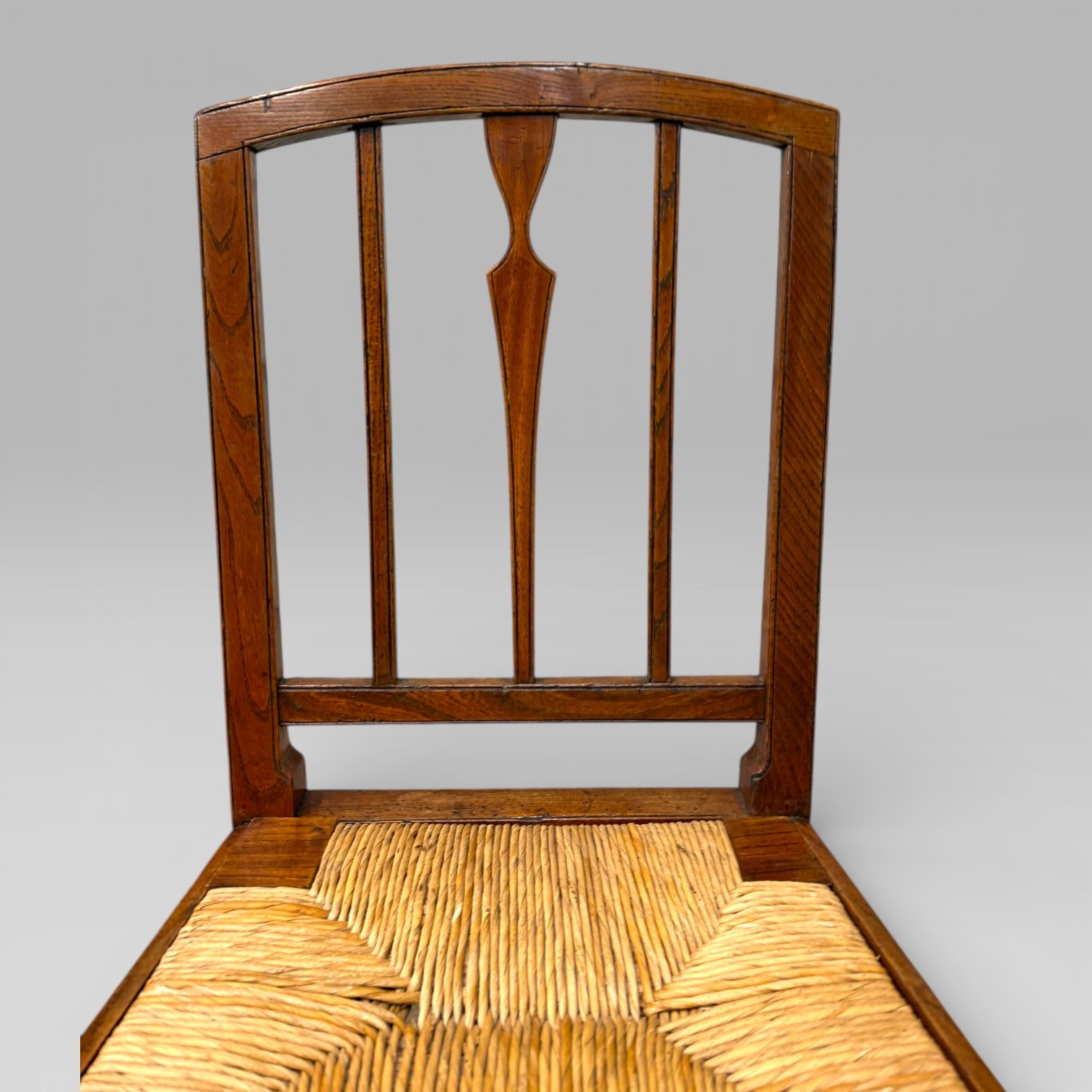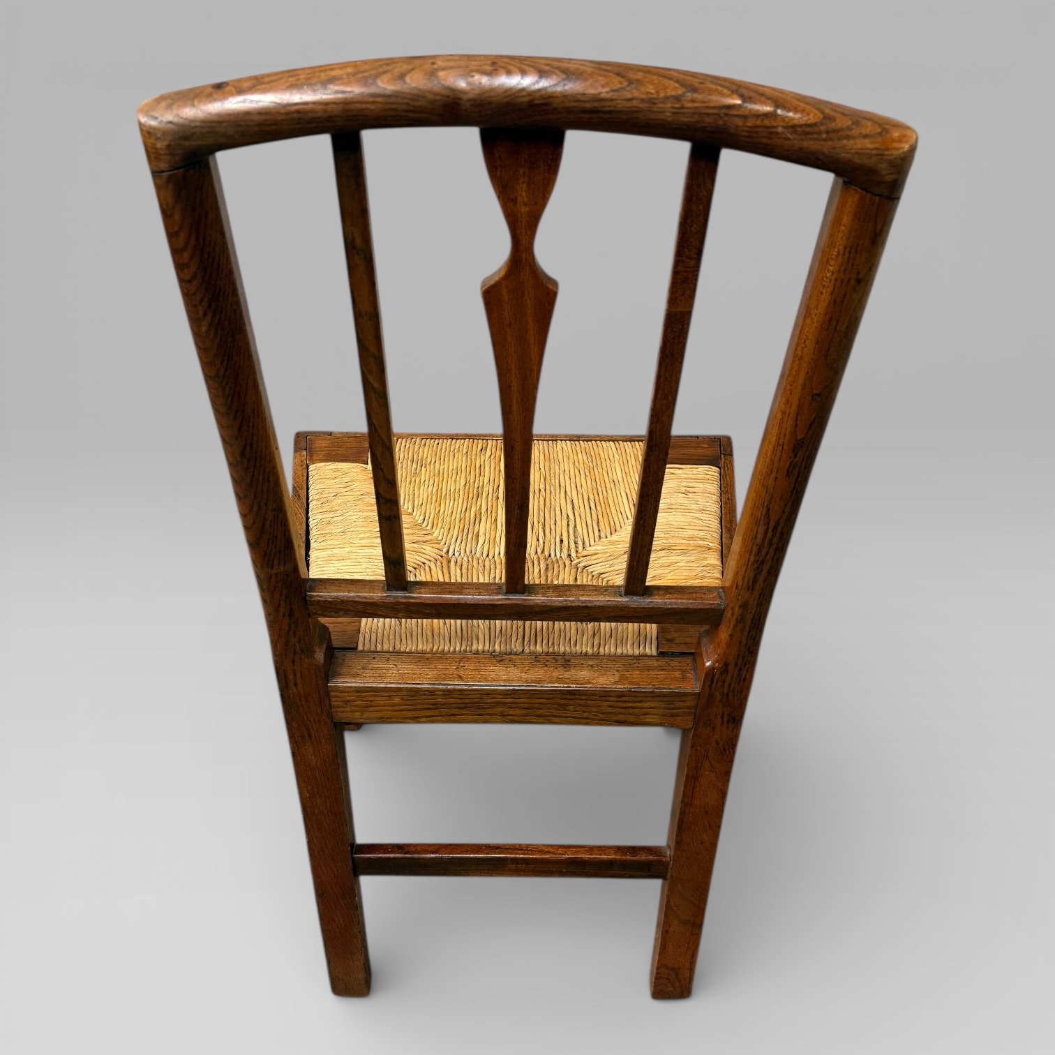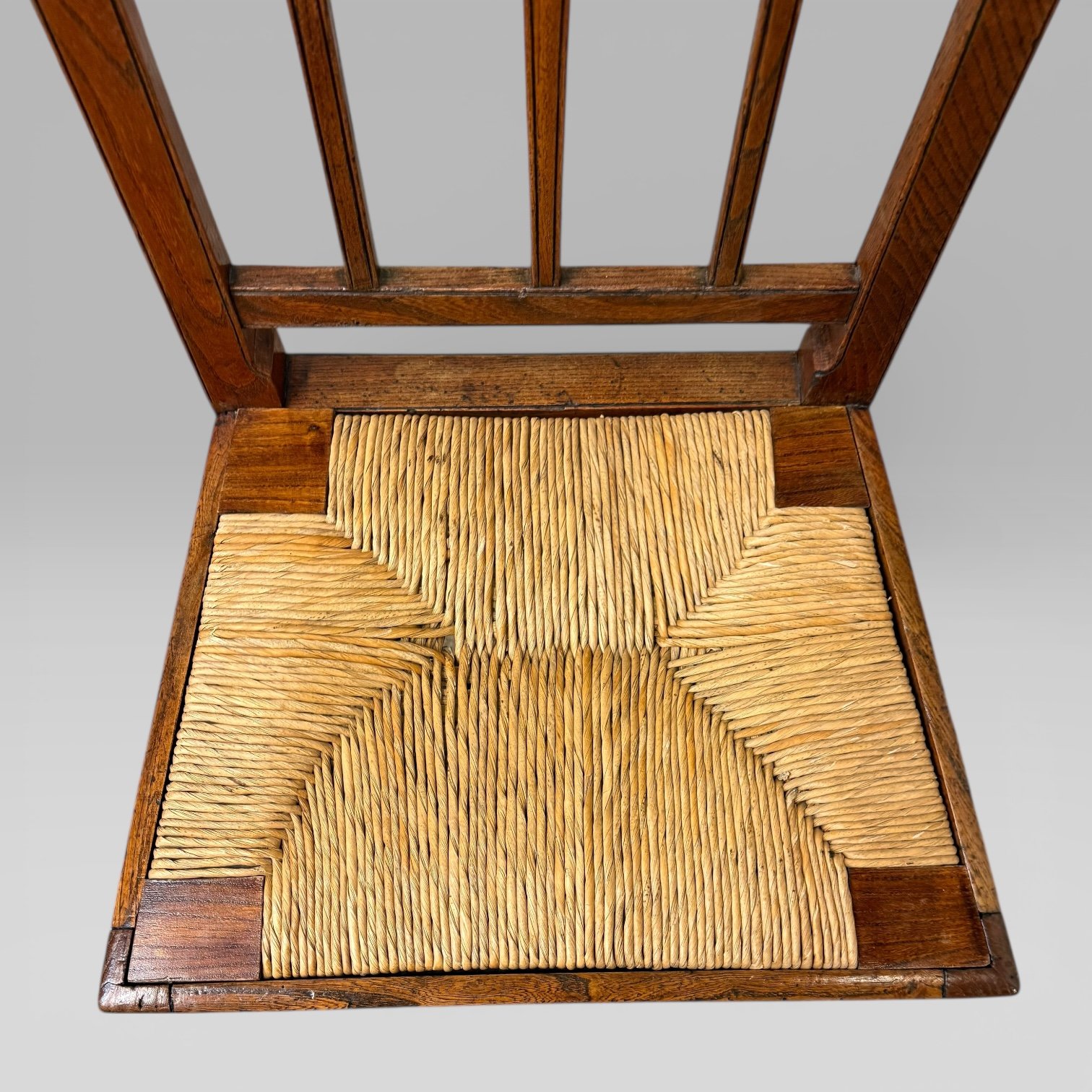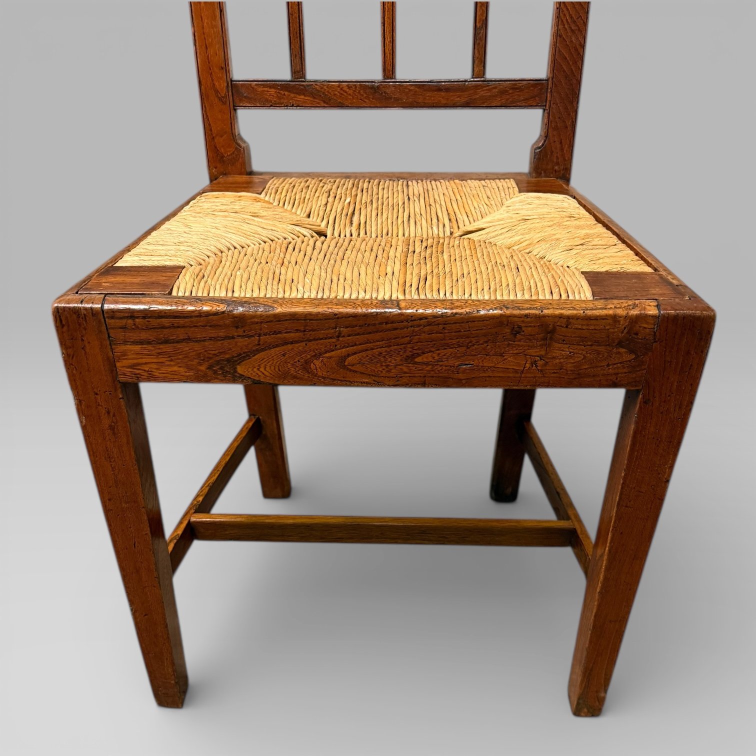 An antique 19th century elm country farmhouse single chair, fitted with a rush seat. The chair shows signs of old woodworm, which has been treated, and it remains structurally sound. The rush seat lifts out, allowing for easy access and maintenance.