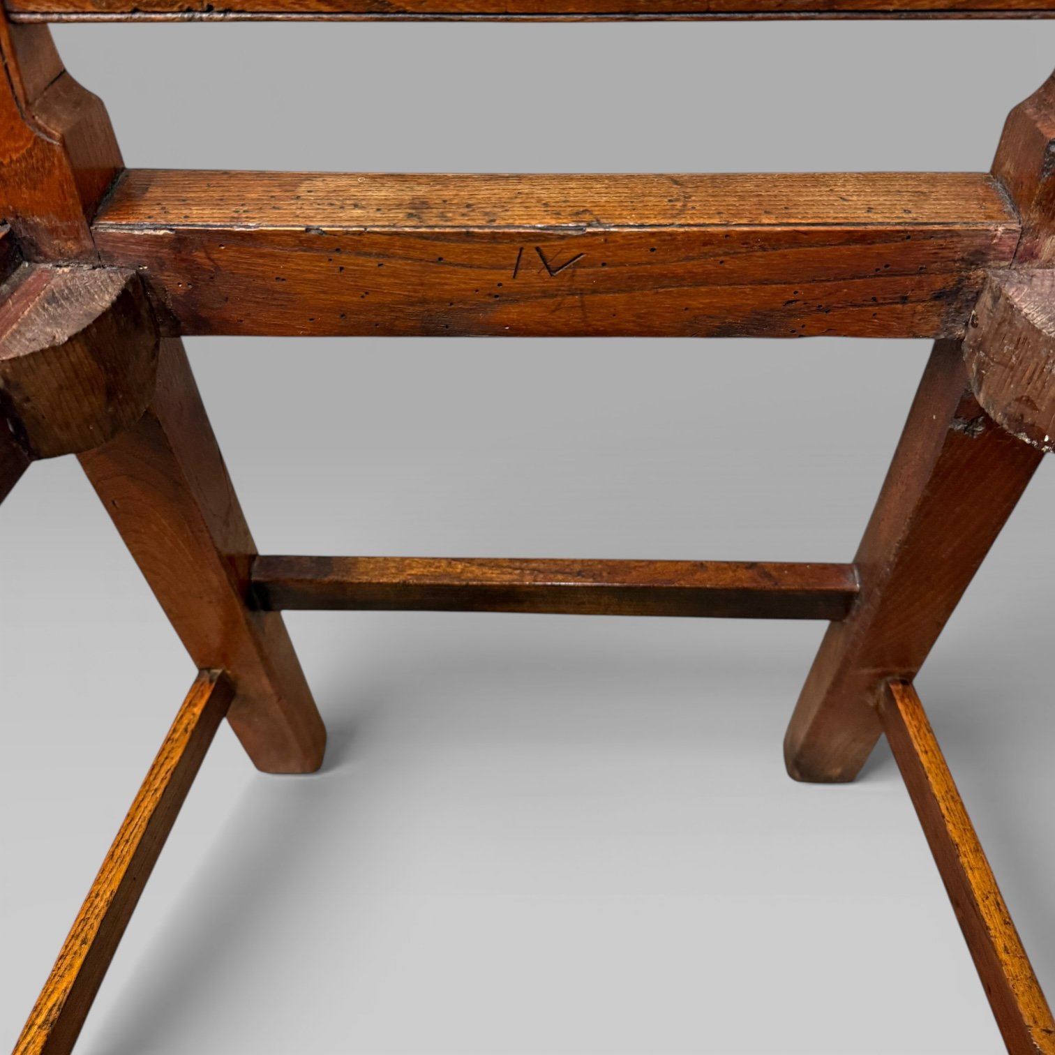 The chair stands on straight legs joined by stretchers, with straight back splats and a very slight arched top rail. A simple and honest example of traditional country seating, well suited to a kitchen, hallway, or farmhouse interior.